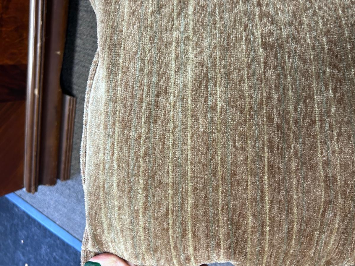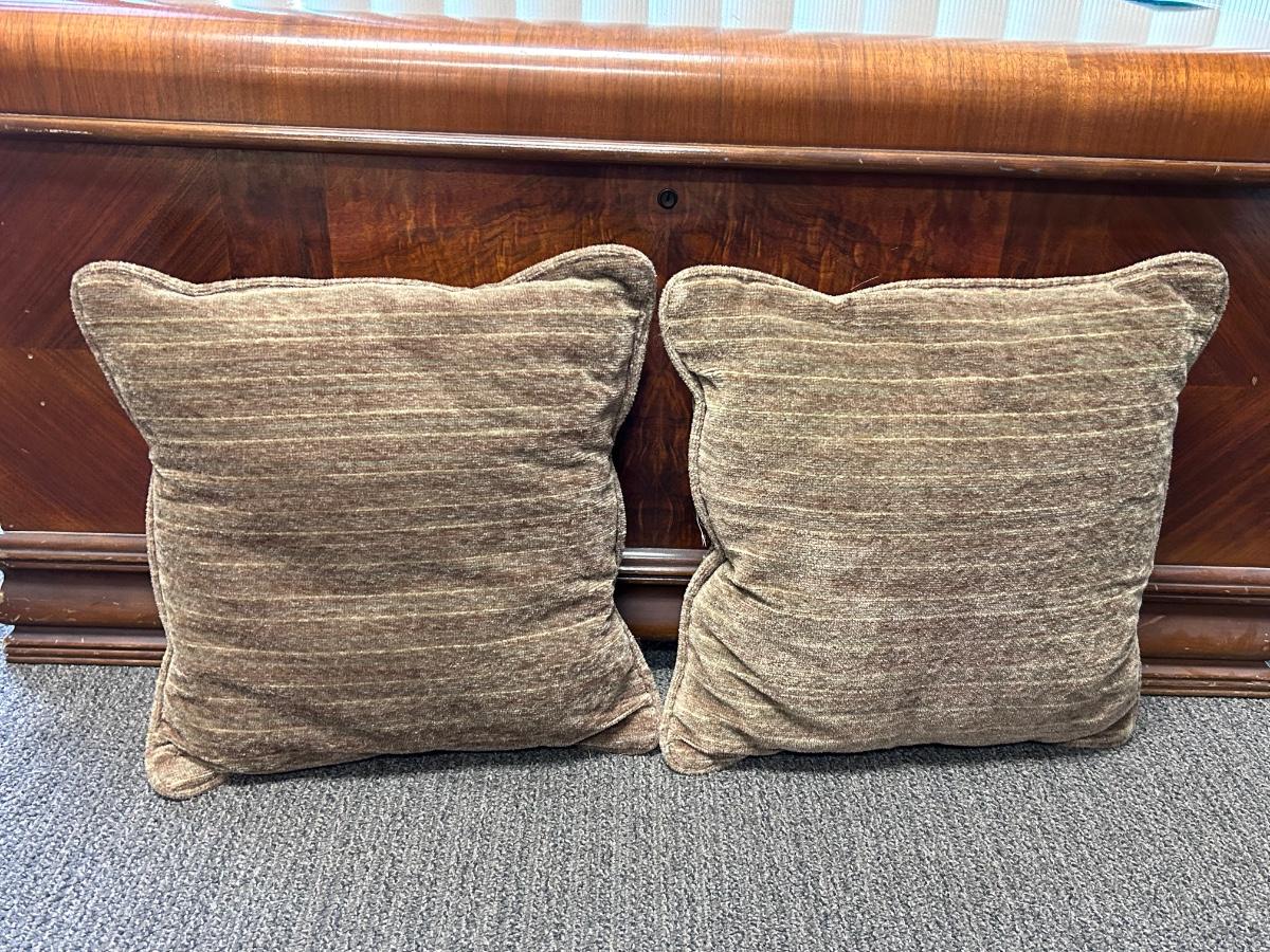 Pair of Tan Beige with Faint Blue Striping Accent Throw Pillows. In good condition.