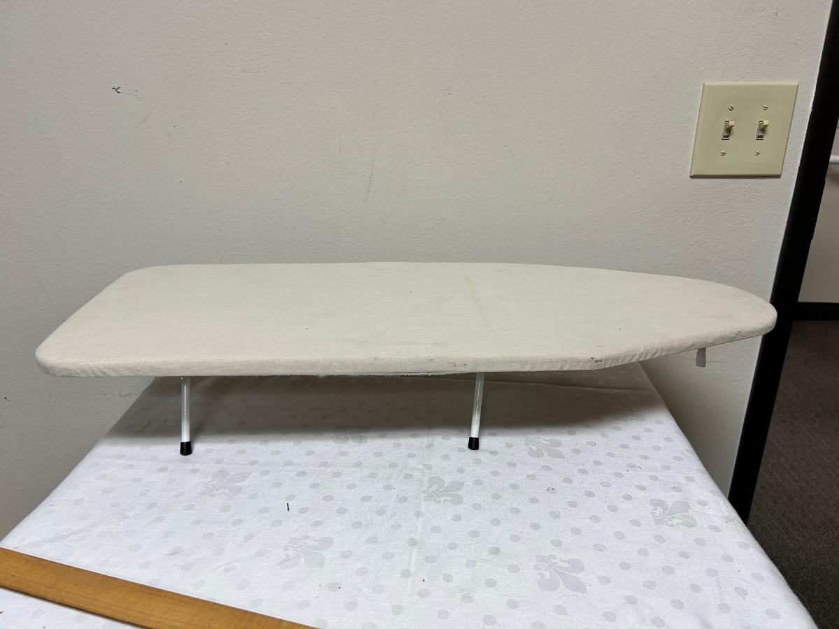 Counter Sitting Small Compact Ironing Board with Folding Legs. Under 3' length. In good used condition.