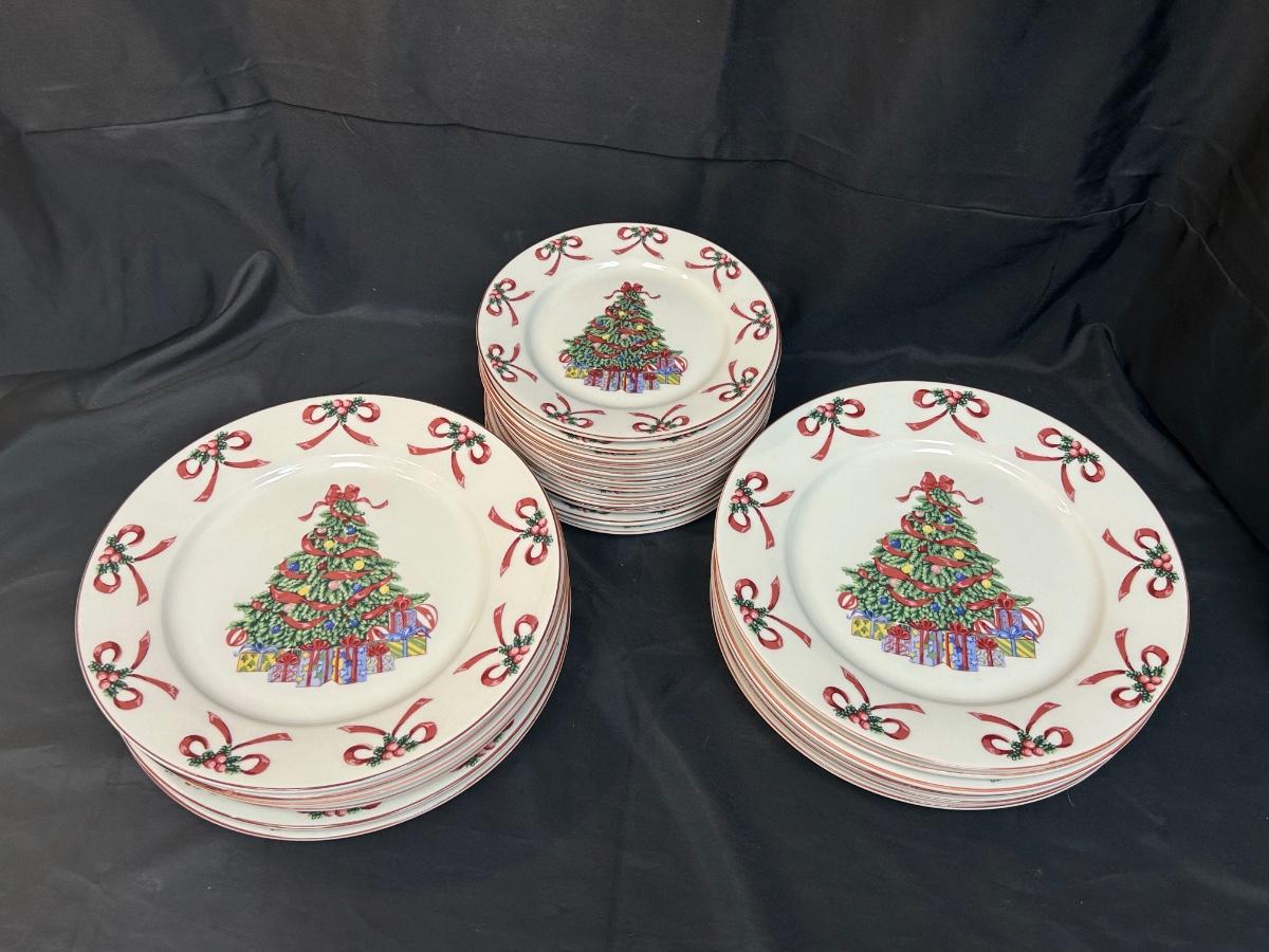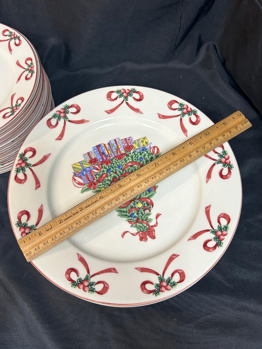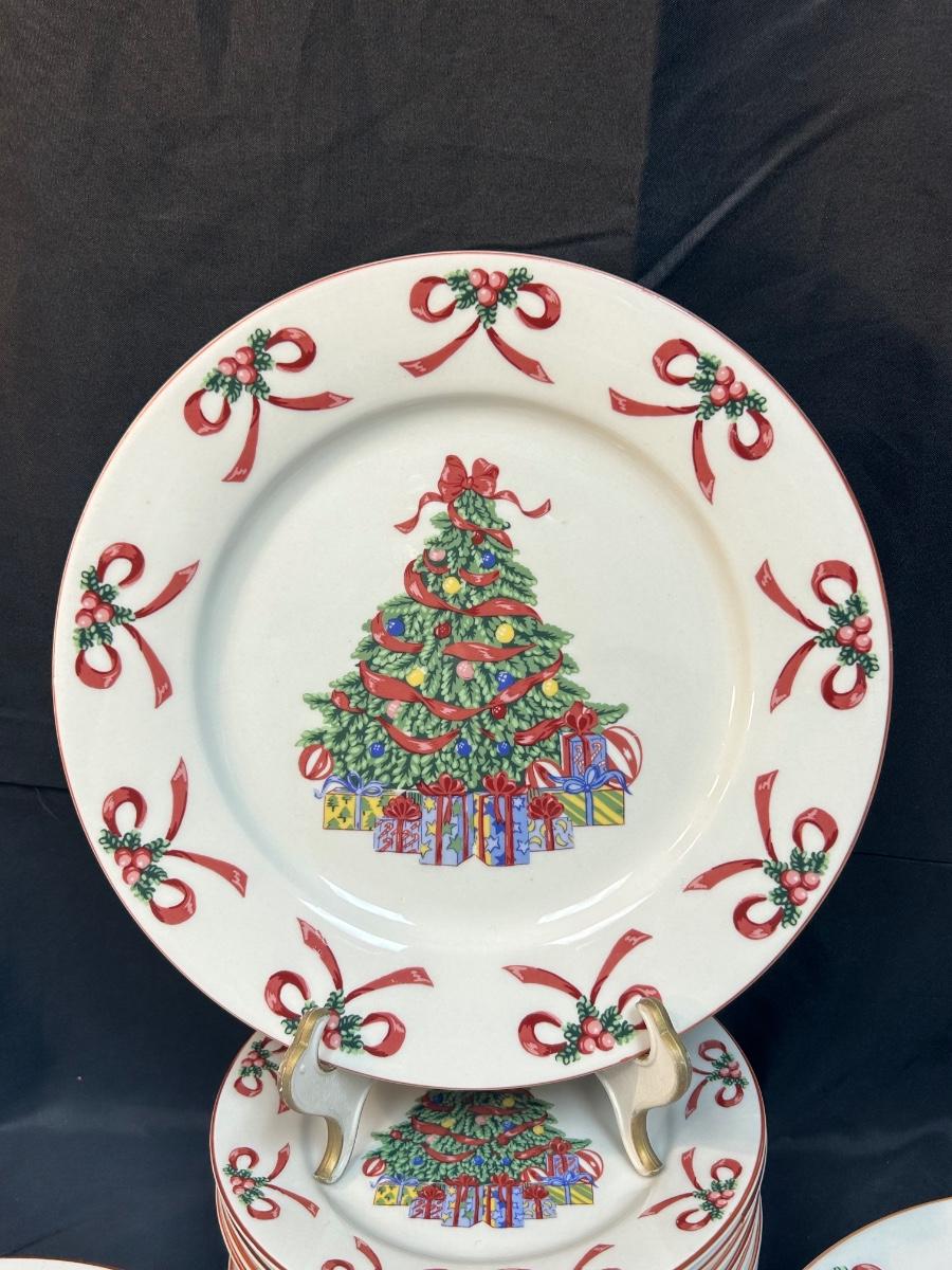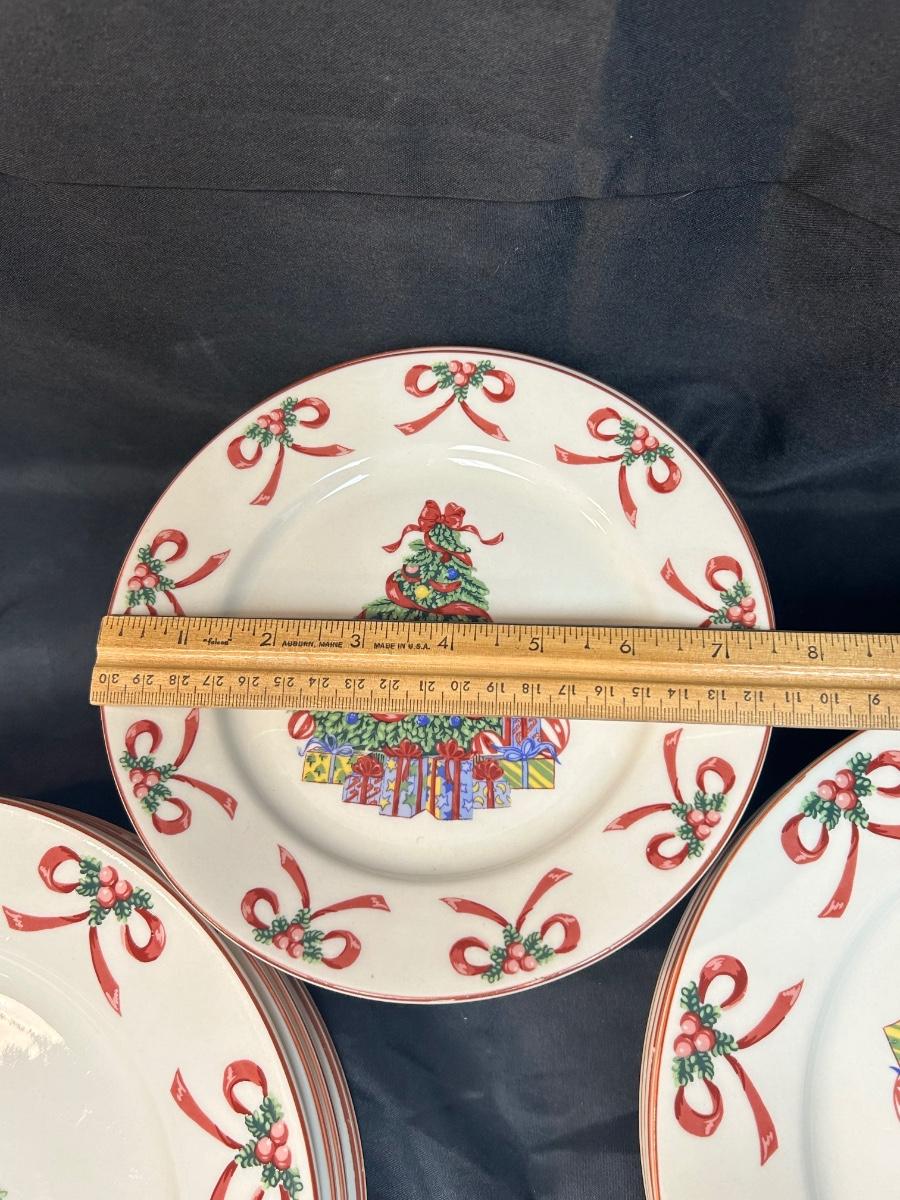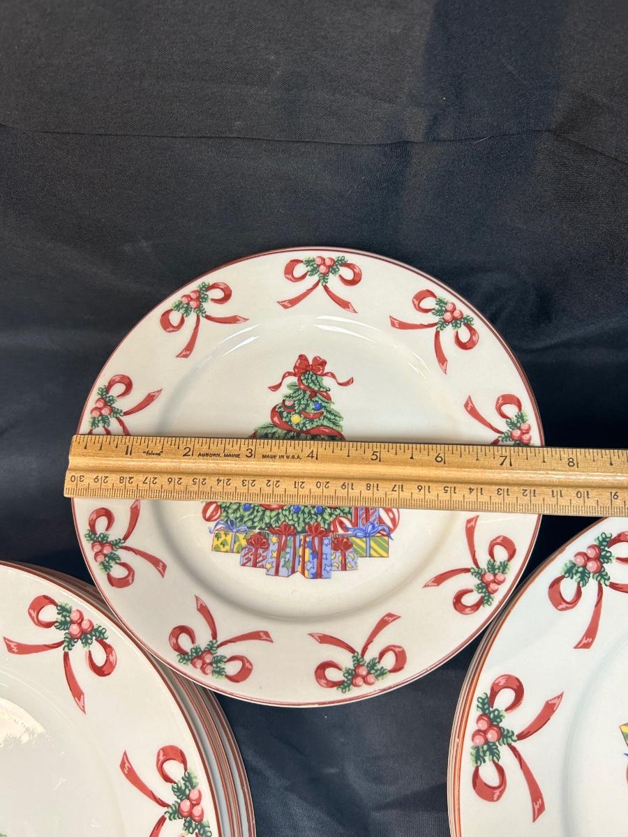 Unbranded Set of Christmas Holiday Dessert & Dinner Sized Plates Bows and Tree Pattern