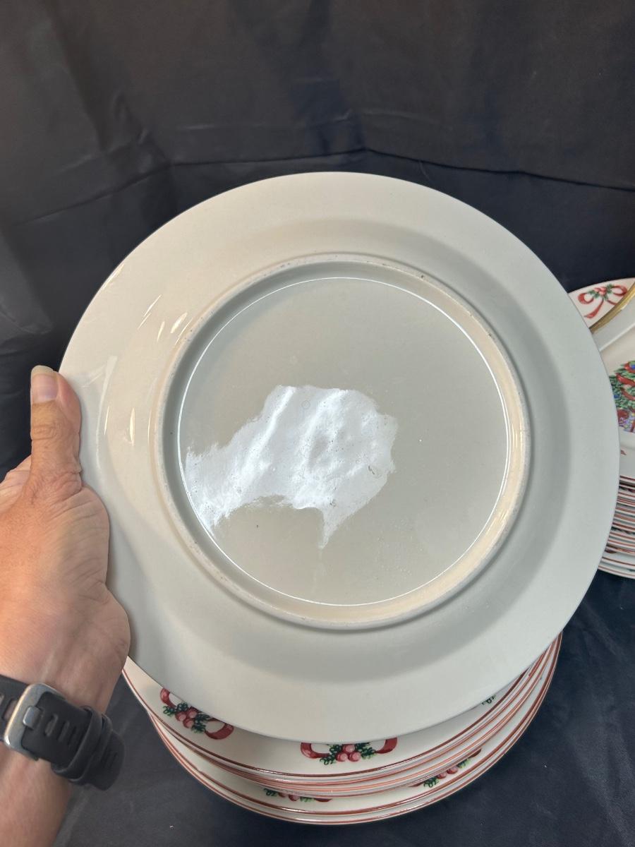 Unbranded Set of Christmas Holiday Dessert & Dinner Sized Plates Bows and Tree Pattern. In previously used condition, no chips but light wear.