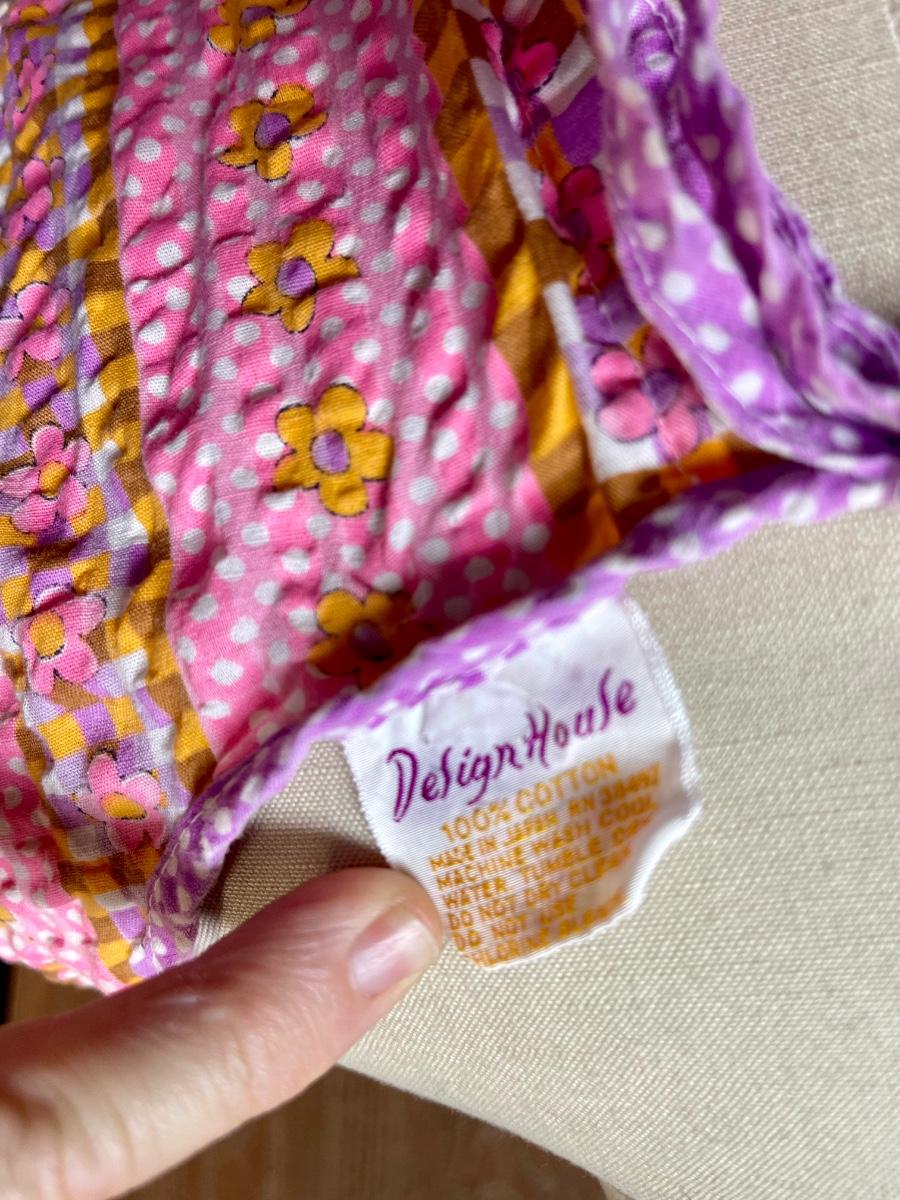 100% cotton by Design House. No size indicated, but is a wrap-around style so is easily adjusted to fit. See photos for colors, trim details, etc.