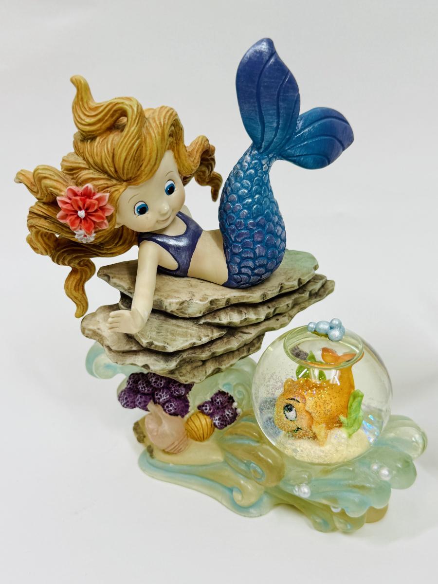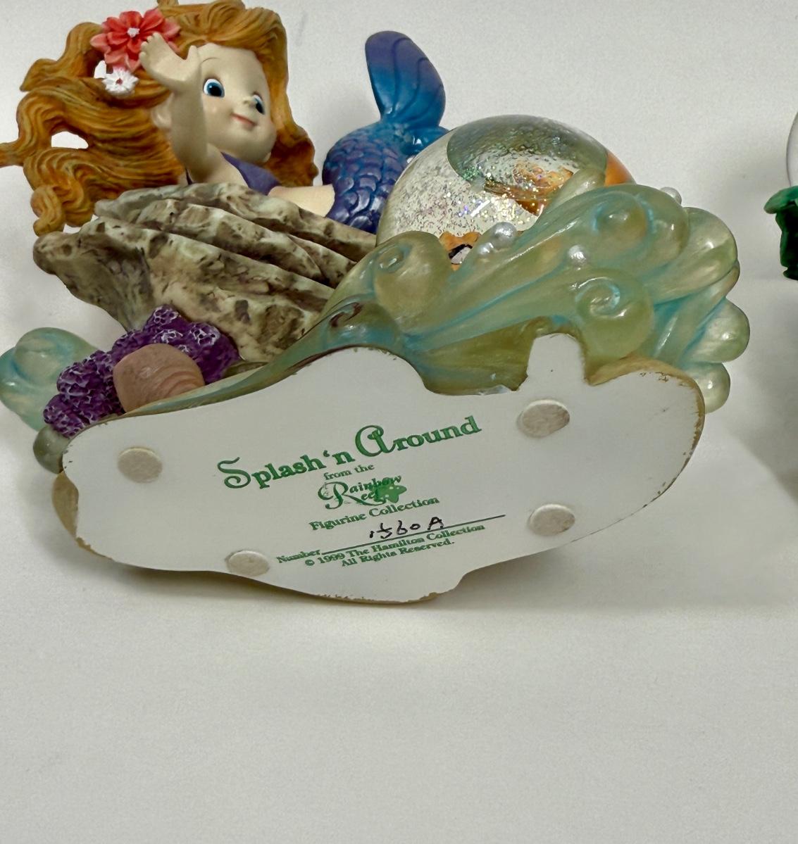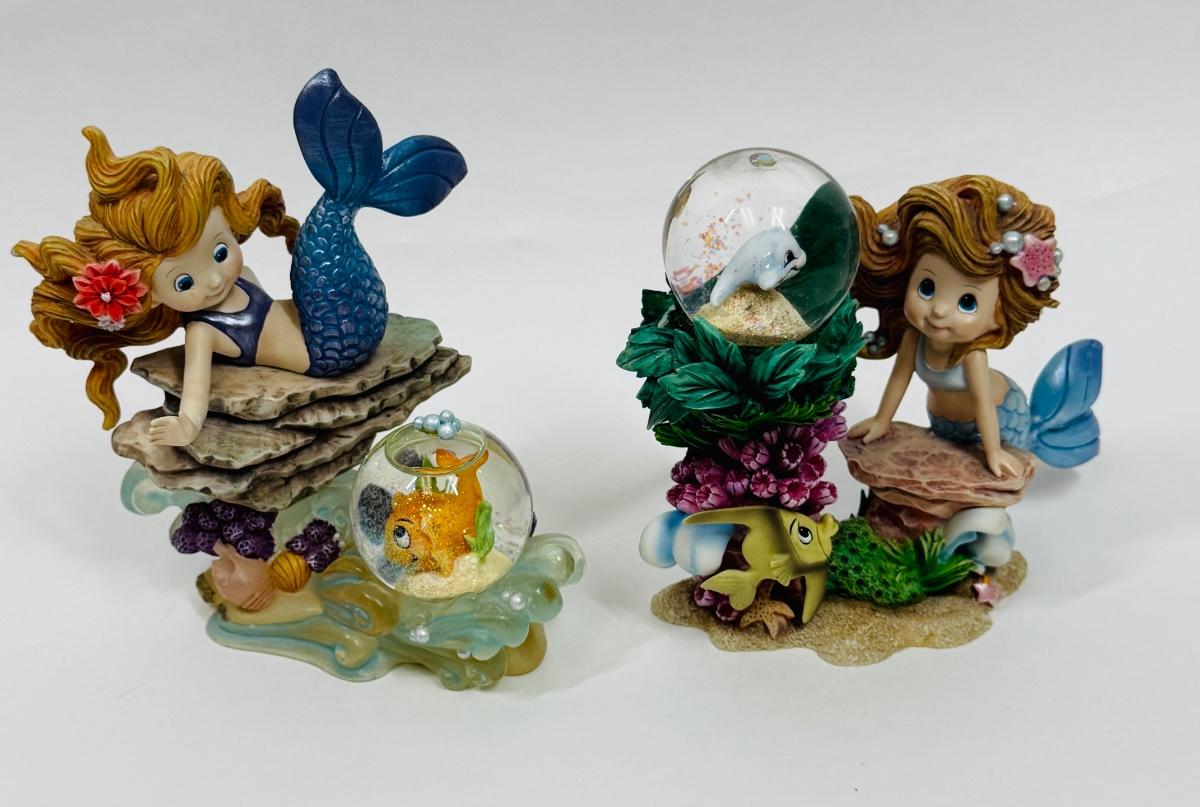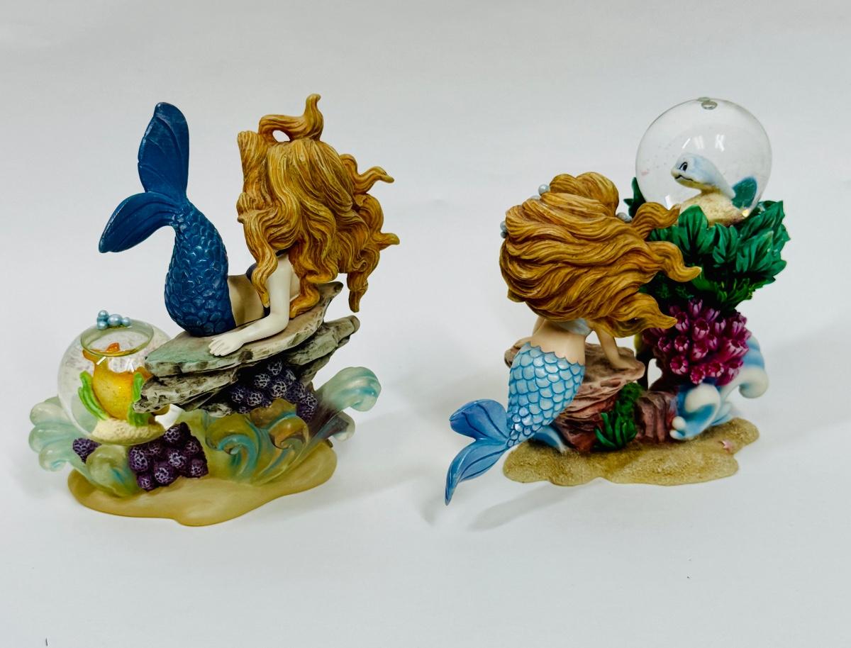 Limited edition pieces, In fair to good, previously owned condition. The lighter blue mermaid has a chip off her hair that is not very noticeable.