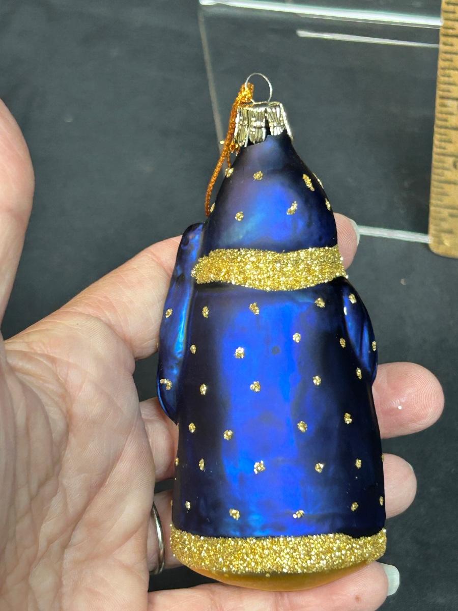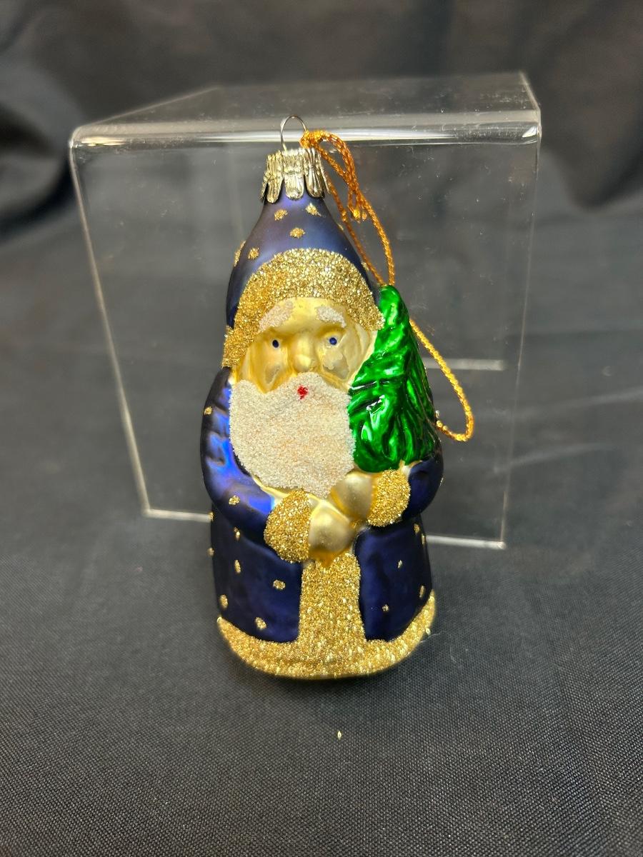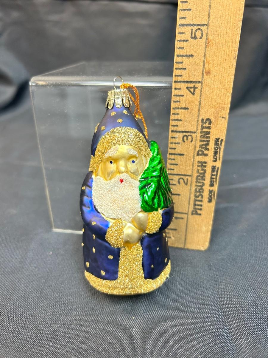Vintage Blue and Gold Santa Claus St. Nick Blown Glass Christmas Holiday Tree Ornament Czech Republic. In good condition. About 4" size.