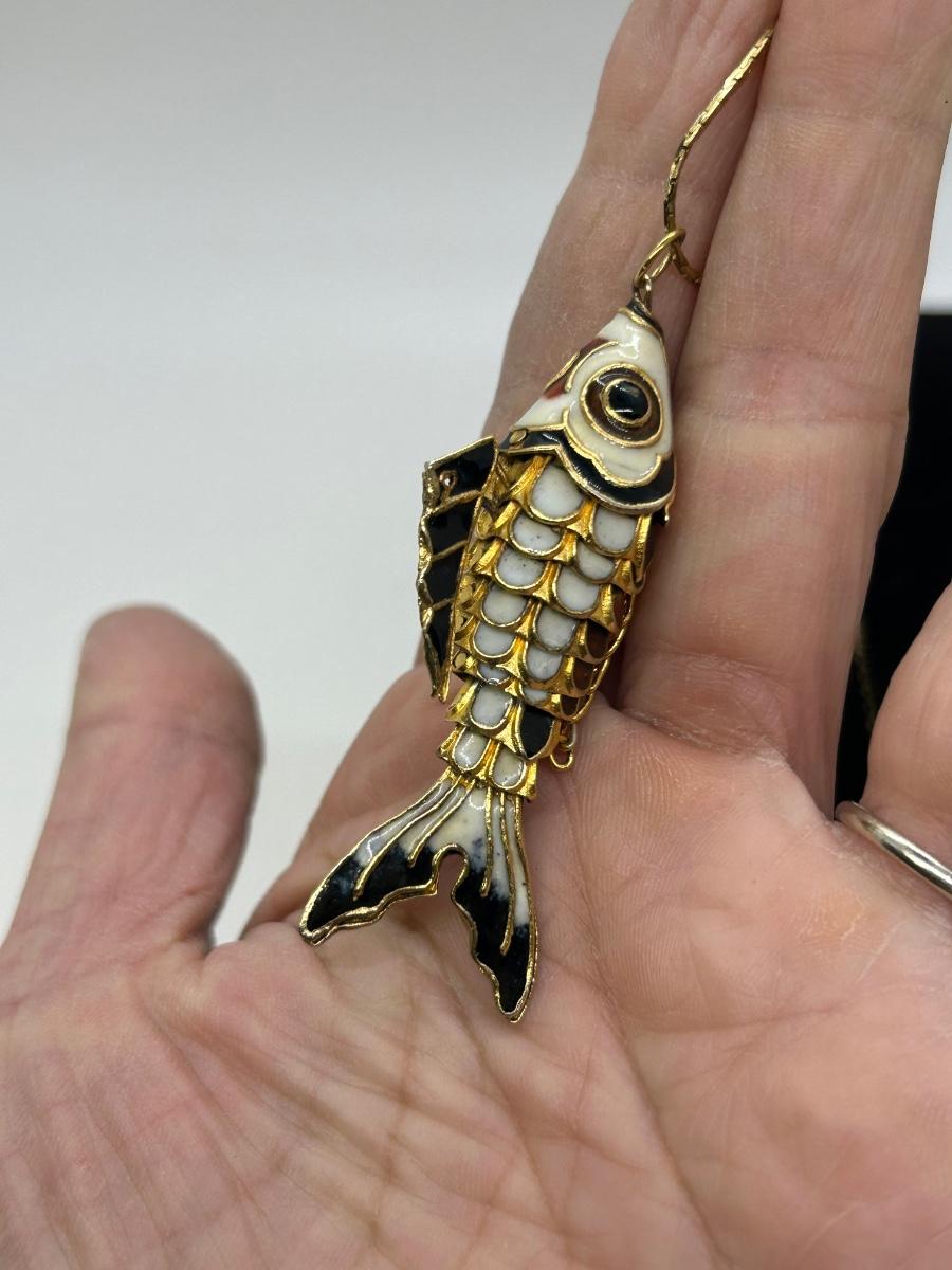 Gold Tone Articulated Koi Fish Pendant Necklace. In good condition. Red, black, and white enamel painted gold tone metal. Comes with necklace. No gold marks found.