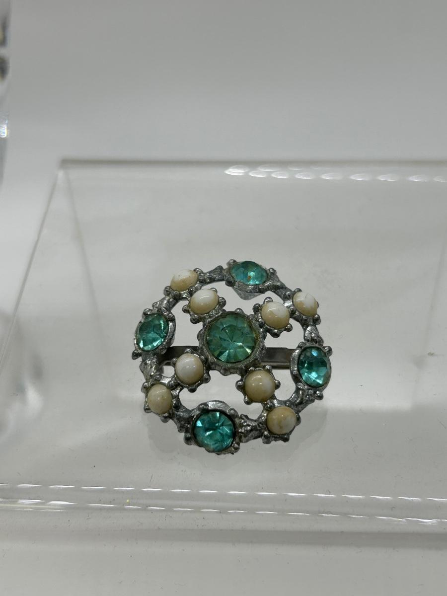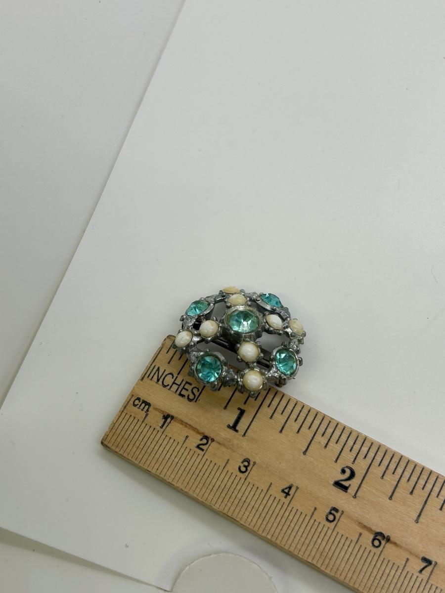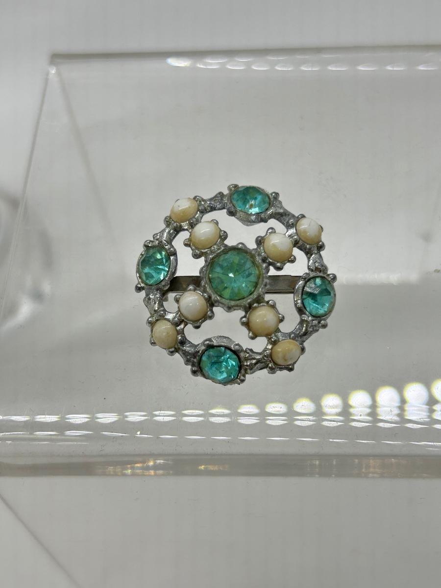 Vintage Silver Tone Round Medallion Pin Brooch with Light Blue Rhinestone and White Cabochon. In good vintage condition.