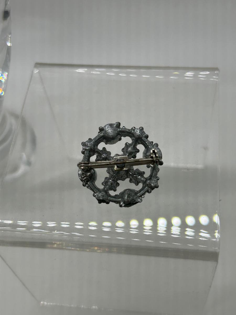 Vintage Silver Tone Round Medallion Pin Brooch with Light Blue Rhinestone and White Cabochon