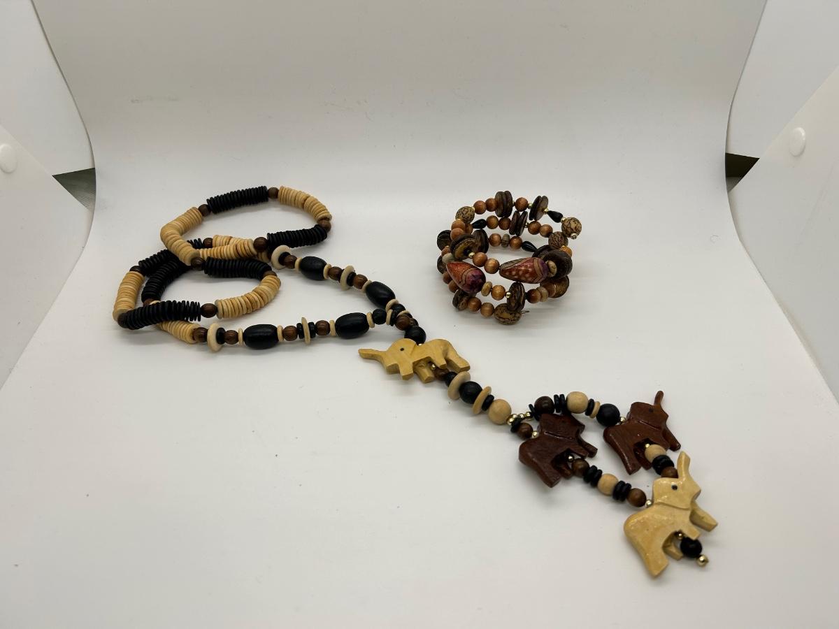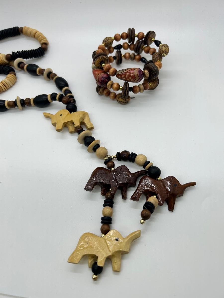 Extra Long Wood Elephant Beaded Necklace and Coil Bracelet. Both are in good condition.