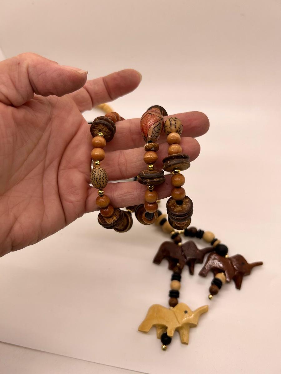 Extra Long Wood Elephant Beaded Necklace and Coil Bracelet