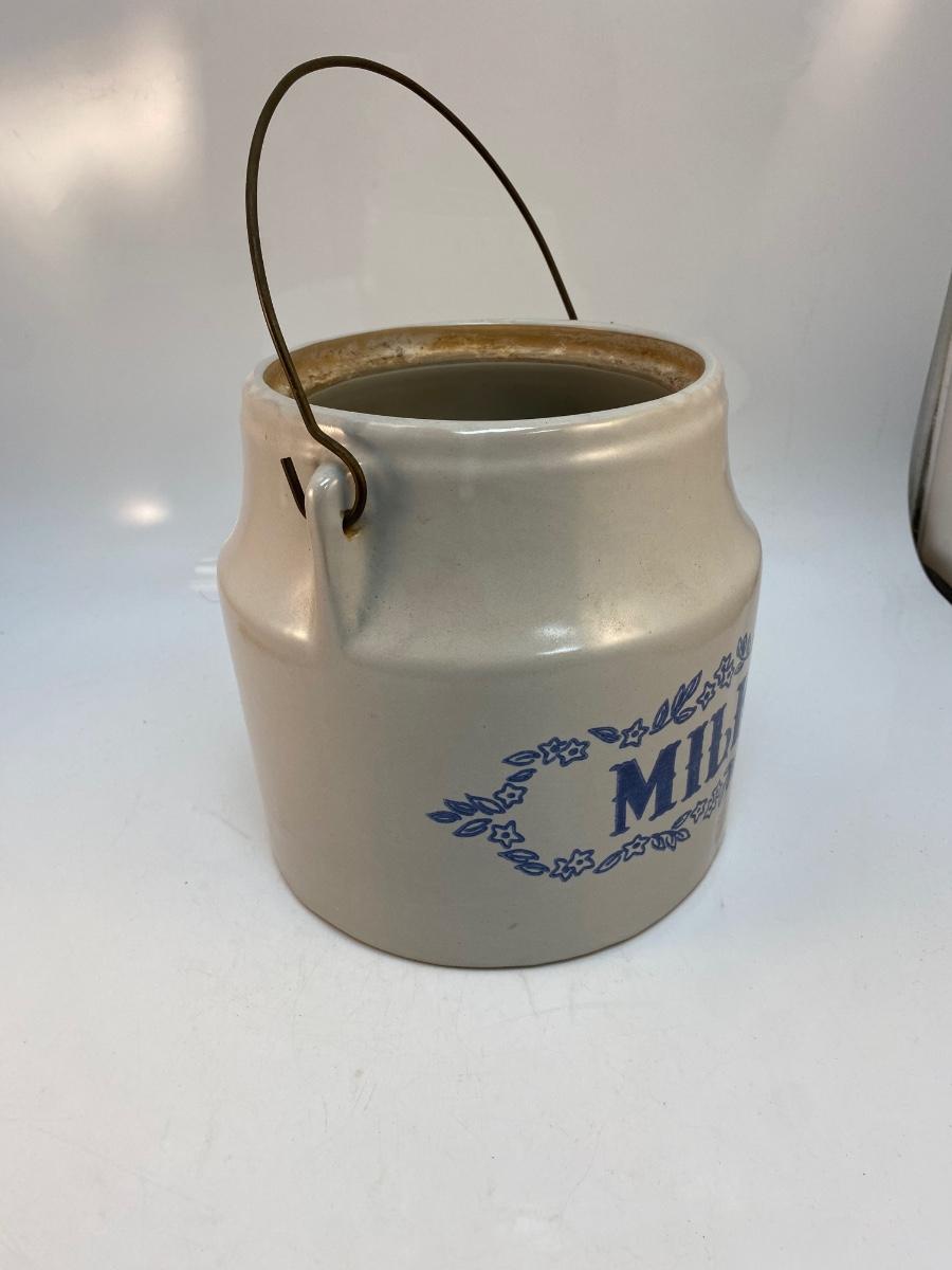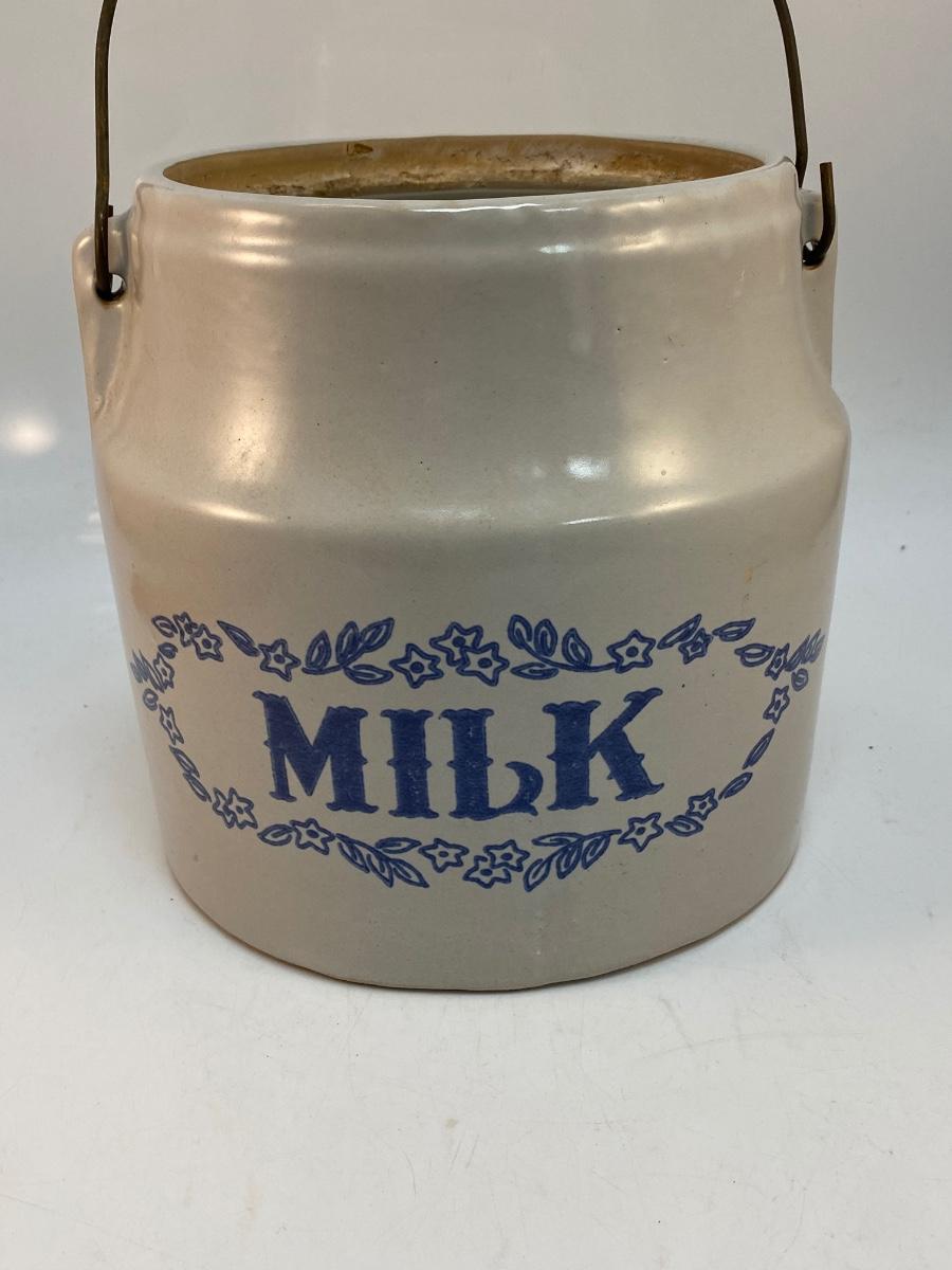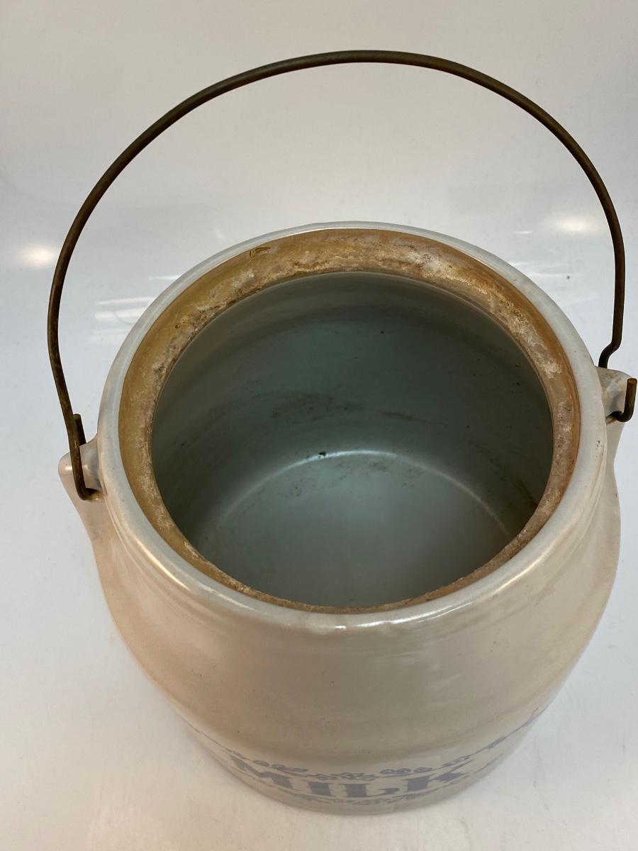 Vintage Monmouth Stoneware Pottery Milk Bucket Crock with Metal Wire Handle No Lid. Other than the missing lid crock is in good condition. Marked Monmouth on the bottom.