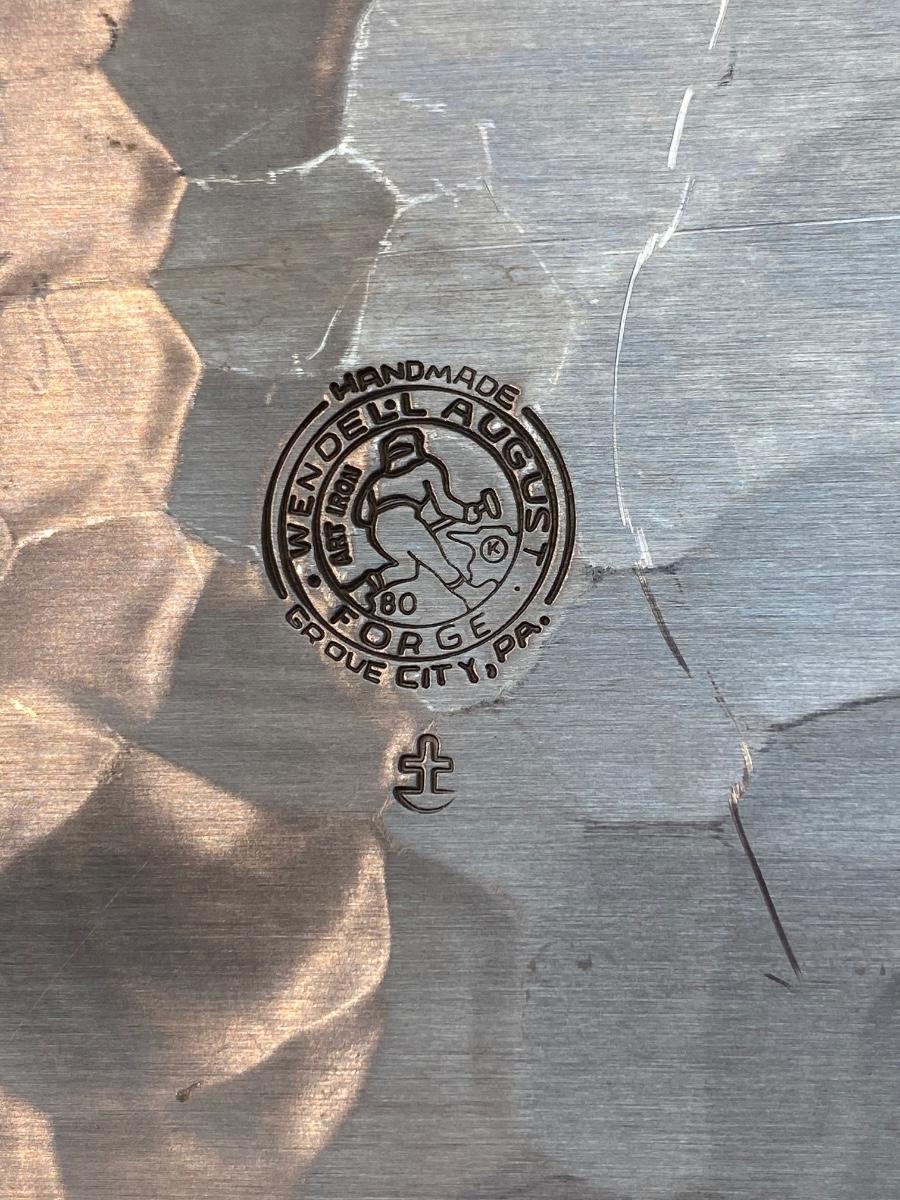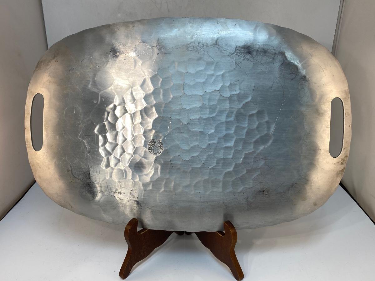 Hammered Embossed Aluminum Wendell August Forge Handmade Serving Tray Eagle in Flight. Handle cutout on each end. In good condition. Would polish up nicely. About 18" length.
