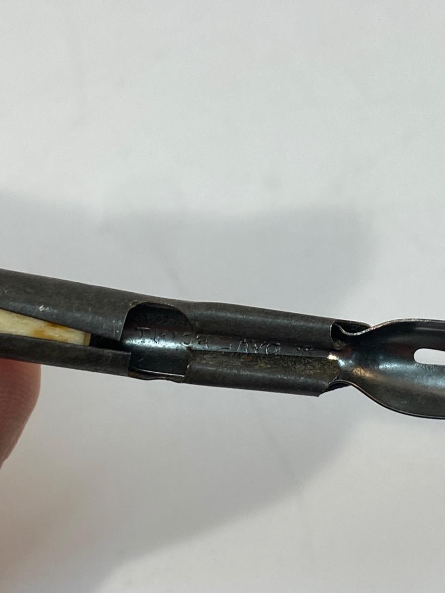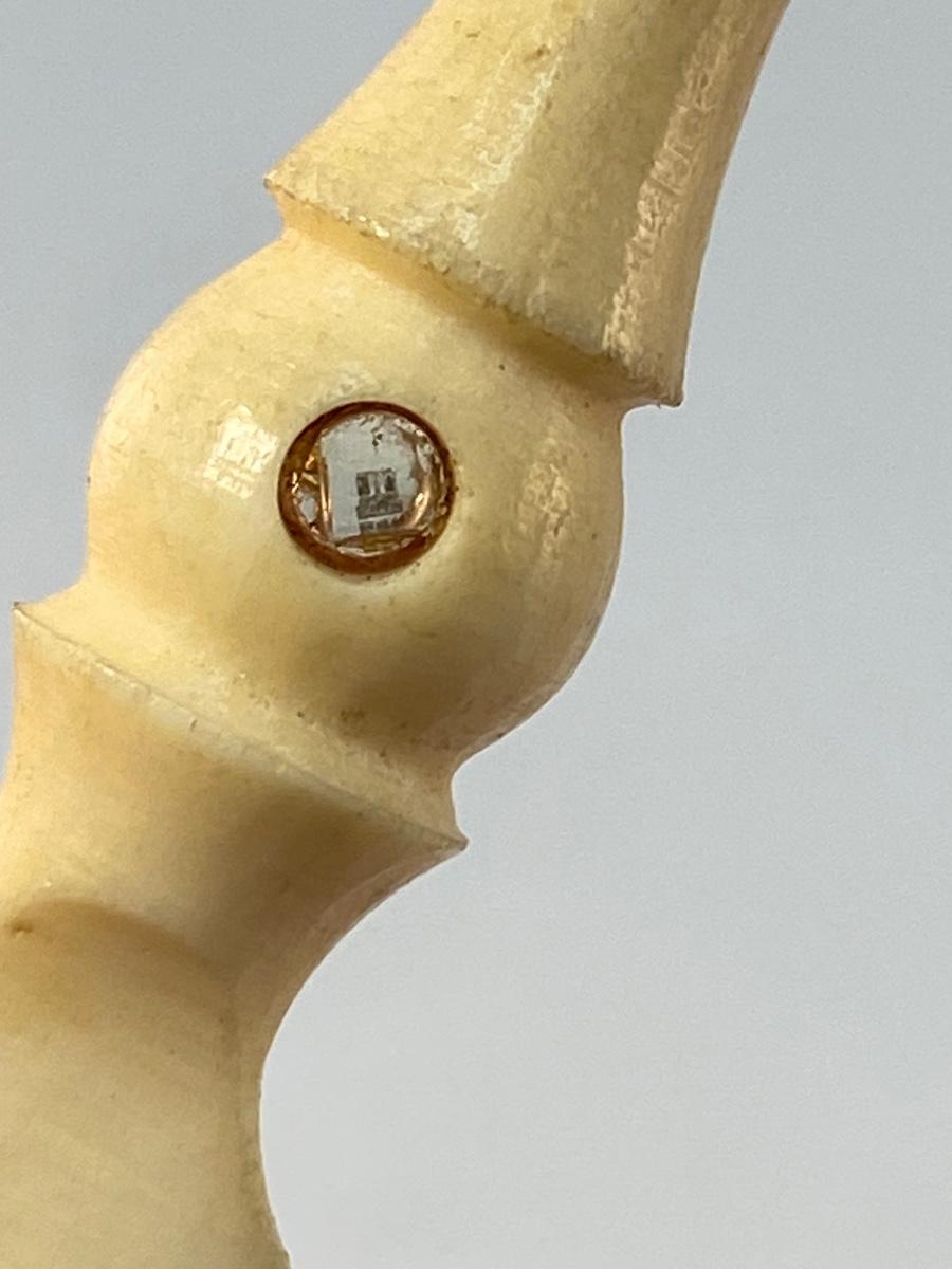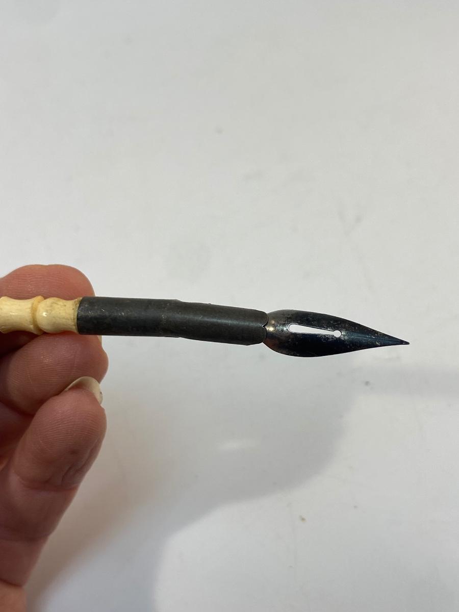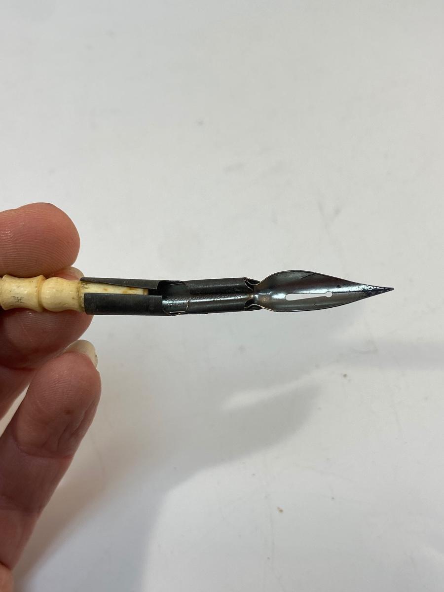 Antique Carved Horn Bone Stanhope Dip Pen Letter Opener with Religious Lourdes Images in Handle. Tiny viewing spot has religious images viewable in the light. In good antique condition. There is maker name on pen tip inside but can't quite make it out. About 8" length