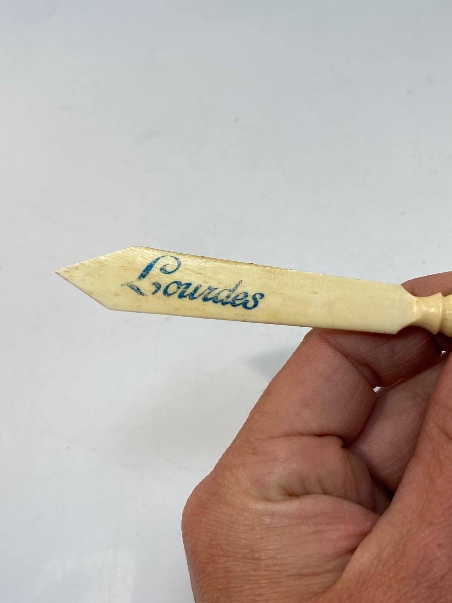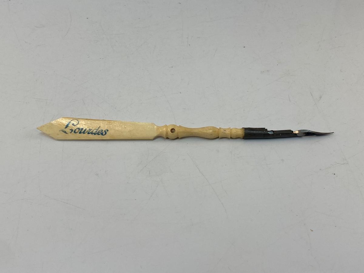 Antique Carved Horn Bone Stanhope Dip Pen Letter Opener with Religious Lourdes Images in Handle
