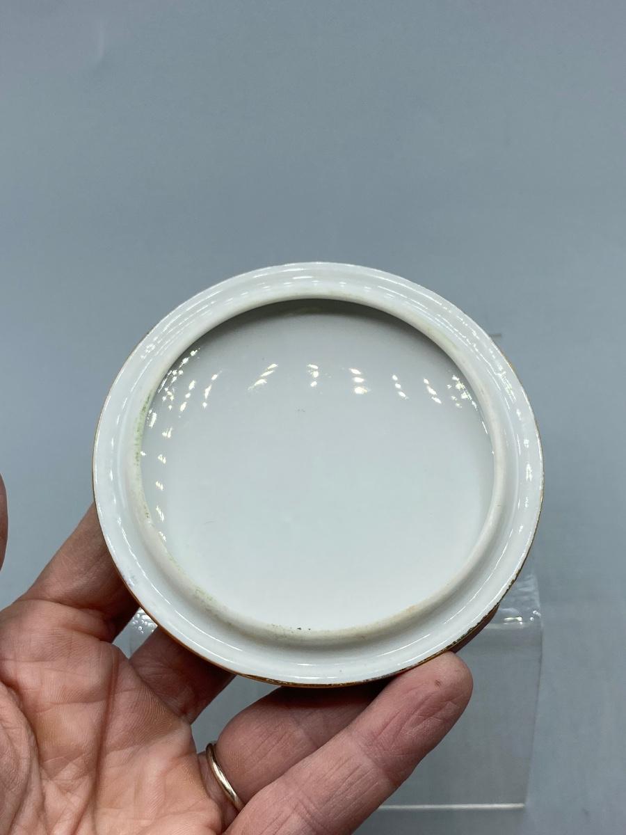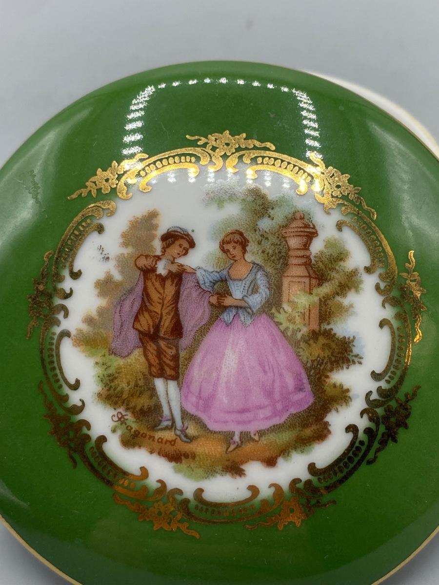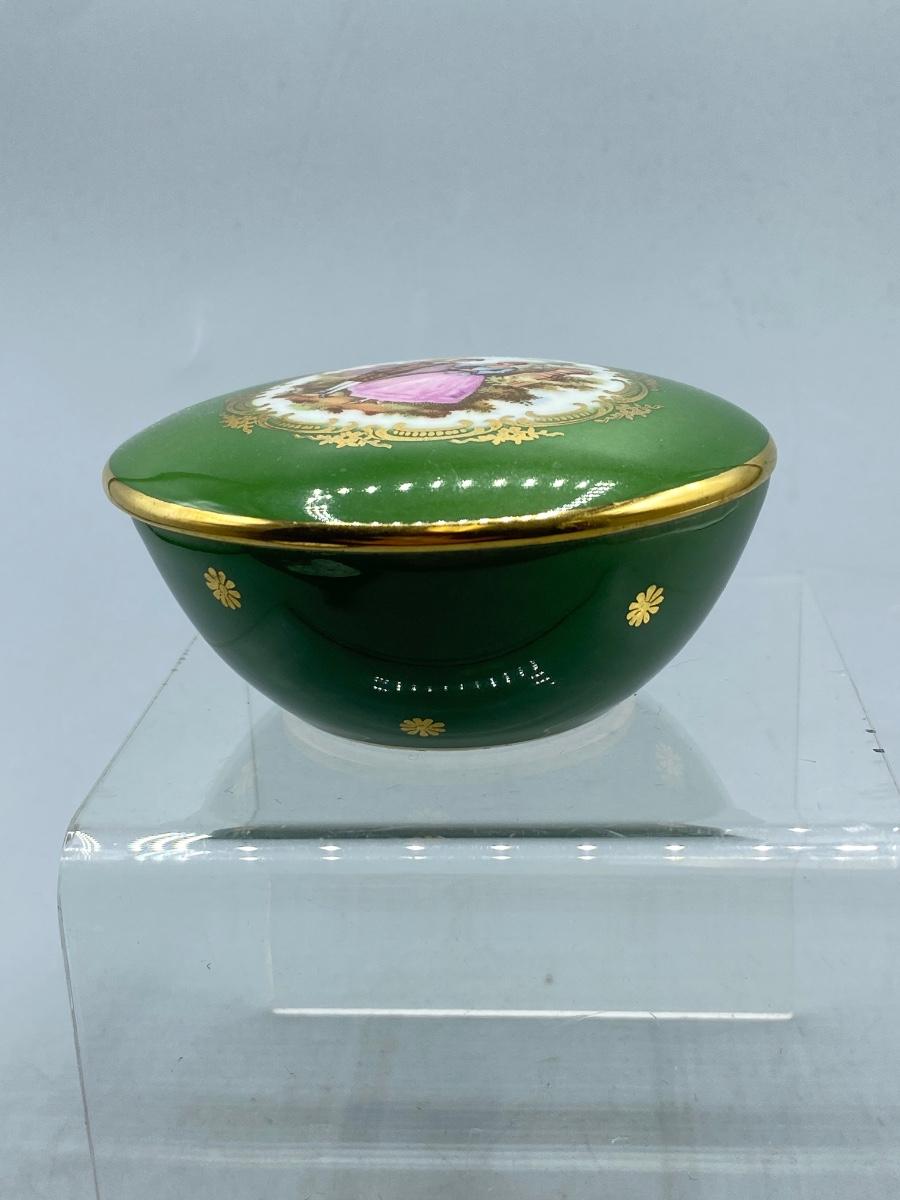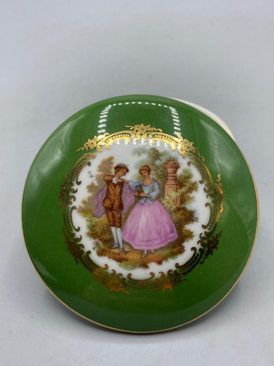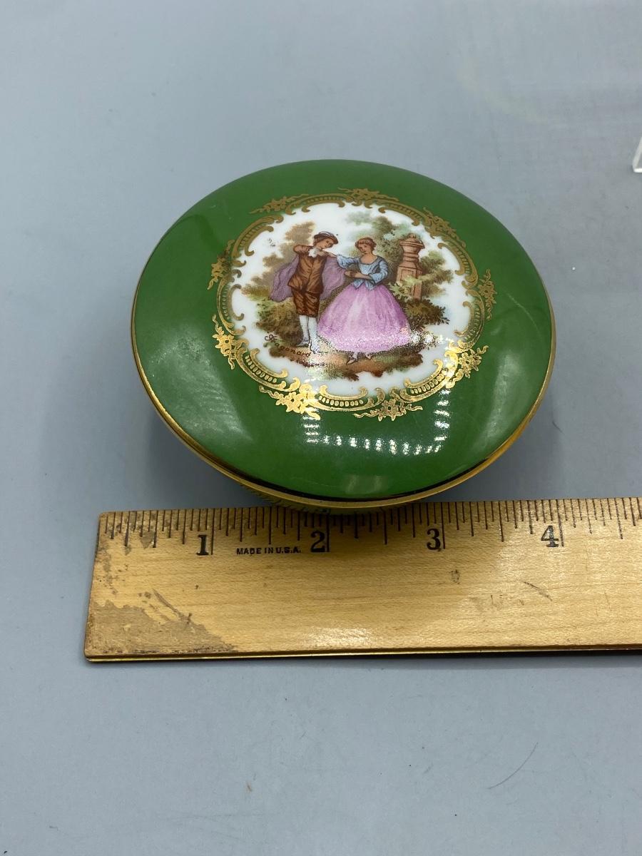 Vintage Green Limoges Lidded Trinket Dish with Victorian Couple Romantic Scene on Top. In good condition. About 4" diameter.