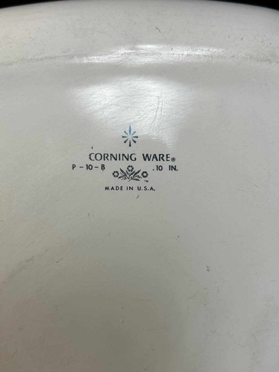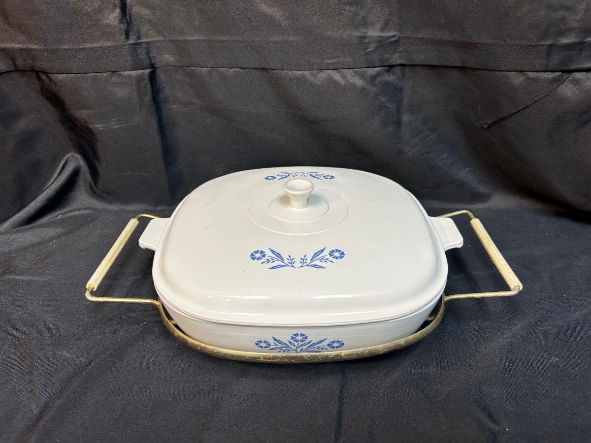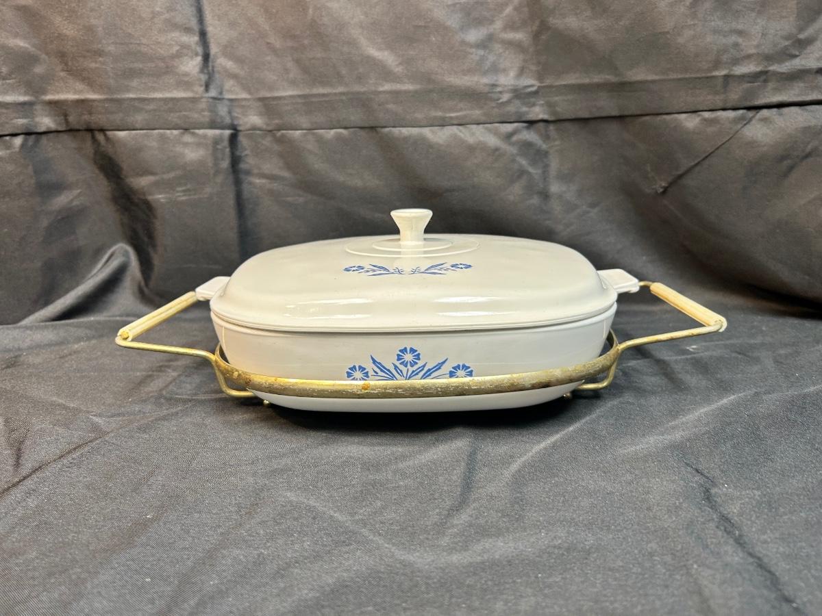 Vintage Corning Ware Blue Cornflower 10" Casserole Baking Dish with Lid and Metal Serving Caddy. In vintage condition. Light wear and signs of use, no chips.