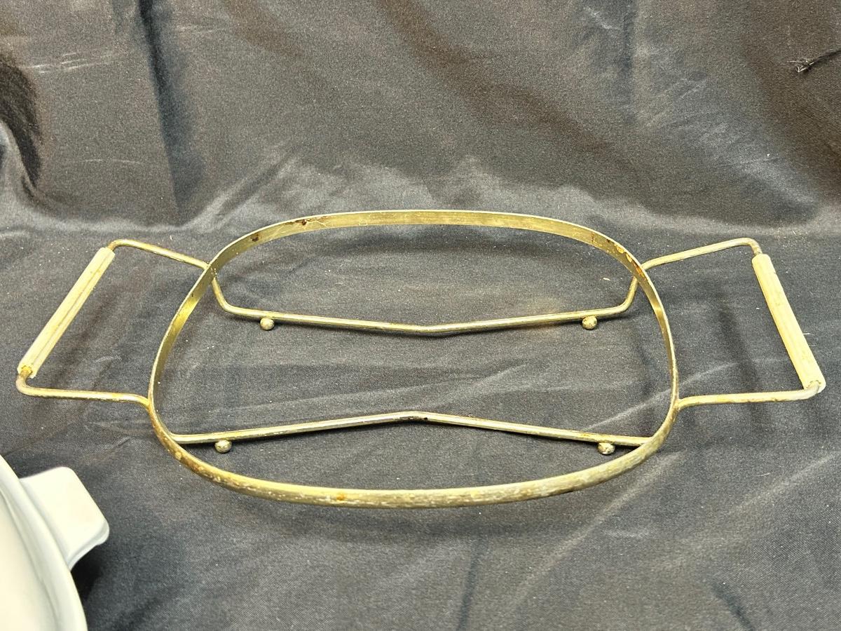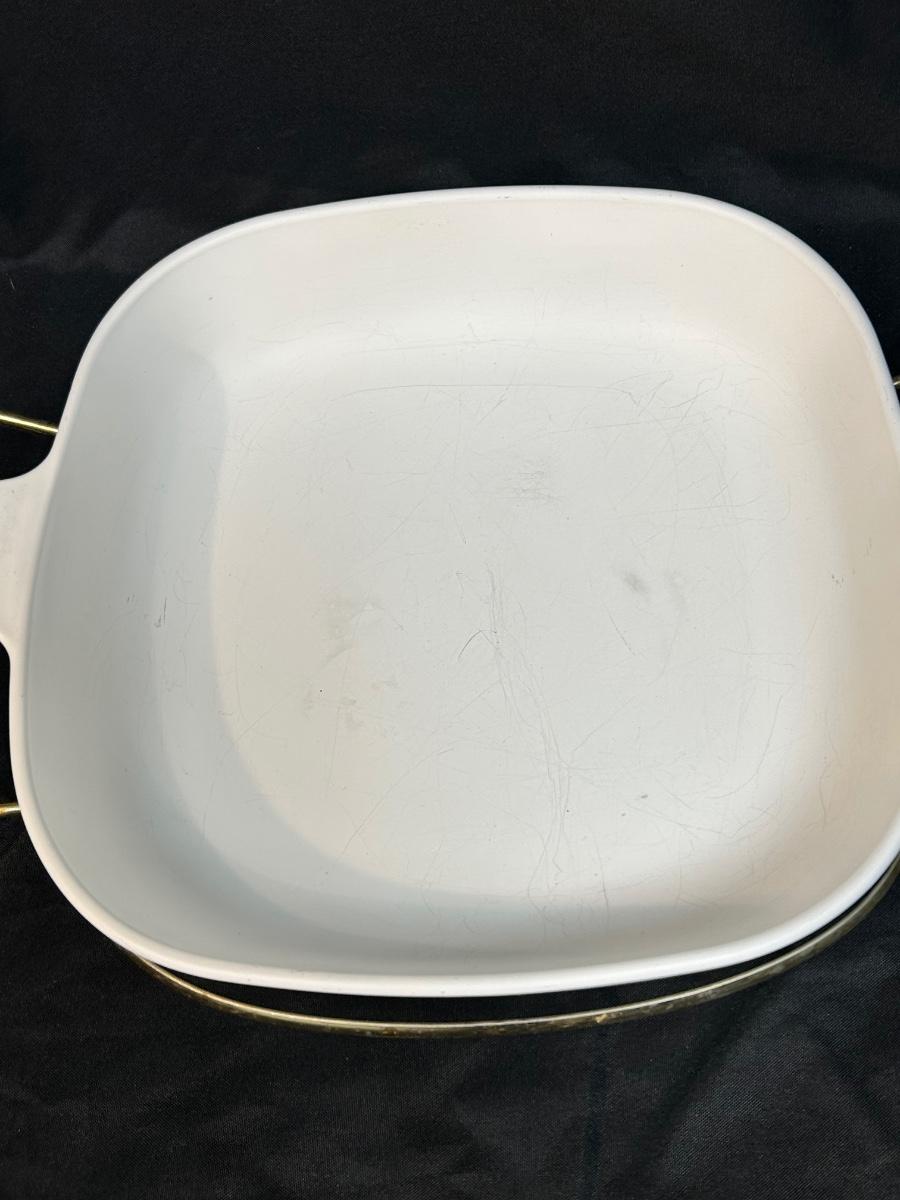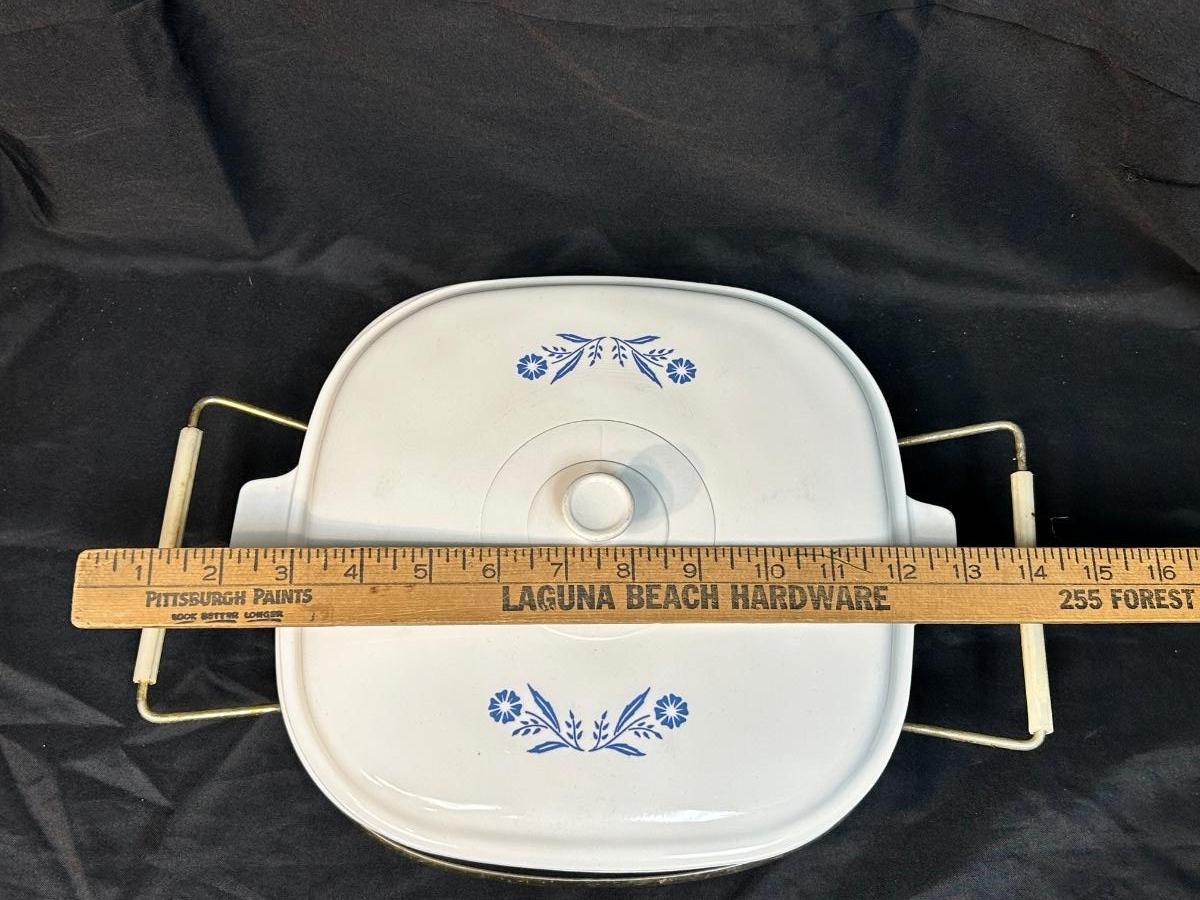Vintage Corning Ware Blue Cornflower 10" Casserole Baking Dish with Lid and Metal Serving Caddy