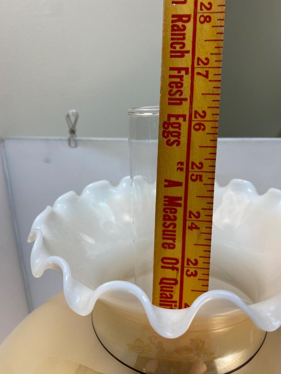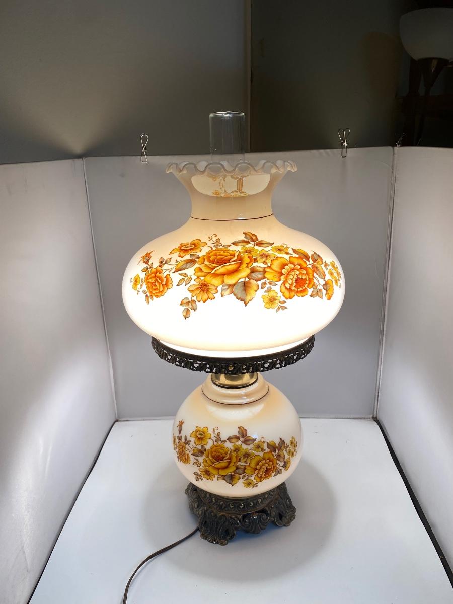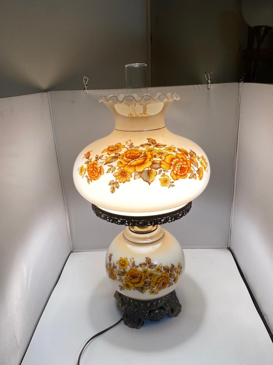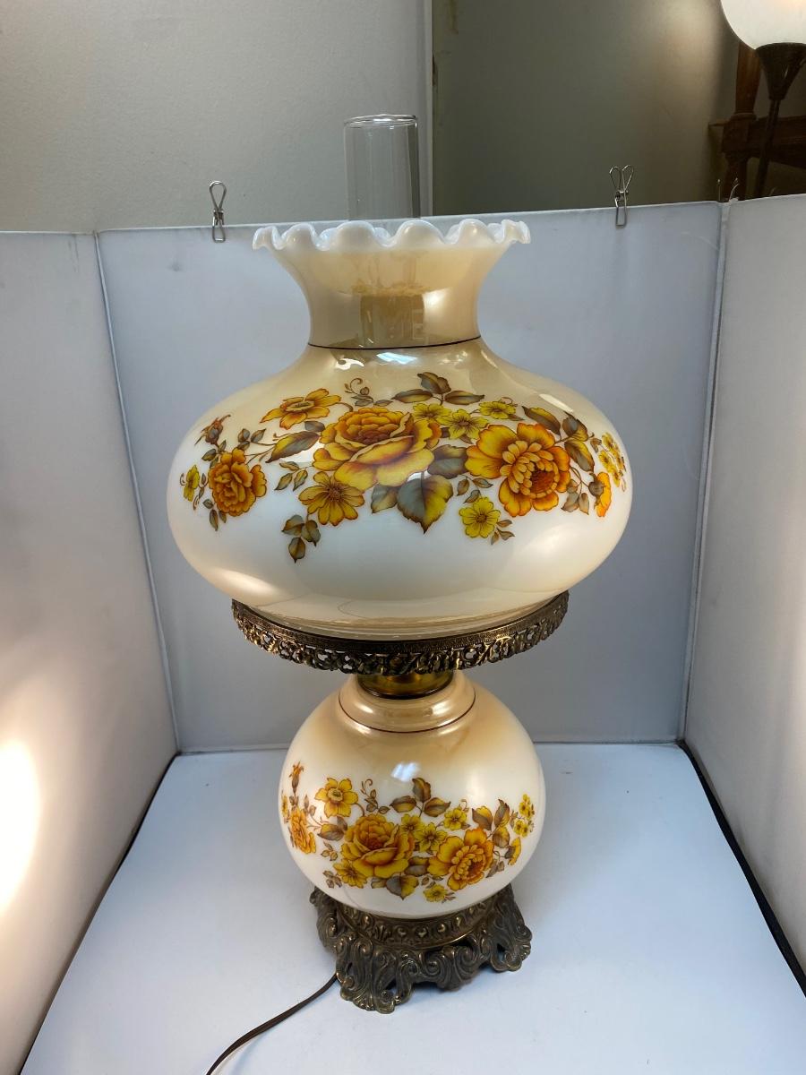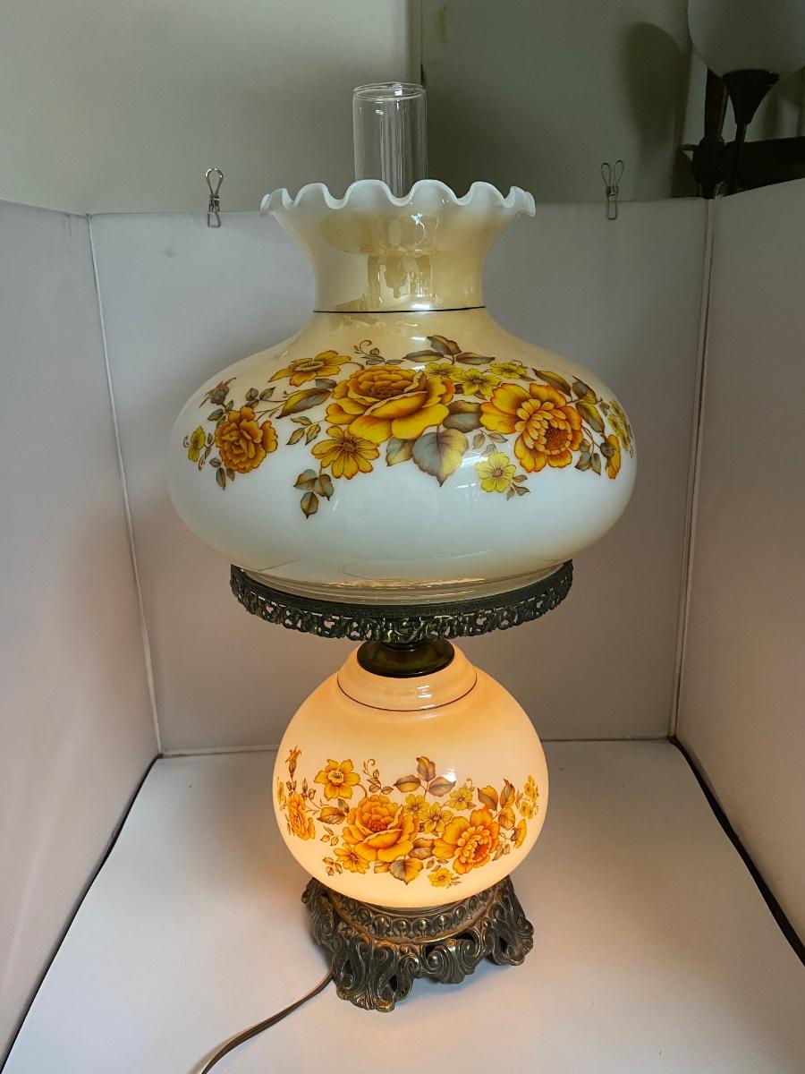 Vintage Double Globe Dual Light Hurricane Parlor Lamp Yellow & Orange Floral. In good vintage condition. Both lights work. Very little signs of age or wear. About 26" at top of hurricane glass piece. Comes with lower lamp bulb, needs an upper bulb.