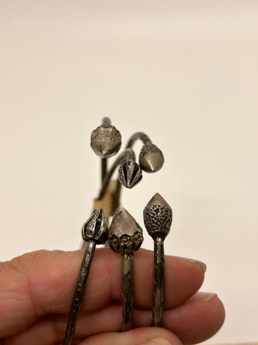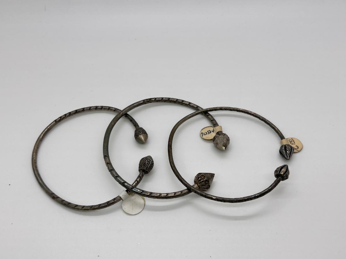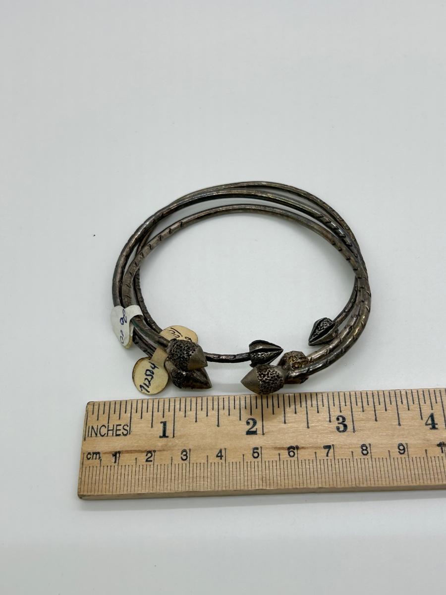 Set of Three Adjustable Thin Cuff Style Bracelets with Arrow Like Ends. No sterling marks. In good condition, just need to be cleaned/polished.