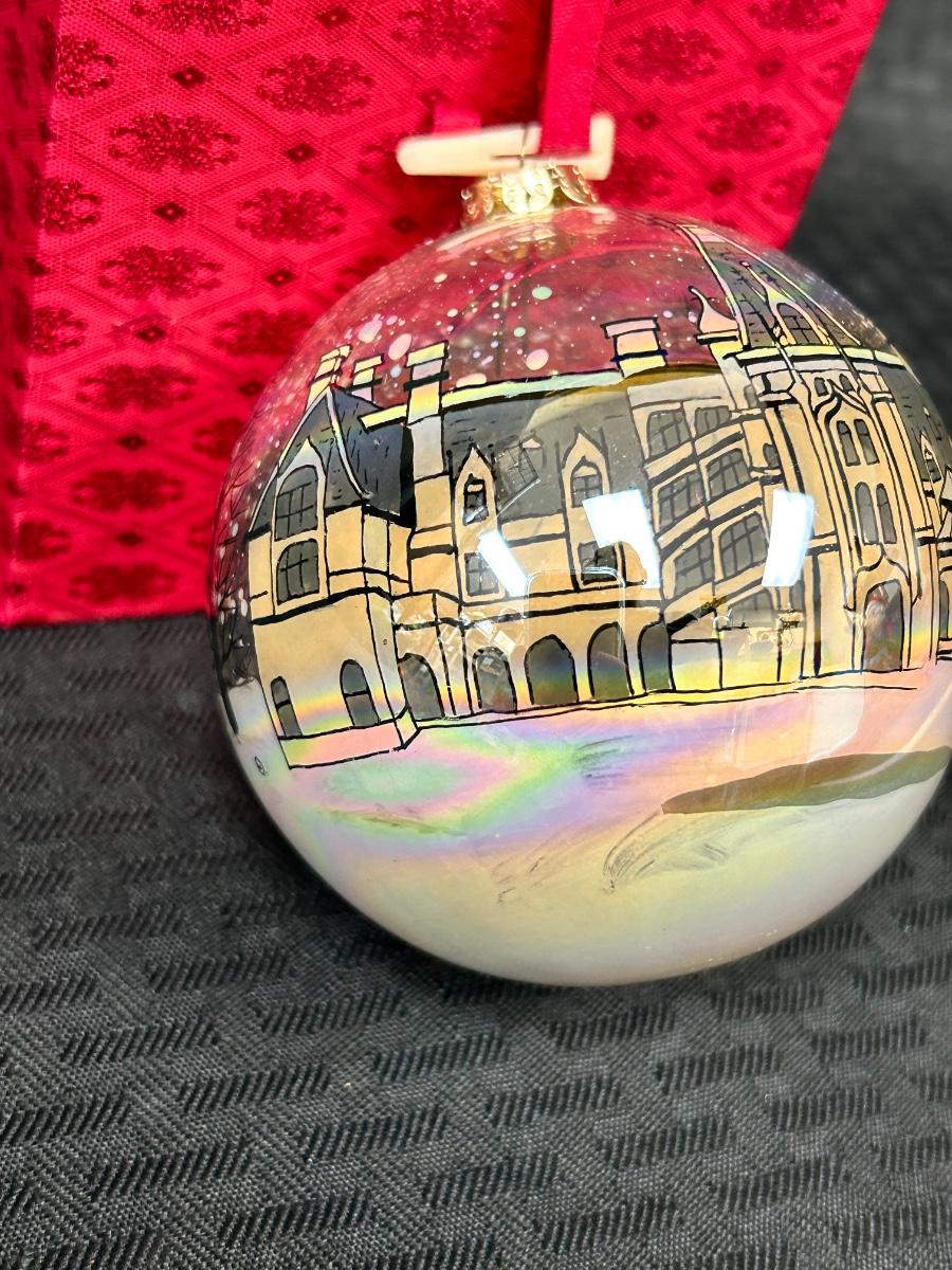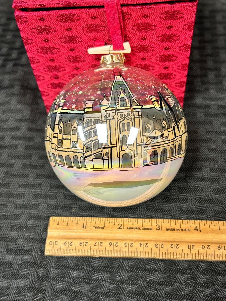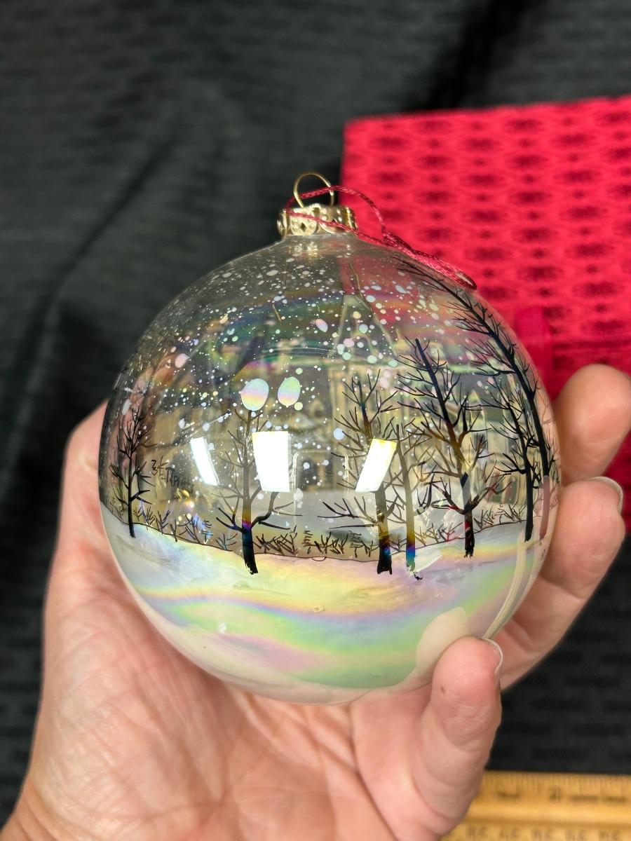 Hand Painted Glass Ball Christmas Tree Ornament. No name or ID on ornament, looks like an old building of some sort. Comes with box.