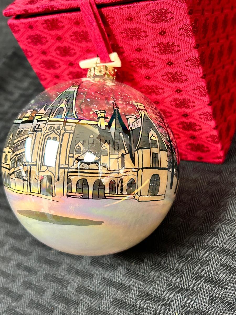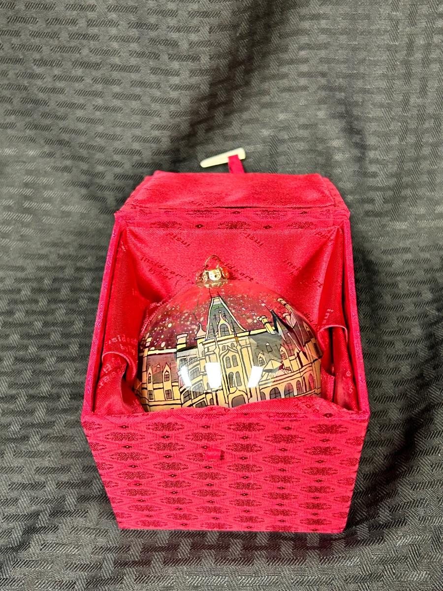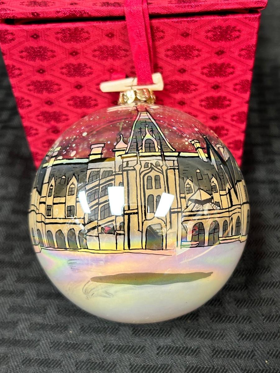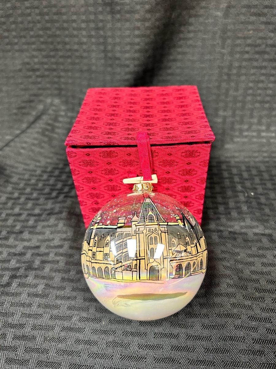 Hand Painted Glass Ball Christmas Tree Ornament. No name or ID on ornament, looks like an old building of some sort. Comes with box.