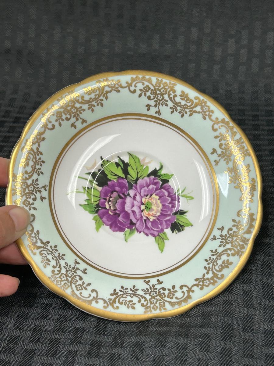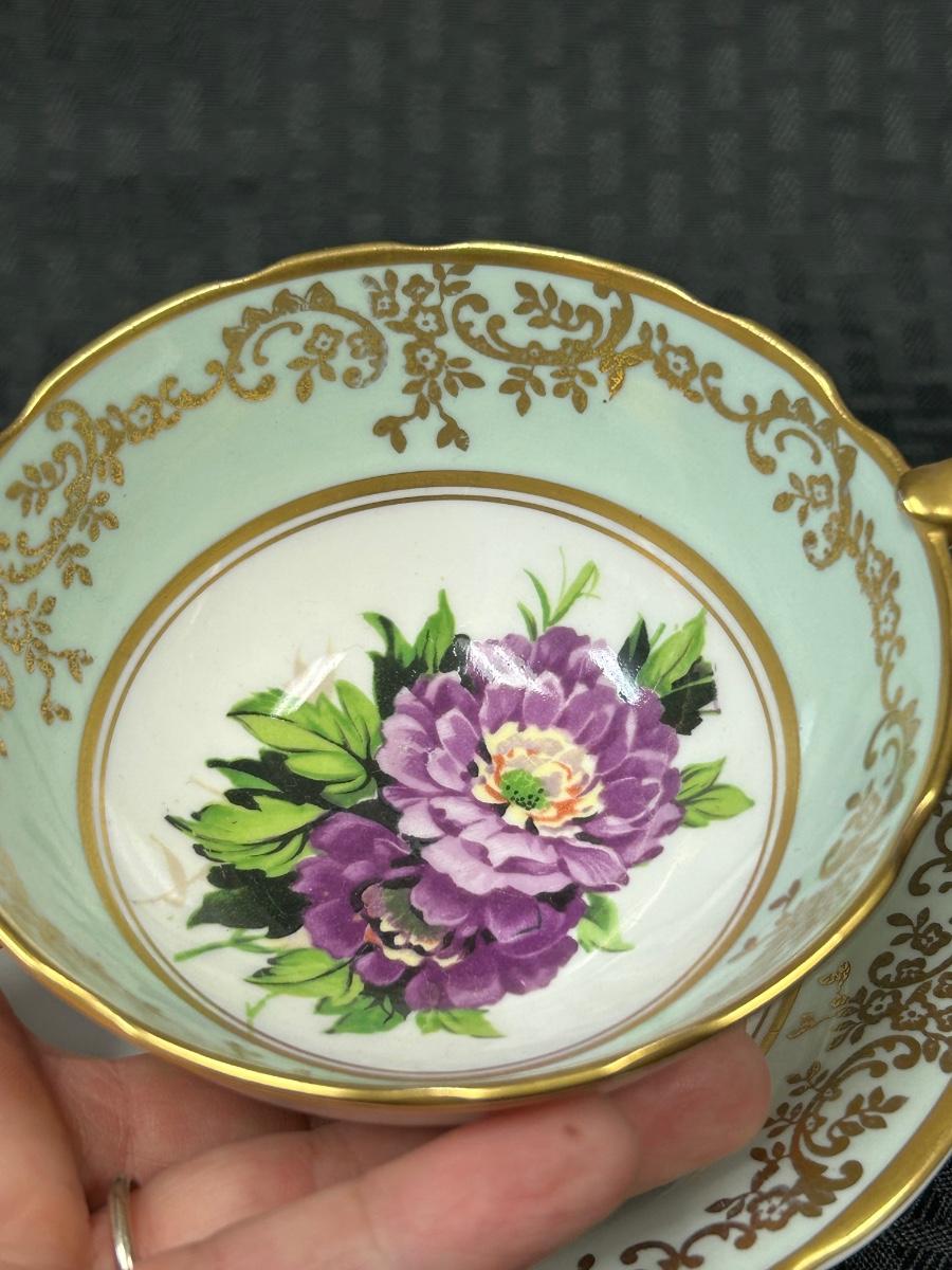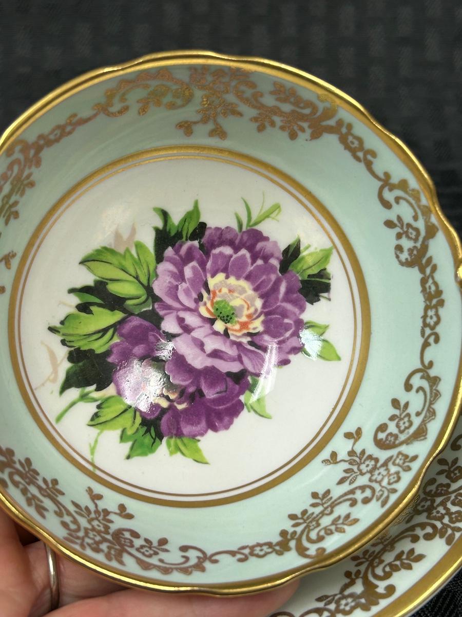 Vintage Salisbury Bone China Mint Green and Gold Teacup and Saucer with Purple Flowers. In good vintage condition. May have light signs of wear to gold detail from use and age.