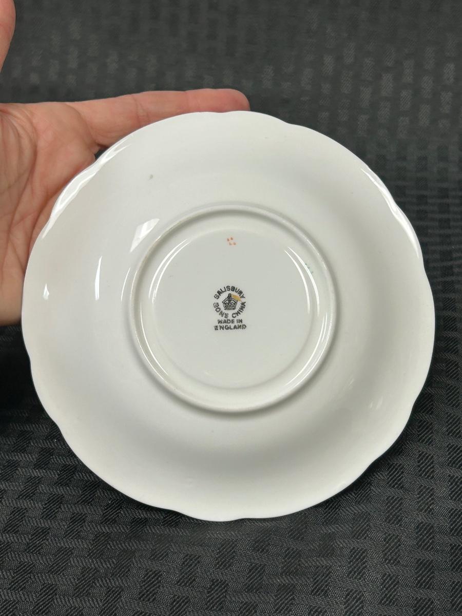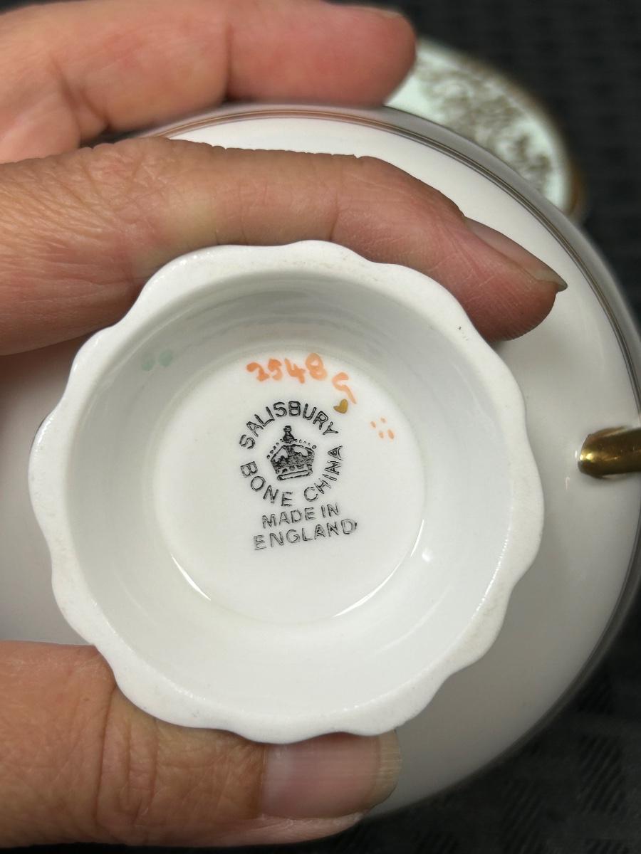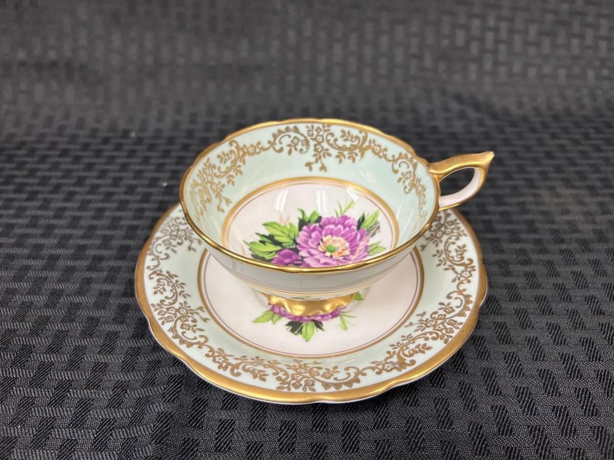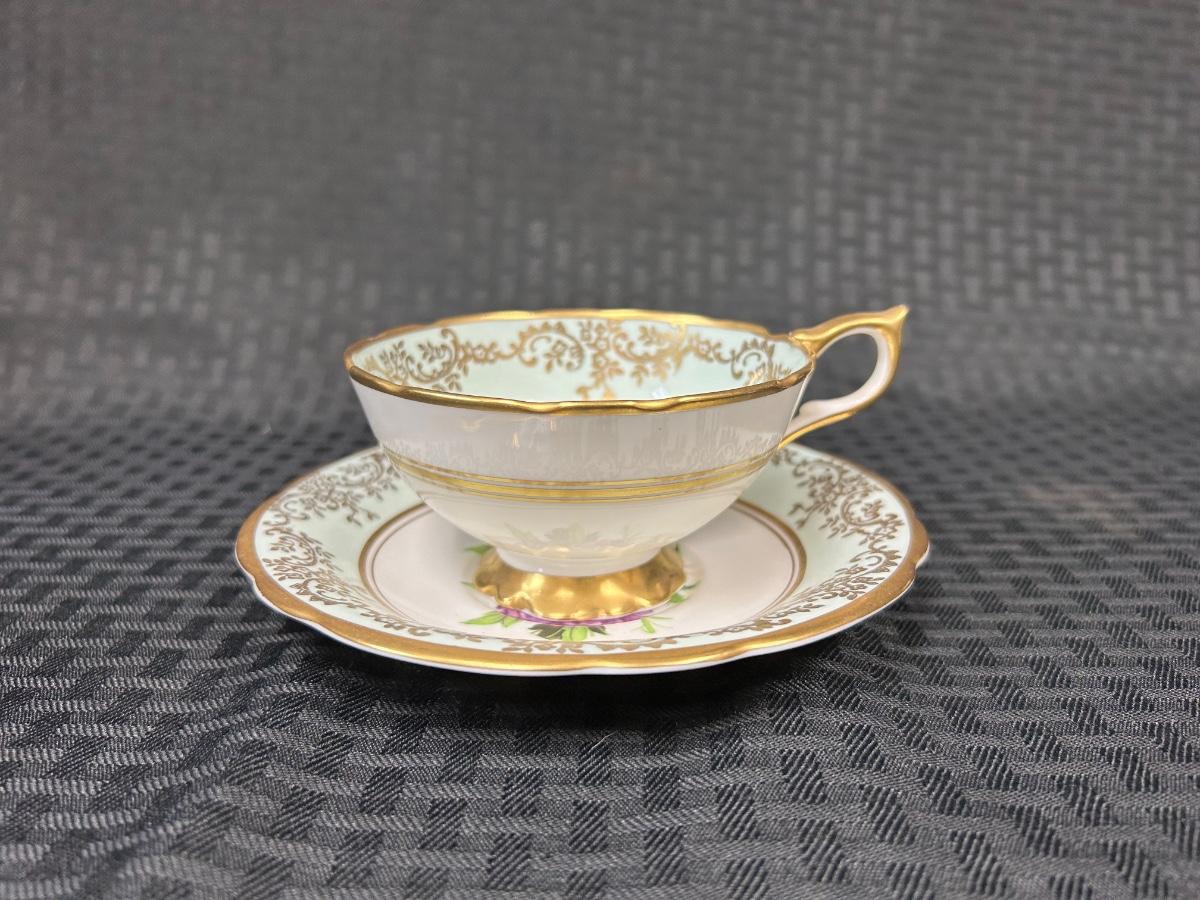 Vintage Salisbury Bone China Mint Green and Gold Teacup and Saucer with Purple Flowers. In good vintage condition. May have light signs of wear to gold detail from use and age.