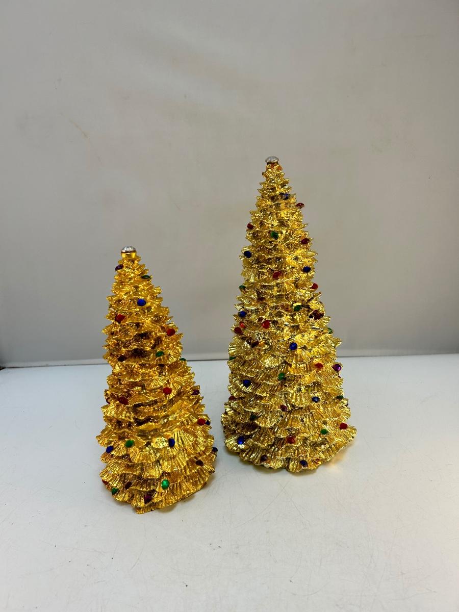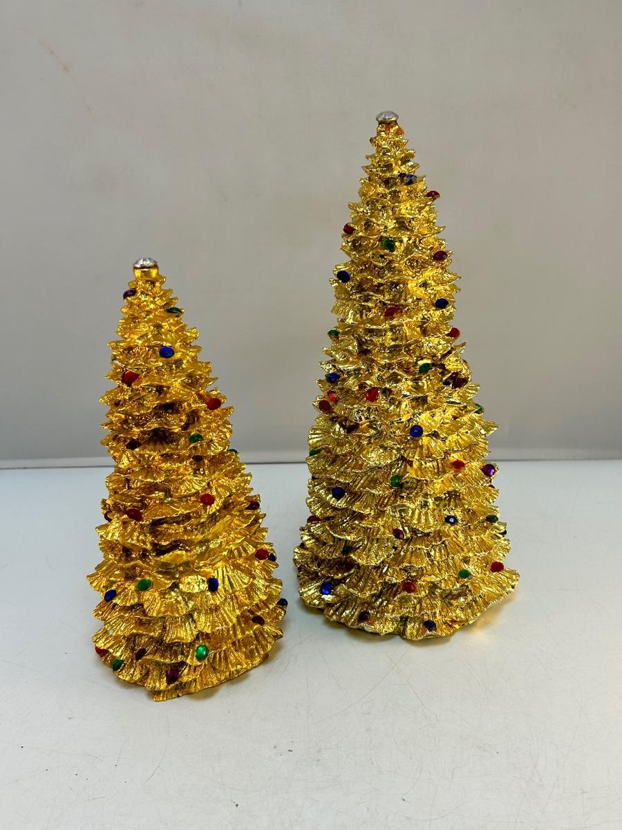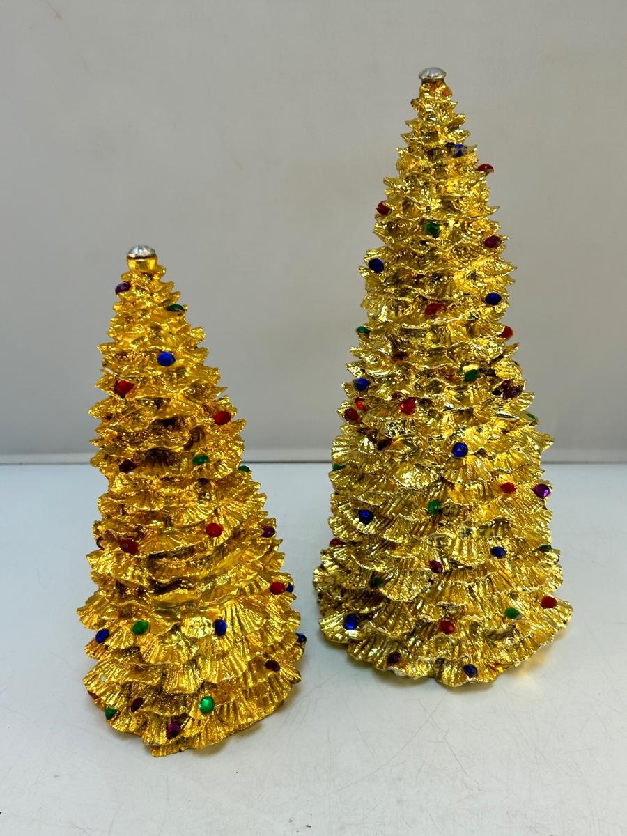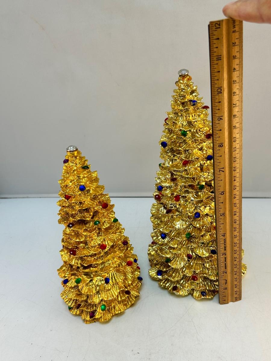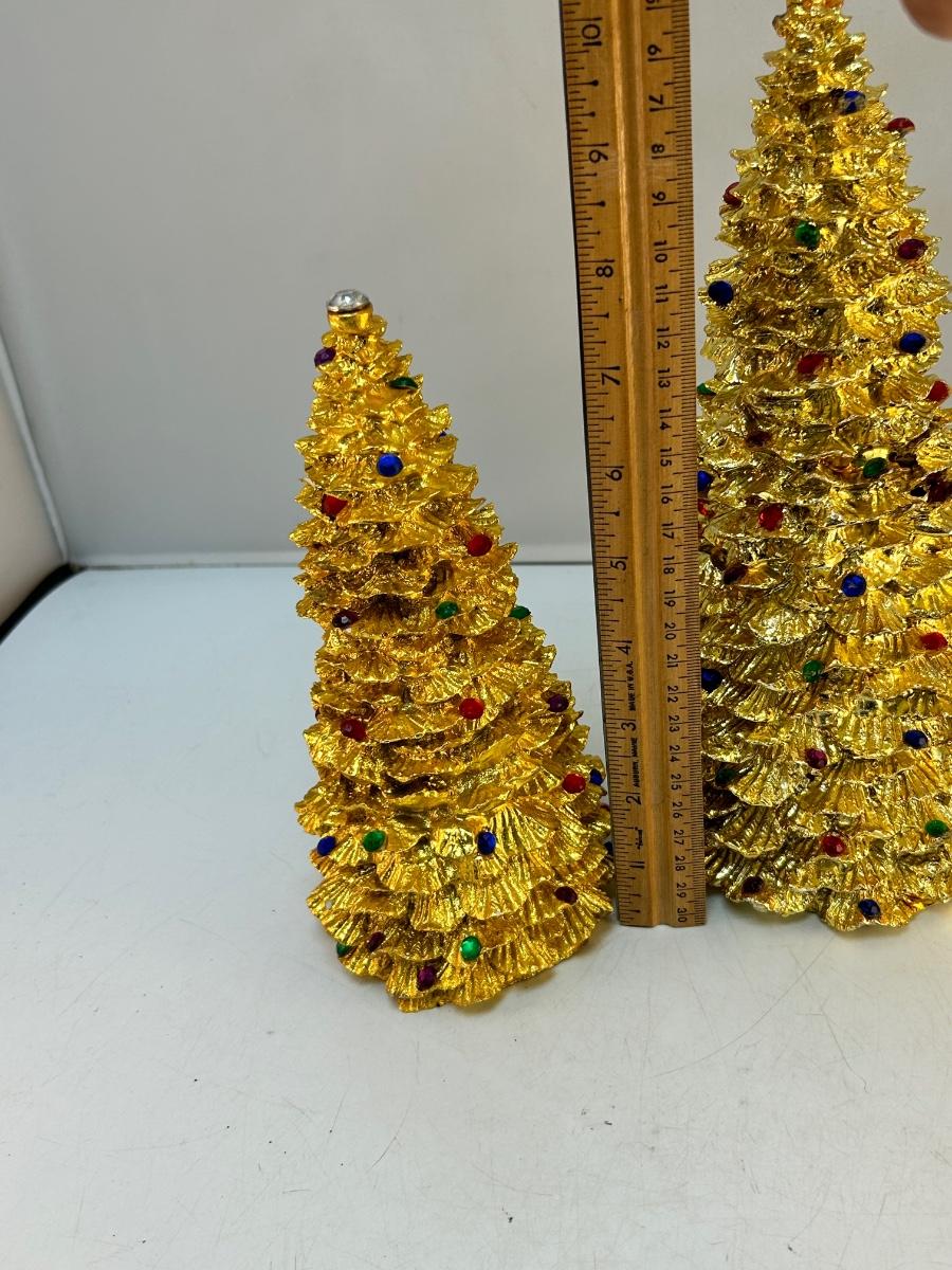 Pair of Gold Tone Jeweled Christmas Tree Figurines. There is an Enesco sticker on the bottom of one. Two sizes, in good vintage condition.