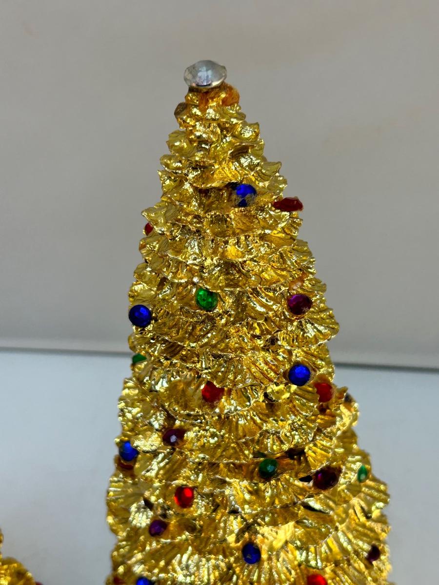 Pair of Enesco Gold Tone Jeweled Christmas Tree Figurines