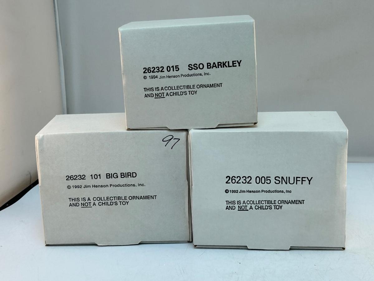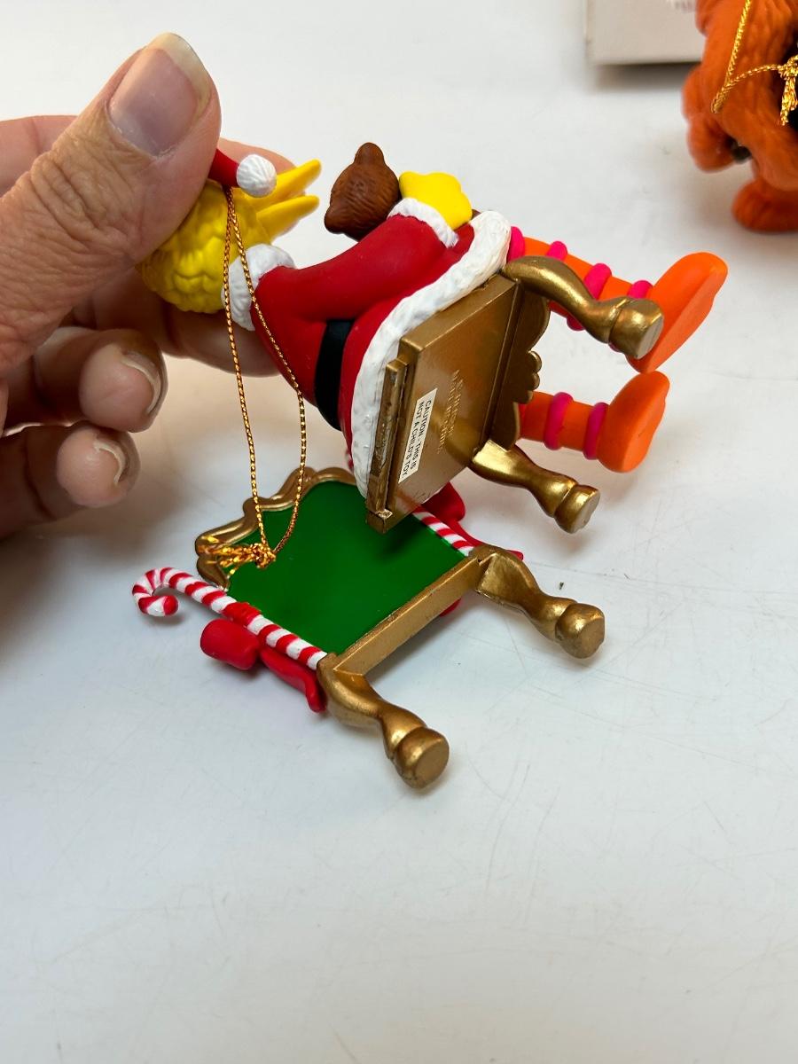 Grolier Christmas Holiday Tree Ornaments Sesame Street Big Bird Snuffy Barkley. In previously displayed condition. The chair Big Bird is sitting in needs to be glued back together, it has come apart from age. All come in original boxes. Under 4" size.
