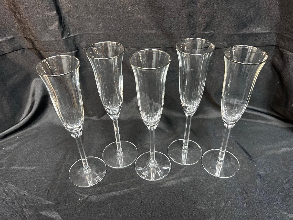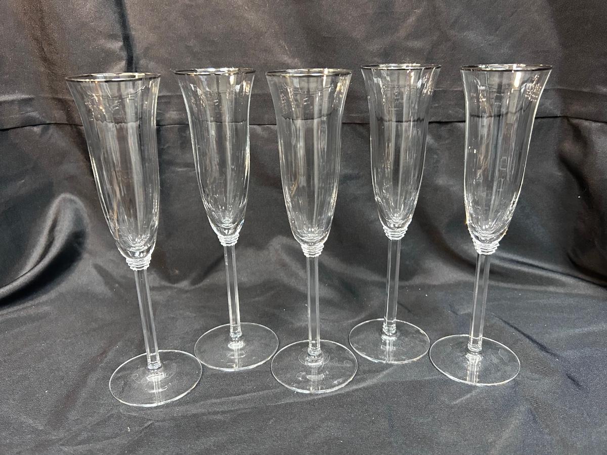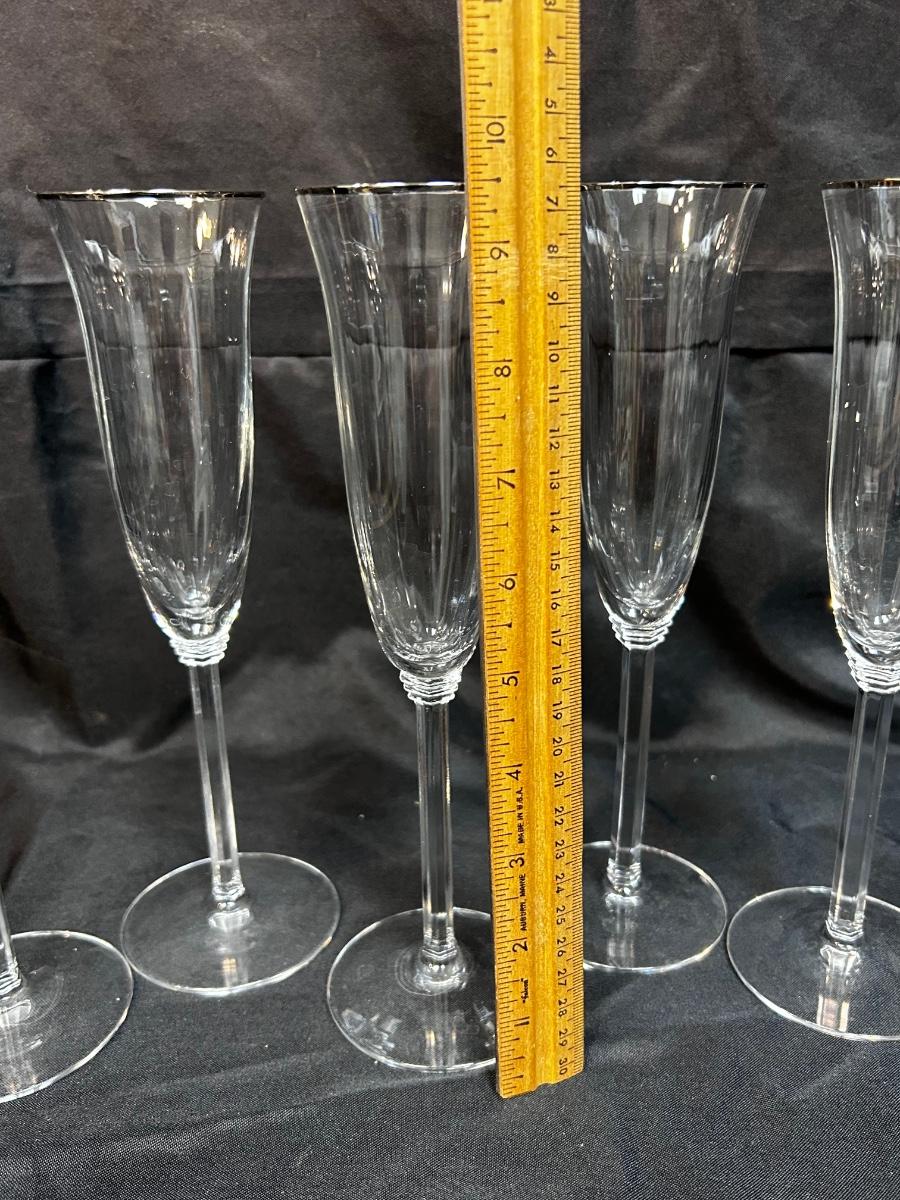 Set of 5 Fluted Crystal Glass Champagne Drink Glasses Stemware with Platinum Silver Rim. In good condition. Slightly ribbed glass. Unbranded, no hallmark noticed. No chips noticed, 9.5" size.
