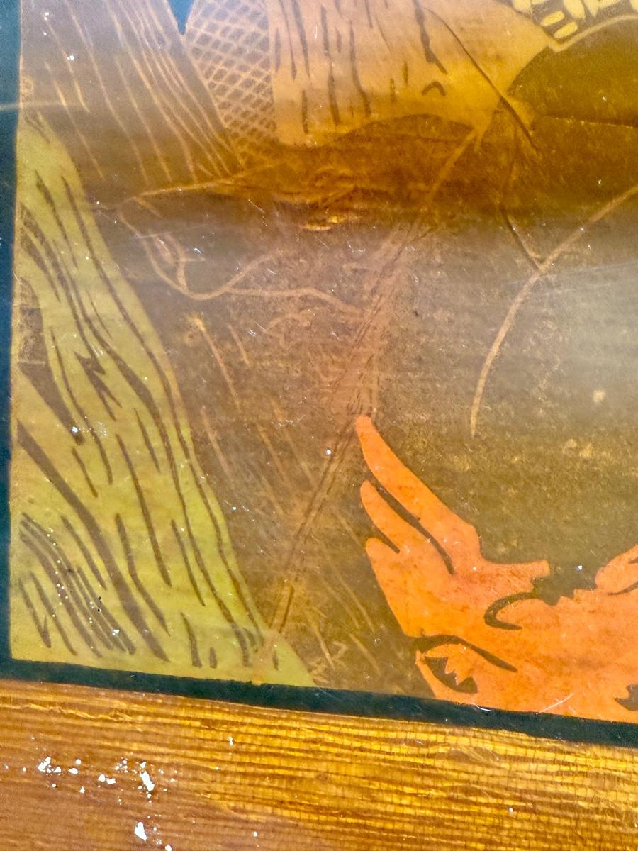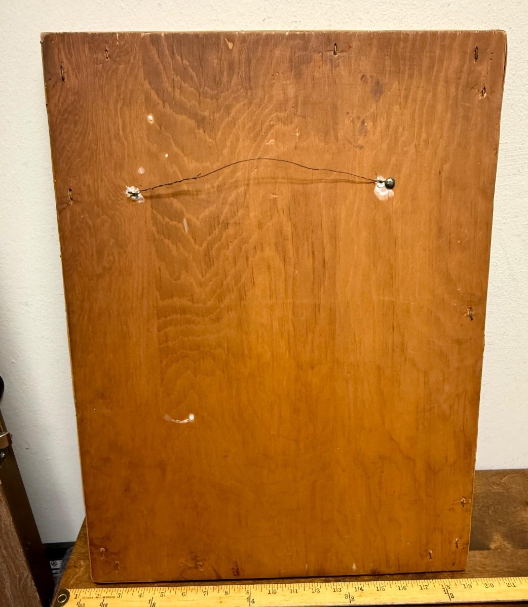 In fair to good condition. There is some water damage showing on the matting and the plastic cover is warped, but artwork looks good underneath.