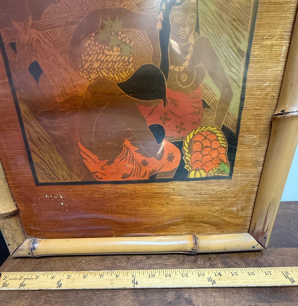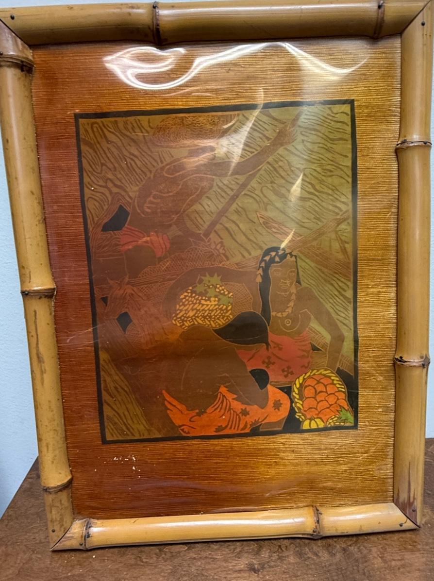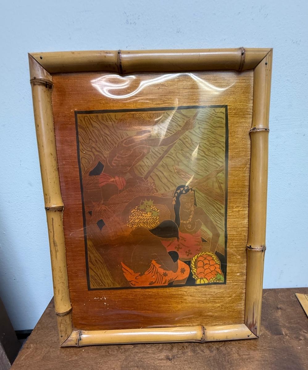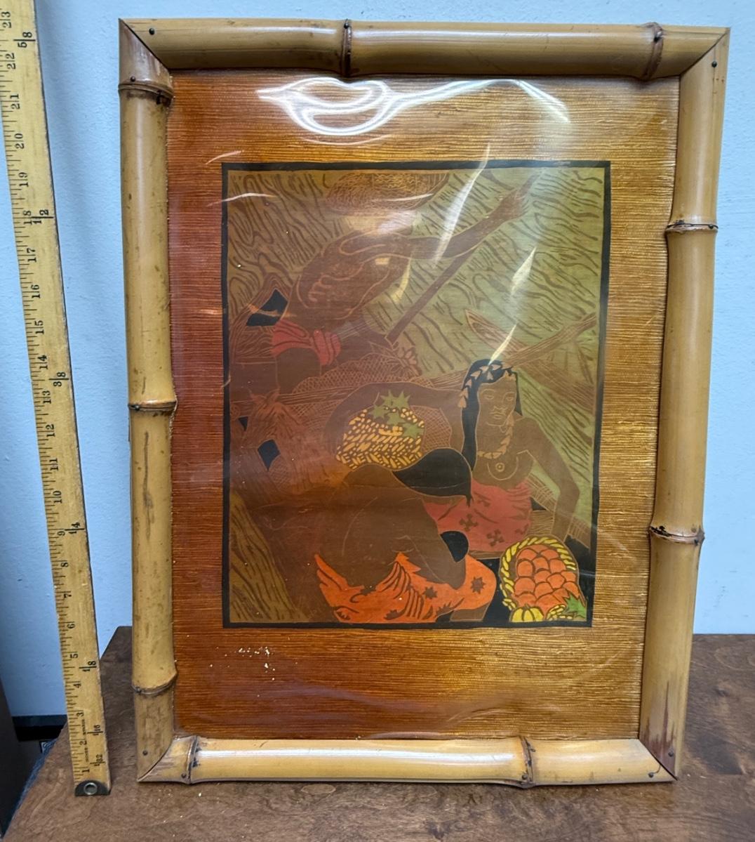 Vintage Chinoserie Japanese or Pacific Island art with bamboo frame on wood oil painting & Marquetry?