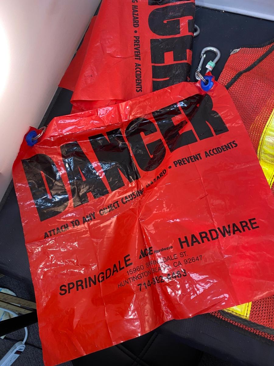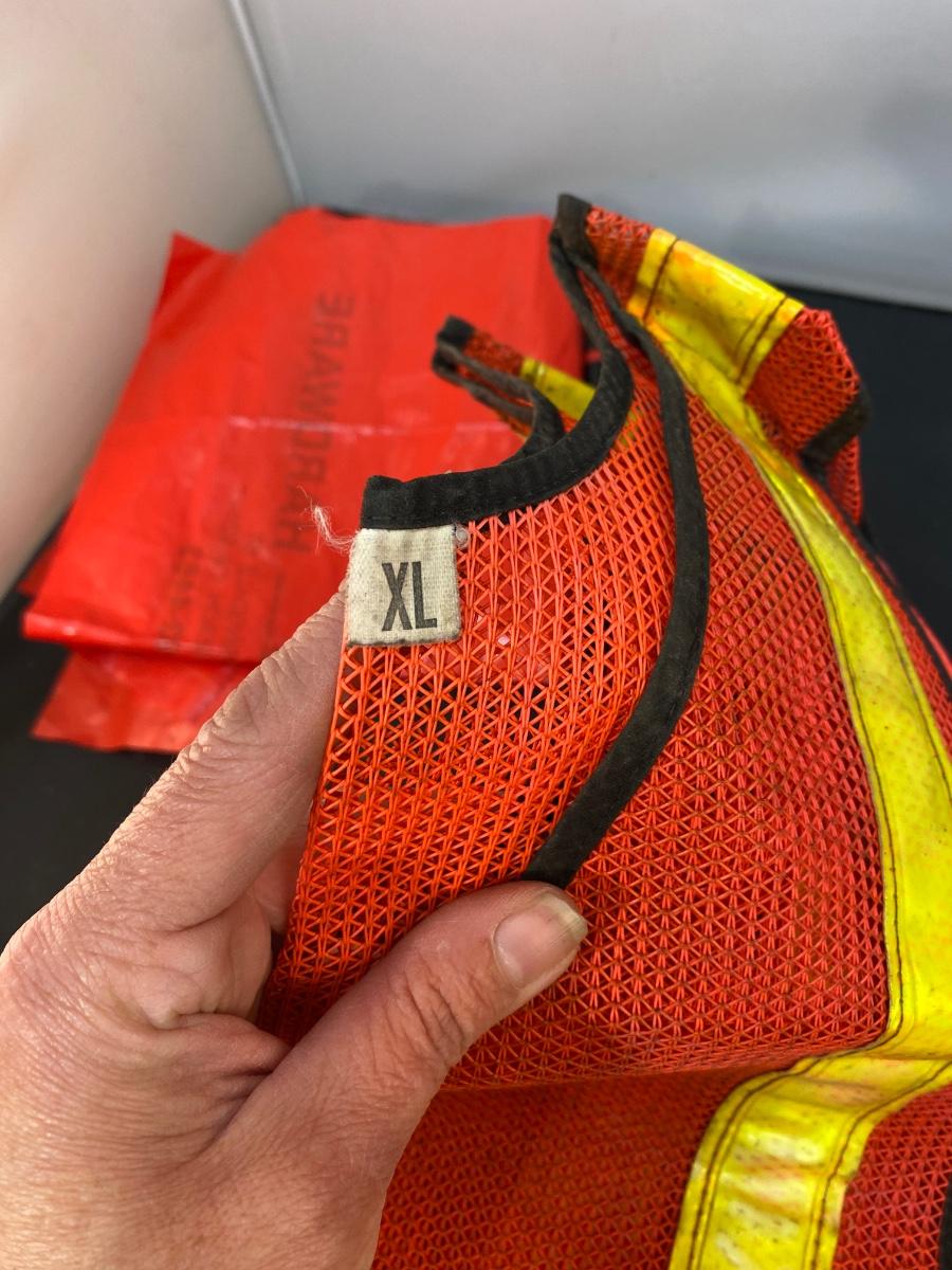 Mixed Lot of Construction Safety Items Vest Red Flags Knee Pads. All in good condition. Red flags have grommets and carabiners to attach to oversized loads. Vest has the most signs of age, size xl.