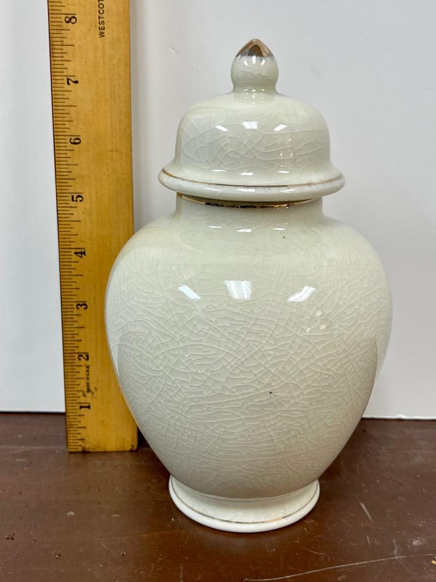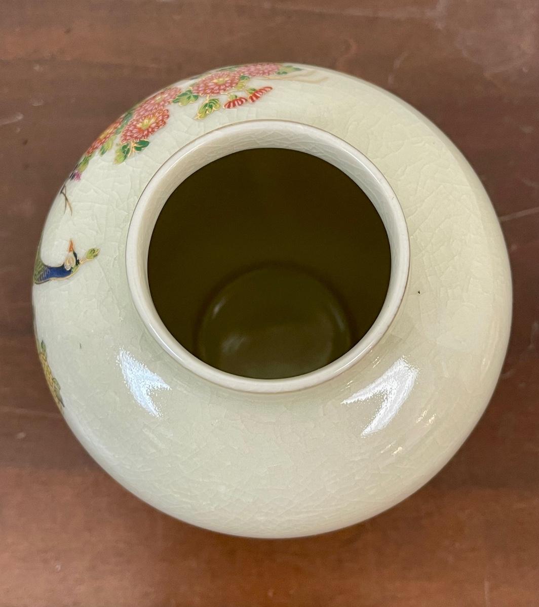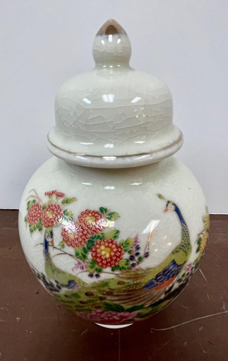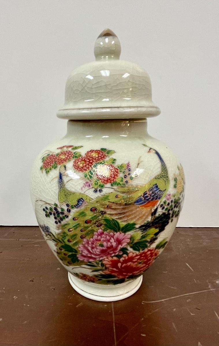 Vintage Japanese Peacock and Flowers Porcelain Ceramic Ginger Pot Urn. Despite the heavy crazing in good condition, displays nice.