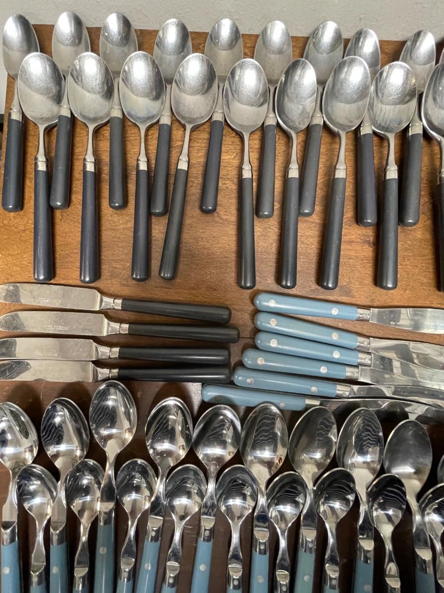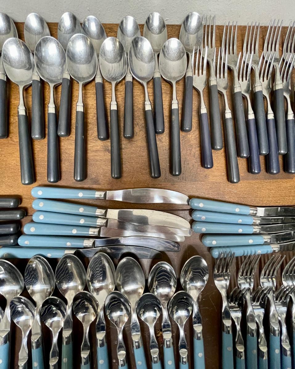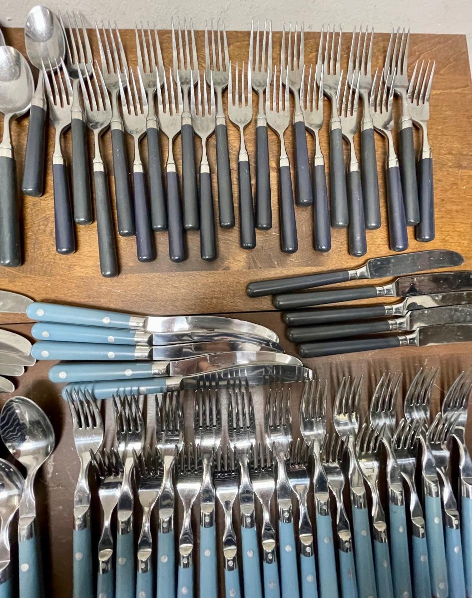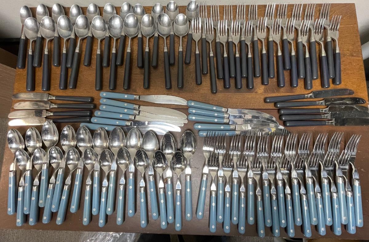 Both sets are in good used condition - a few missing pieces. here are the inventories:. blue set has: 11 knives, 11 large spoons, 10 small spoons, 11 big forks, 10 small forks. Black set has: 9 knives, 10 big spoons, 11 small spoons, 11 big forks, 10 small forks.