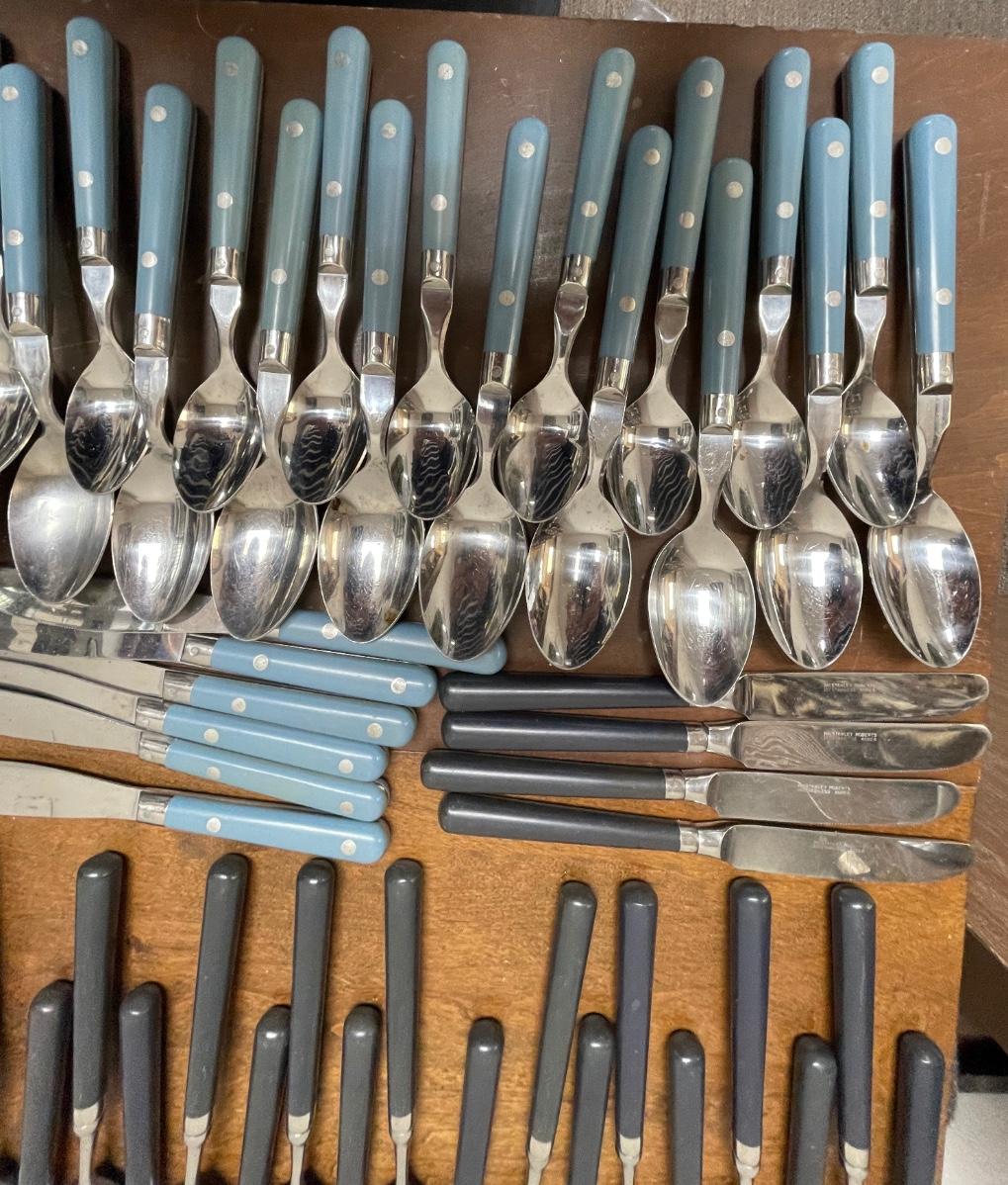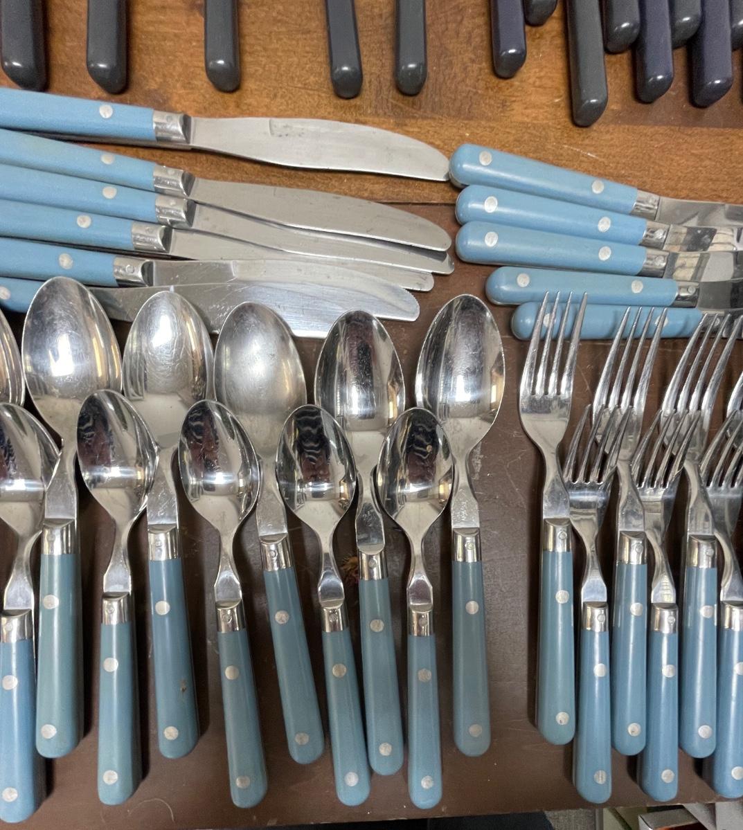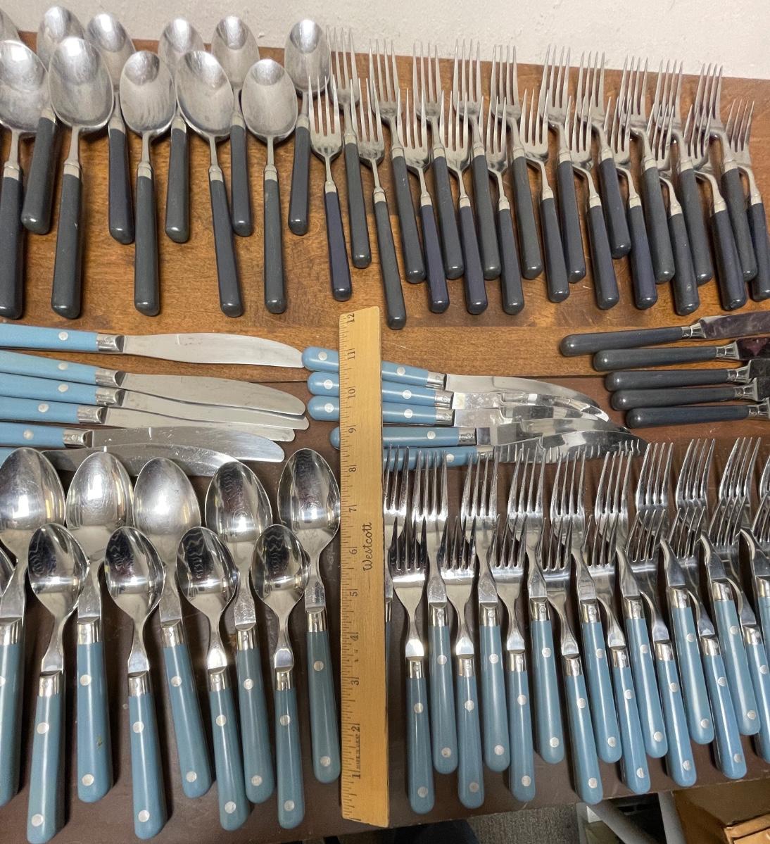 Both sets are in good used condition - a few missing pieces. here are the inventories:. blue set has: 11 knives, 11 large spoons, 10 small spoons, 11 big forks, 10 small forks. Black set has: 9 knives, 10 big spoons, 11 small spoons, 11 big forks, 10 small forks.