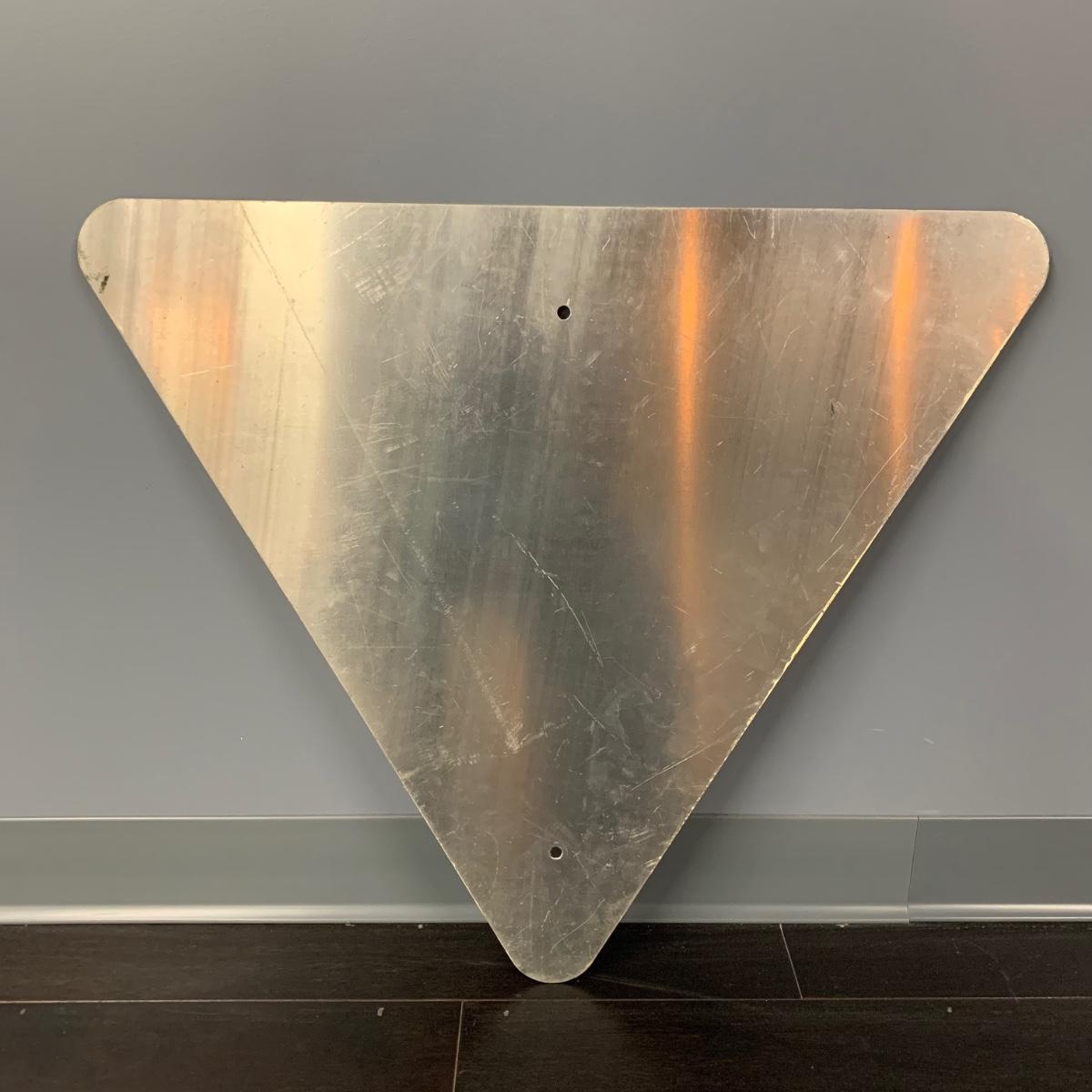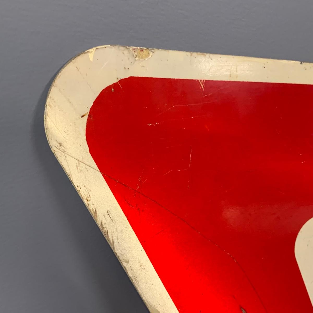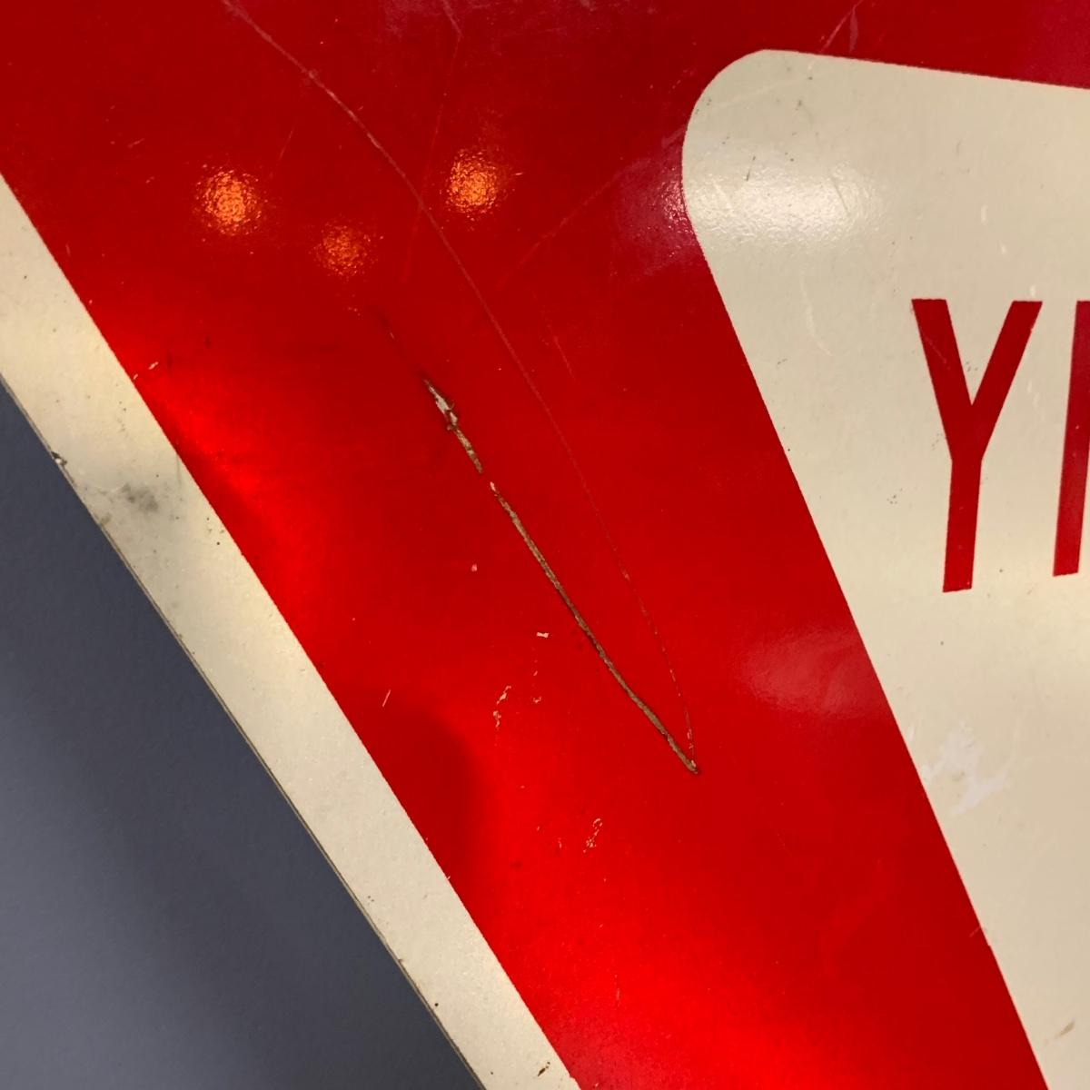 Metal yield sign. Measures 24.5” tall and 27.5” across. Some scratches on the surface. Shipping available.