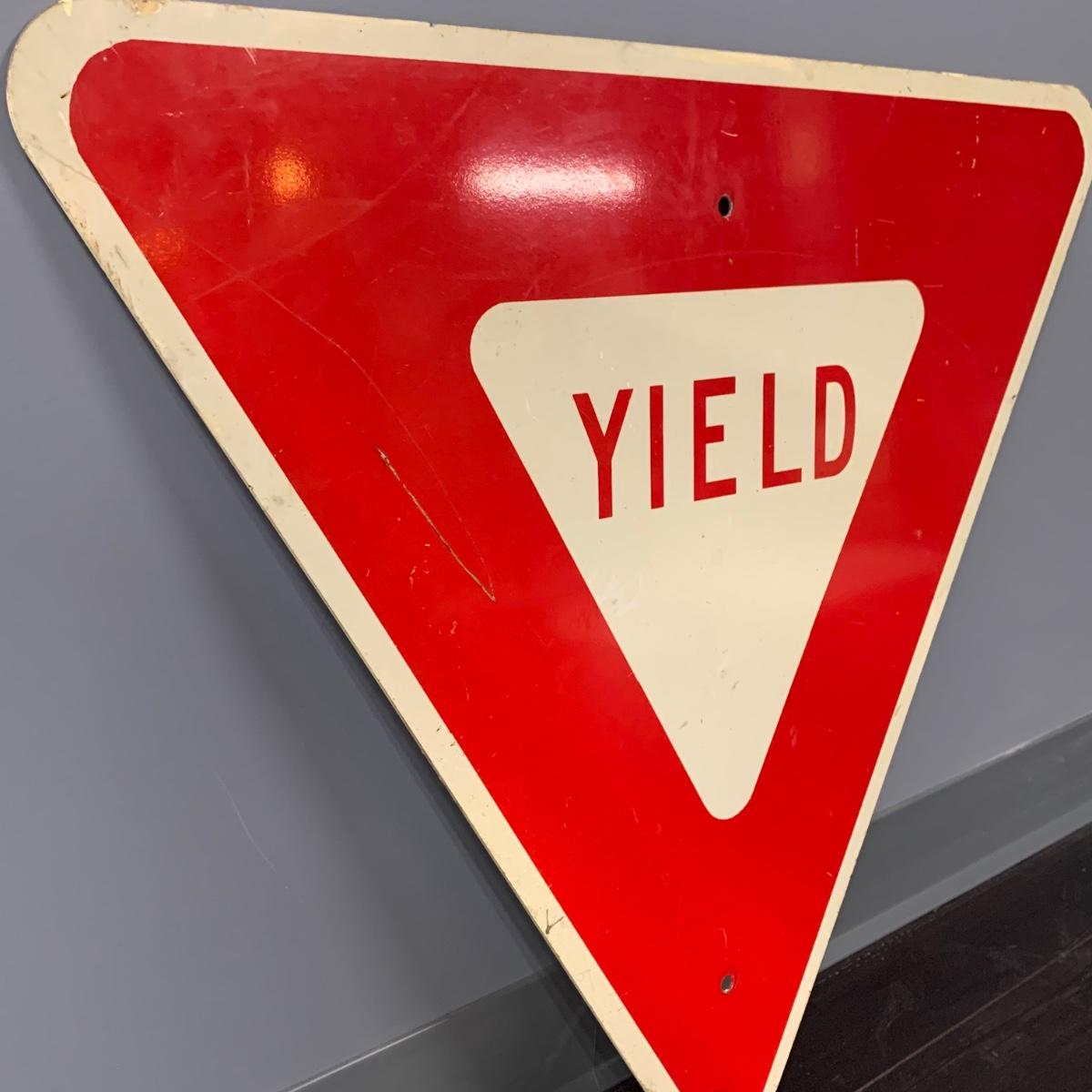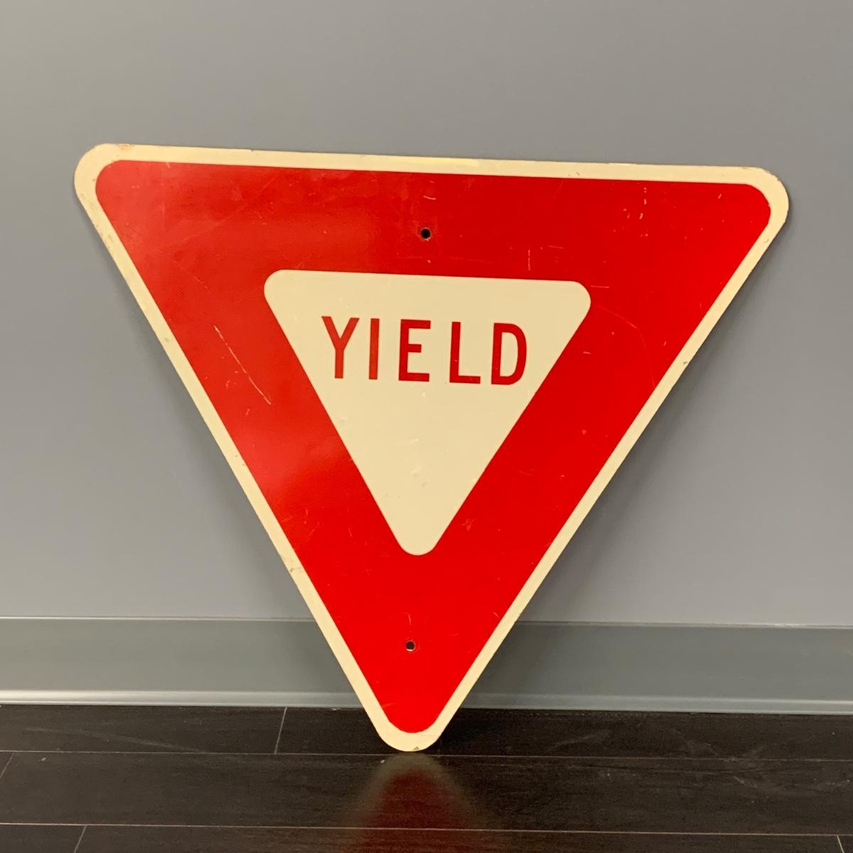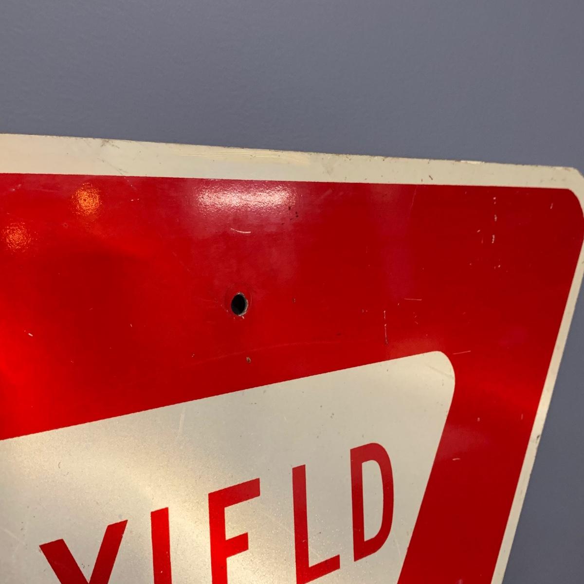 Metal yield sign. Measures 24.5” tall and 27.5” across. Some scratches on the surface. Shipping available.