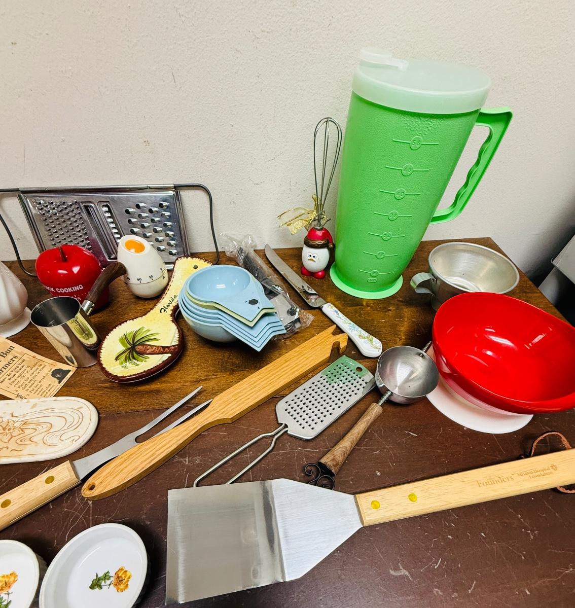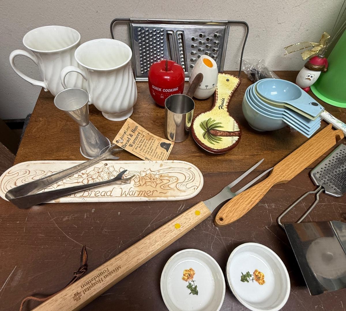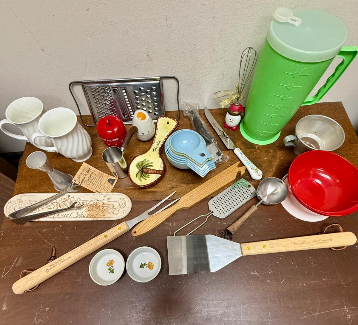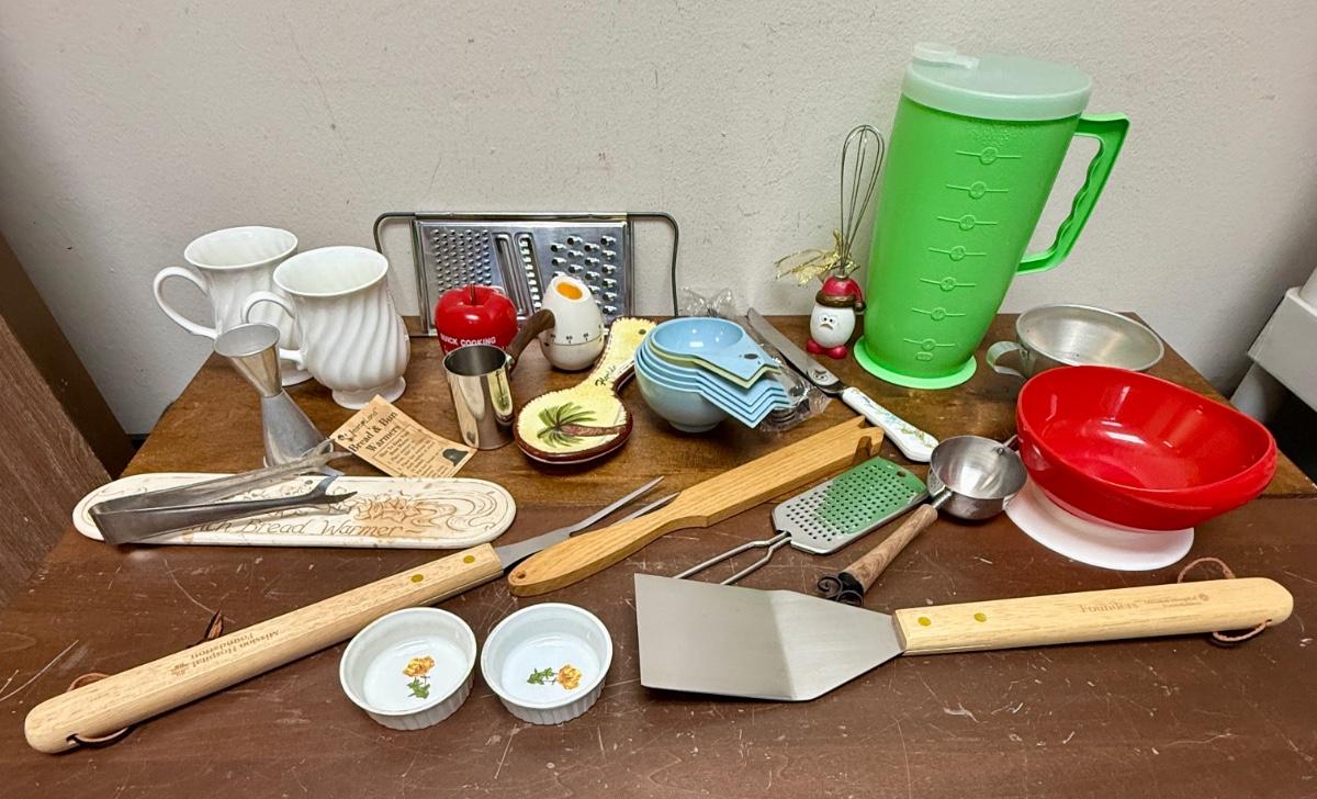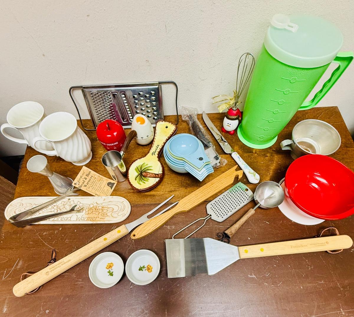 Misc. Vintage Lot - Kitchen tools grater, pitcher, spatulas, measuring cups coffee mugs spoon rest etc