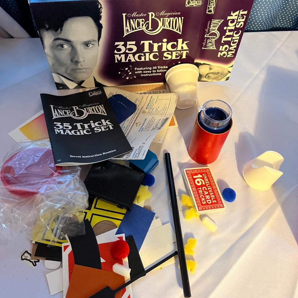 Lot includes Rubik’s cube, Duncan Yo yo, wooden yo yo’s, gyroscope, Two Sears Electronic basketball games, two wooden abacus, slingshots, Lance Burton Magic kit and more. Large abacus measures 20” x 12”. All battery operated items were not tested due to no batteries.