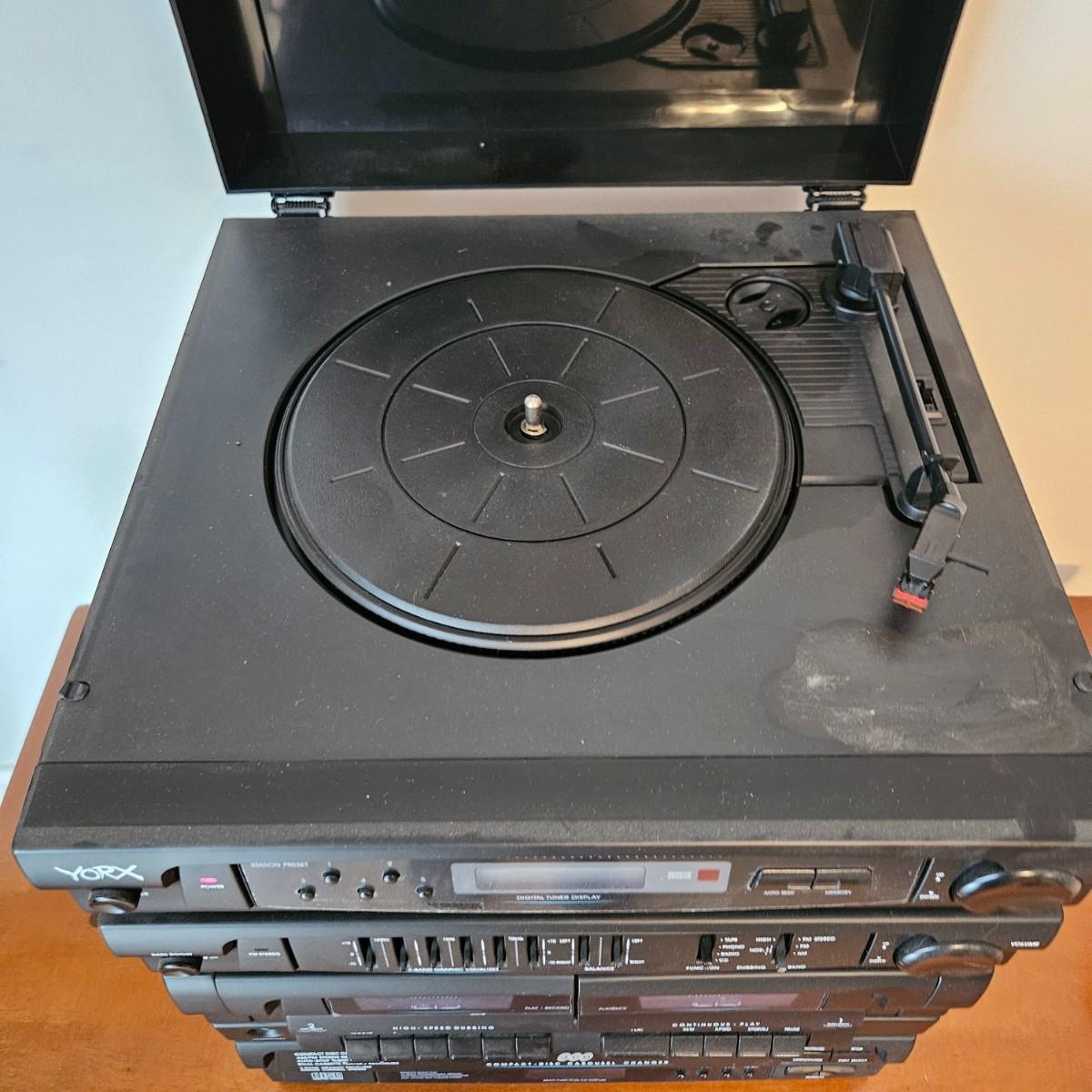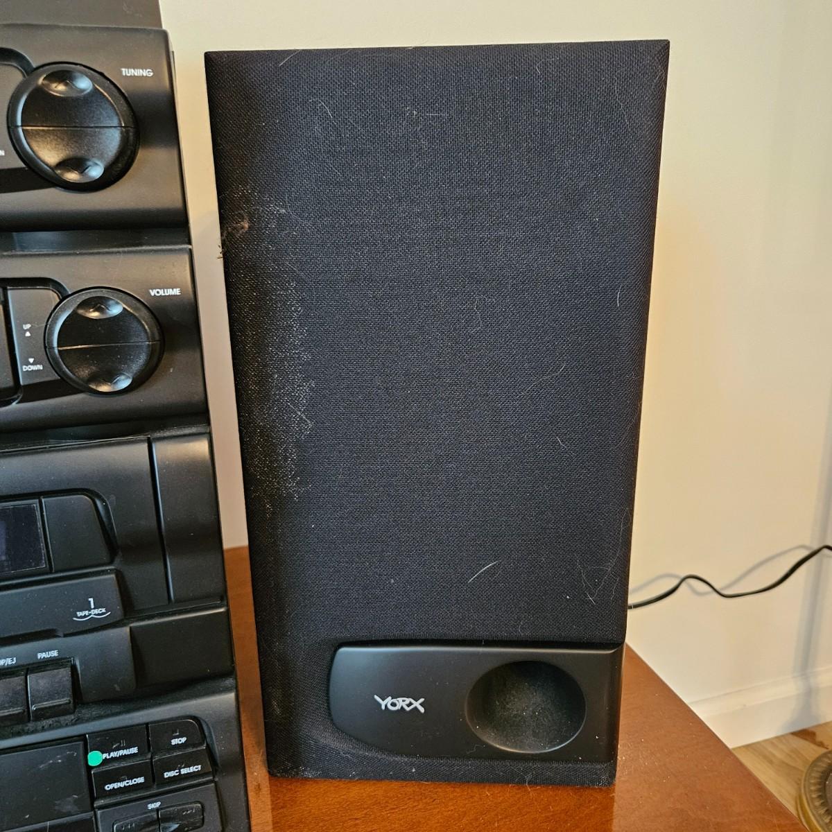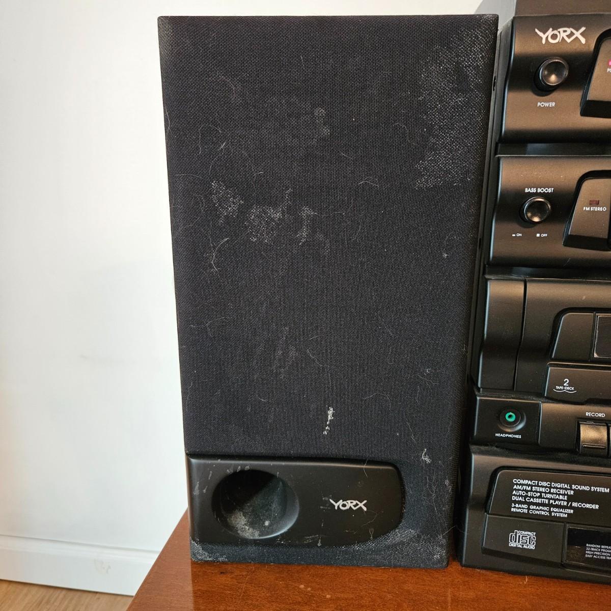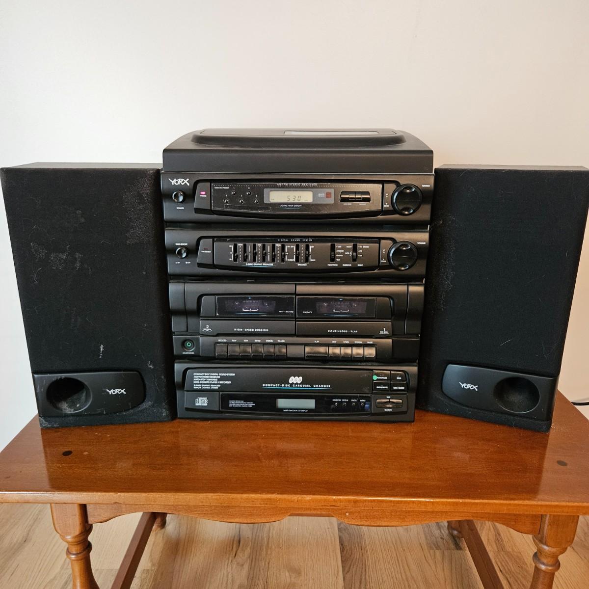 A York stereo and speakers that powered on when plugged in. The stereo has a turntable, radio, tape player, CD player and equalizer. It includes a pair of speakers, remote and the original instructions. It measures approximately 14" x 14" x 17"H. Local pickup only