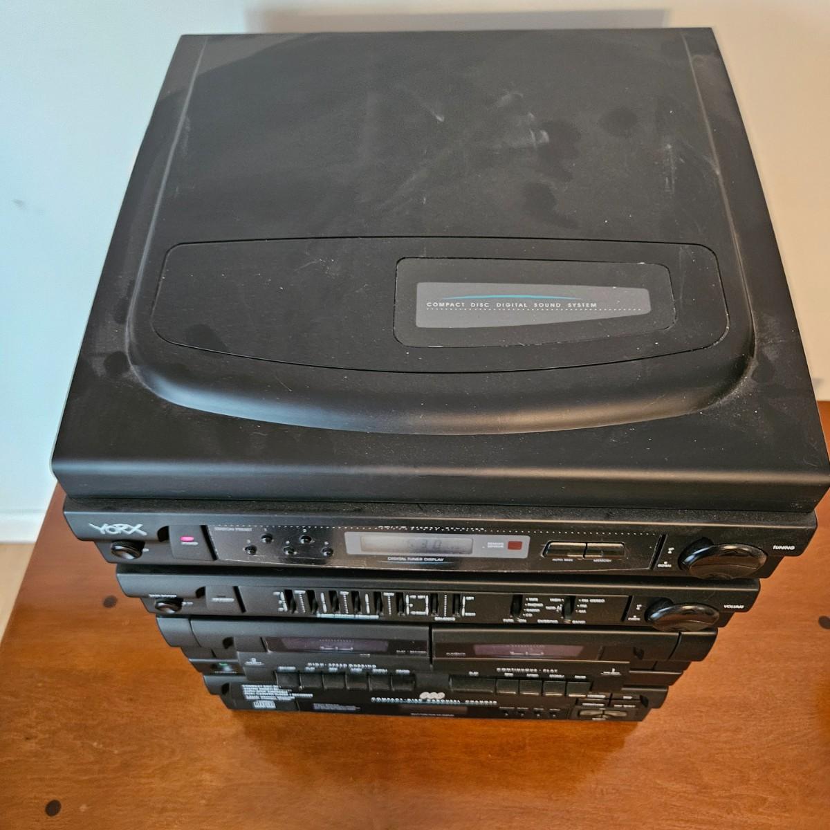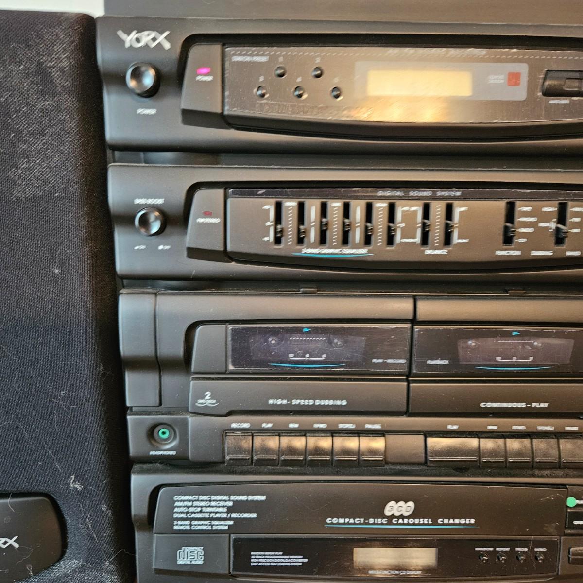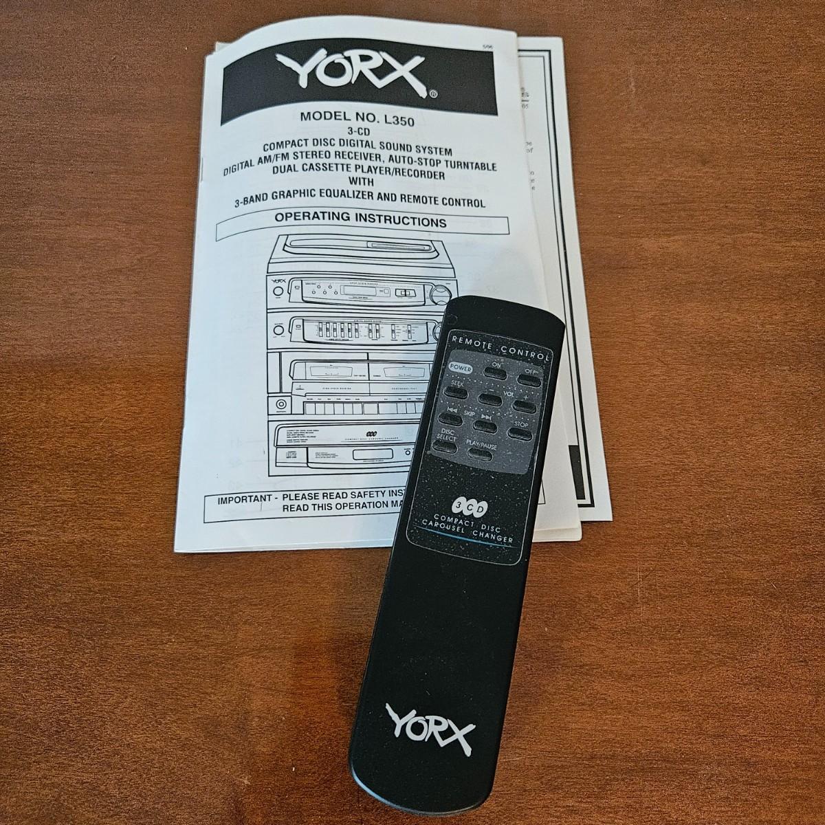 A York stereo and speakers that powered on when plugged in. The stereo has a turntable, radio, tape player, CD player and equalizer. It includes a pair of speakers, remote and the original instructions. It measures approximately 14" x 14" x 17"H. Local pickup only