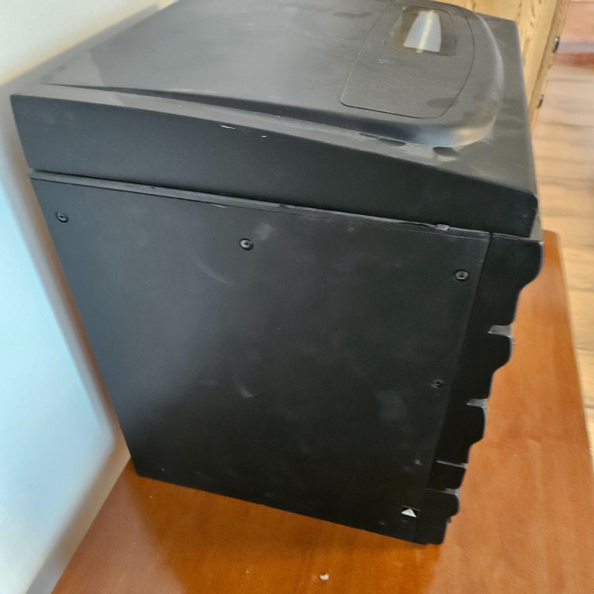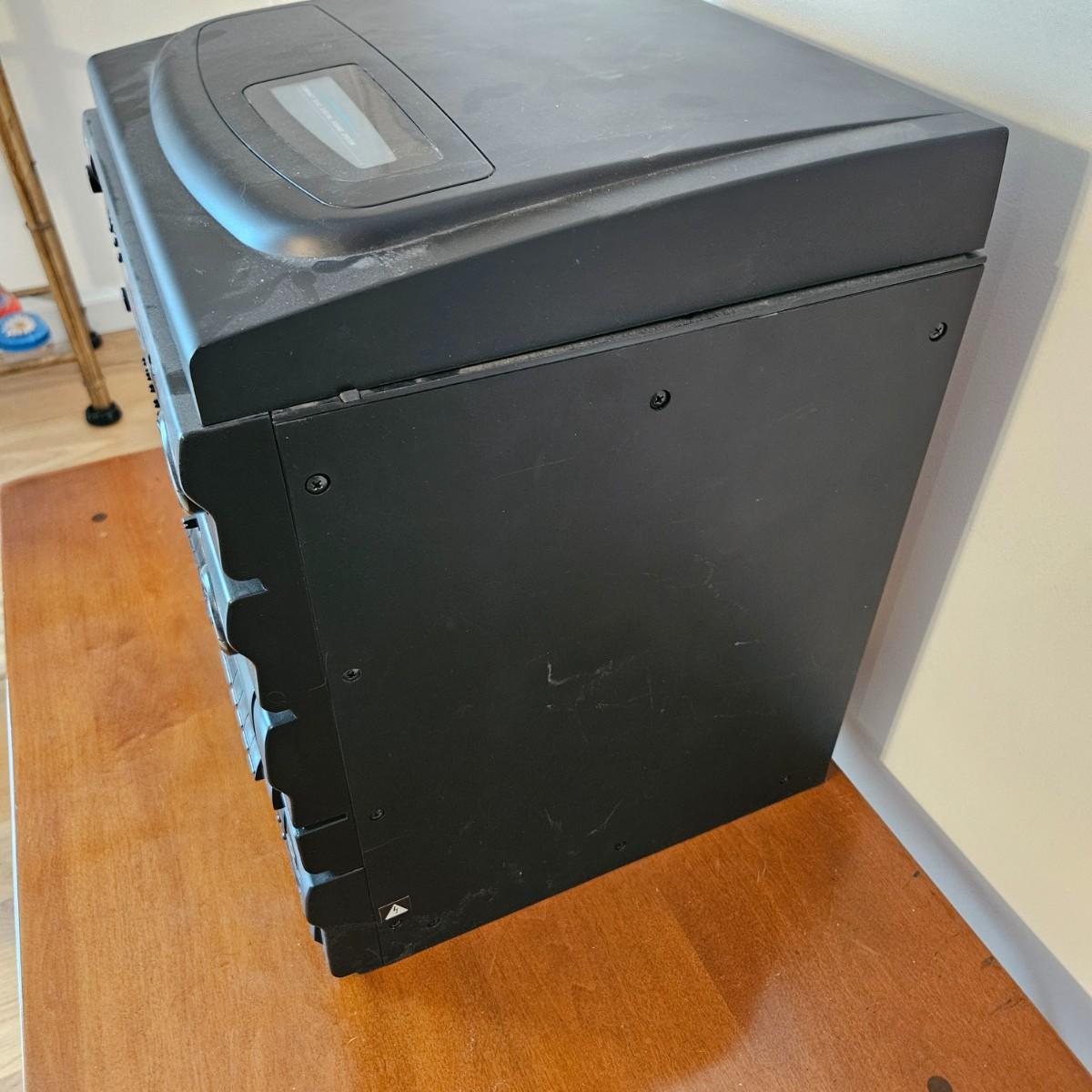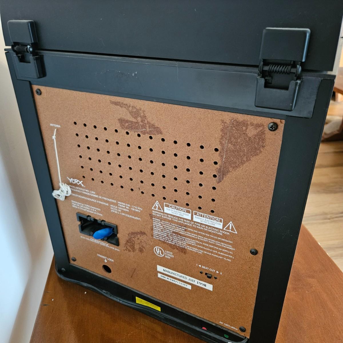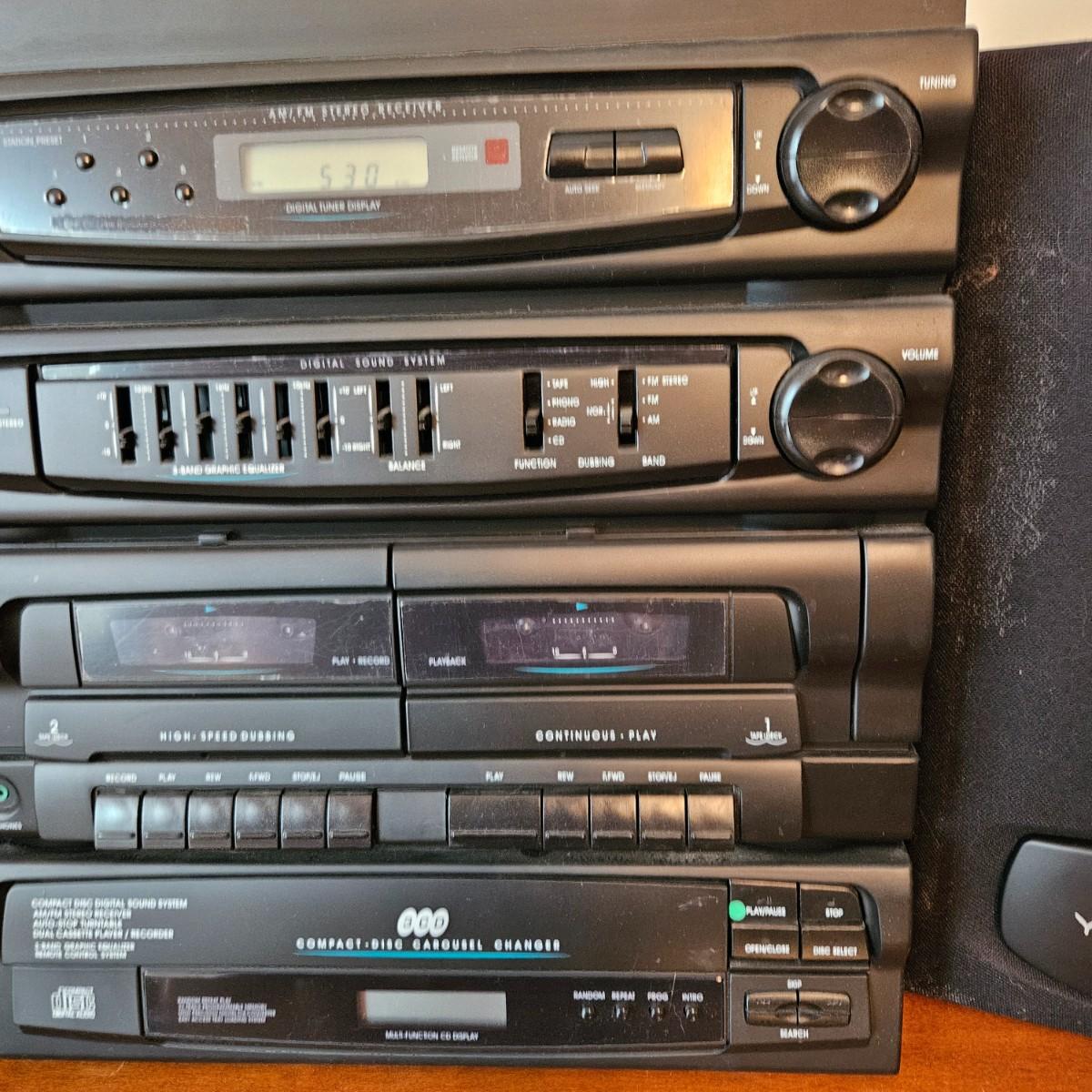 A York stereo and speakers that powered on when plugged in. The stereo has a turntable, radio, tape player, CD player and equalizer. It includes a pair of speakers, remote and the original instructions. It measures approximately 14" x 14" x 17"H. Local pickup only