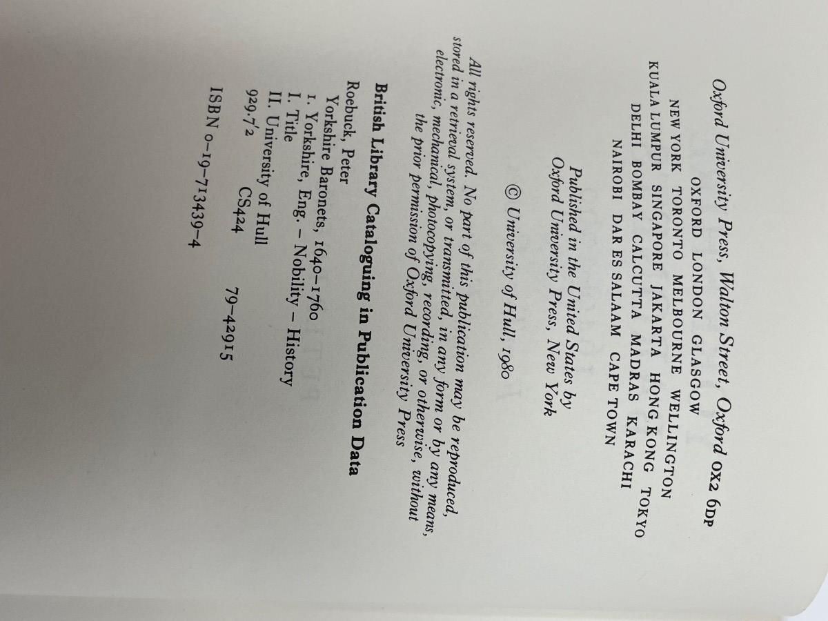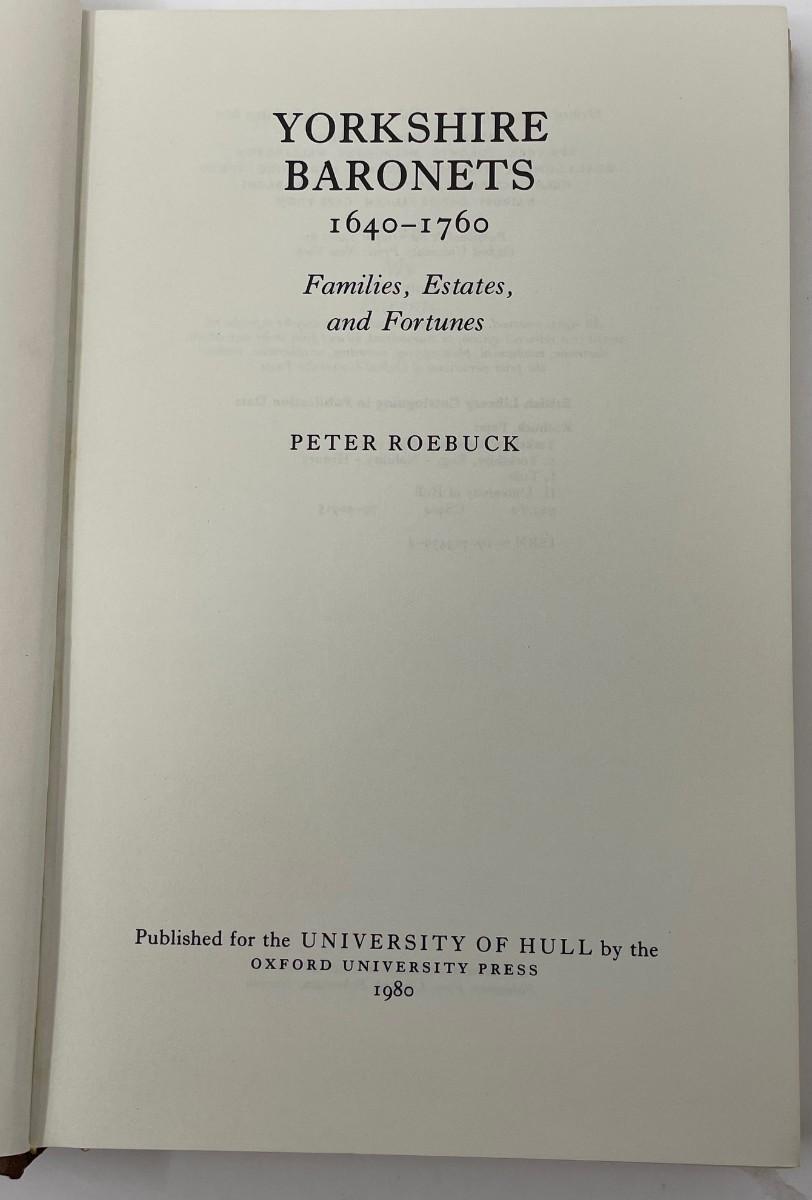 Description: Yorkshire Baronets 1640-1760 Families, Estates & Fortunes by Peter Roebuck copyright 1980; Material: Paper