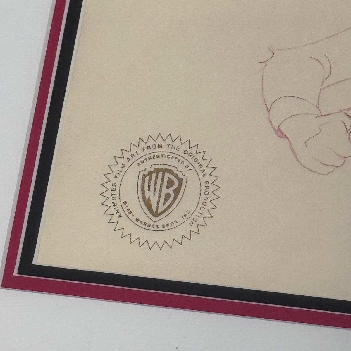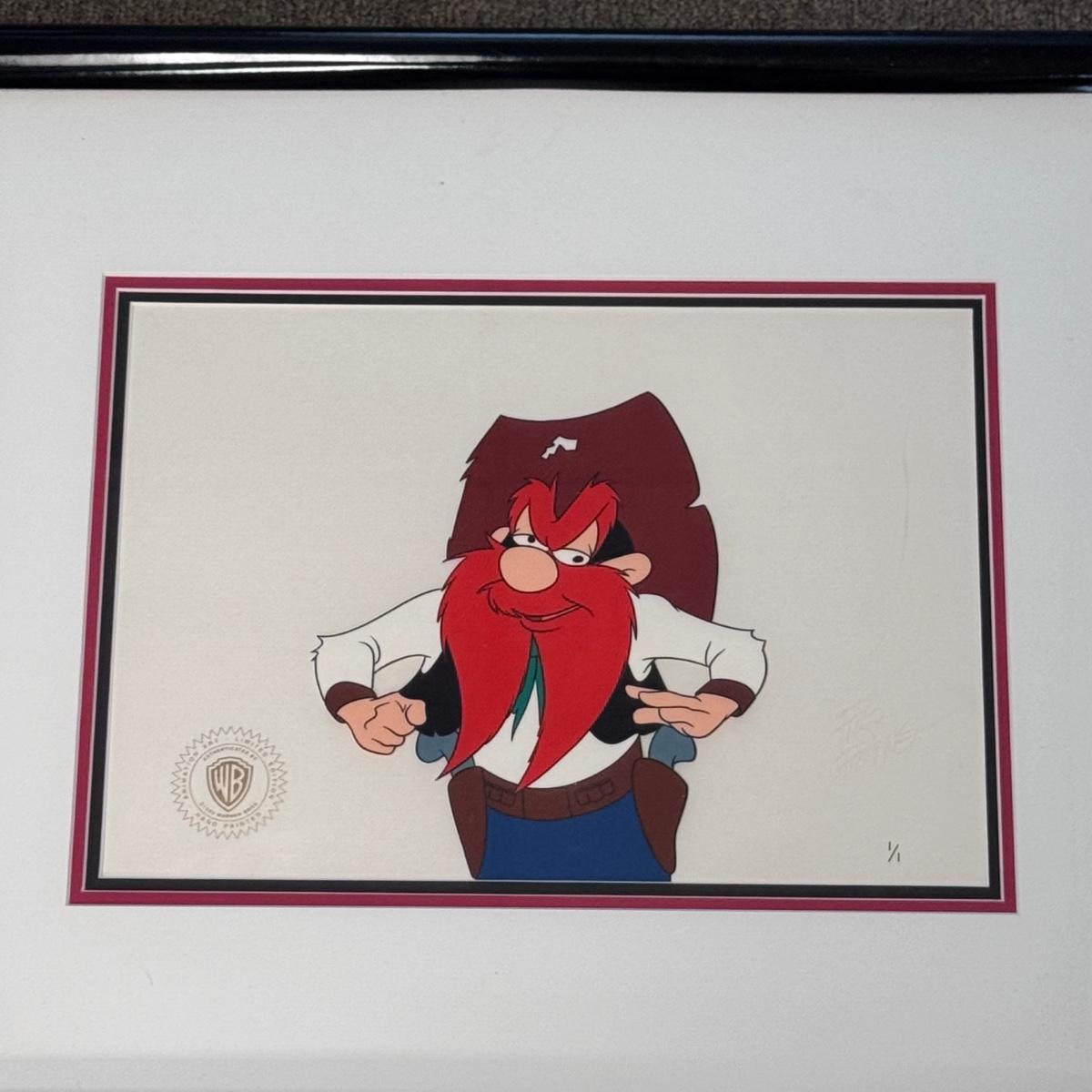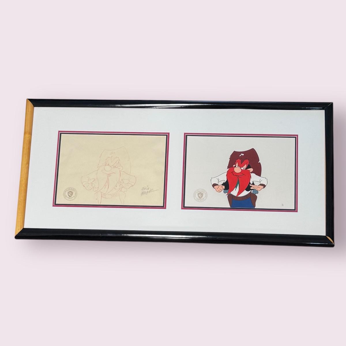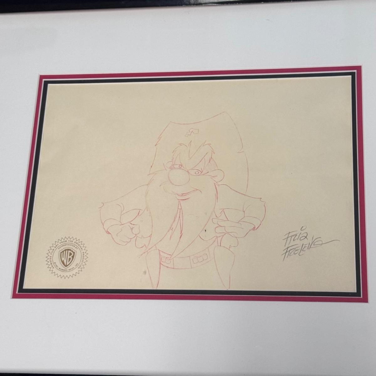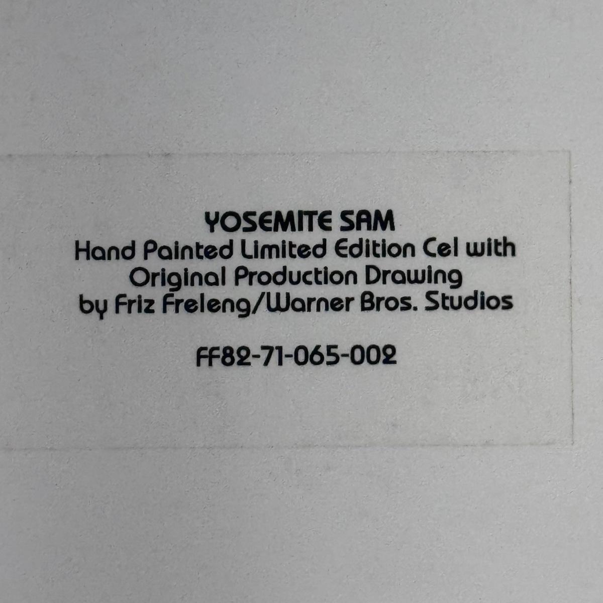 This lot includes one Warner Bro’s cel titled “Yosemite Sam.” The sketch on the left side is by Friz Freleng. On the right side, the art is numbered 1/1 and stamped with Warner Bro’s stamp. On the left, you’ll find a sketch that appears to be signed by Friz Freleng and stamped with Warner Bro’s. The art is protected with a plastic layer, three mattings, and a wooden frame. The frame has a black plastic protective layer that is removable - it appears to be falling off - see picture included. The frame measures 35” x 17”H. The original invoice is included - see last picture included.