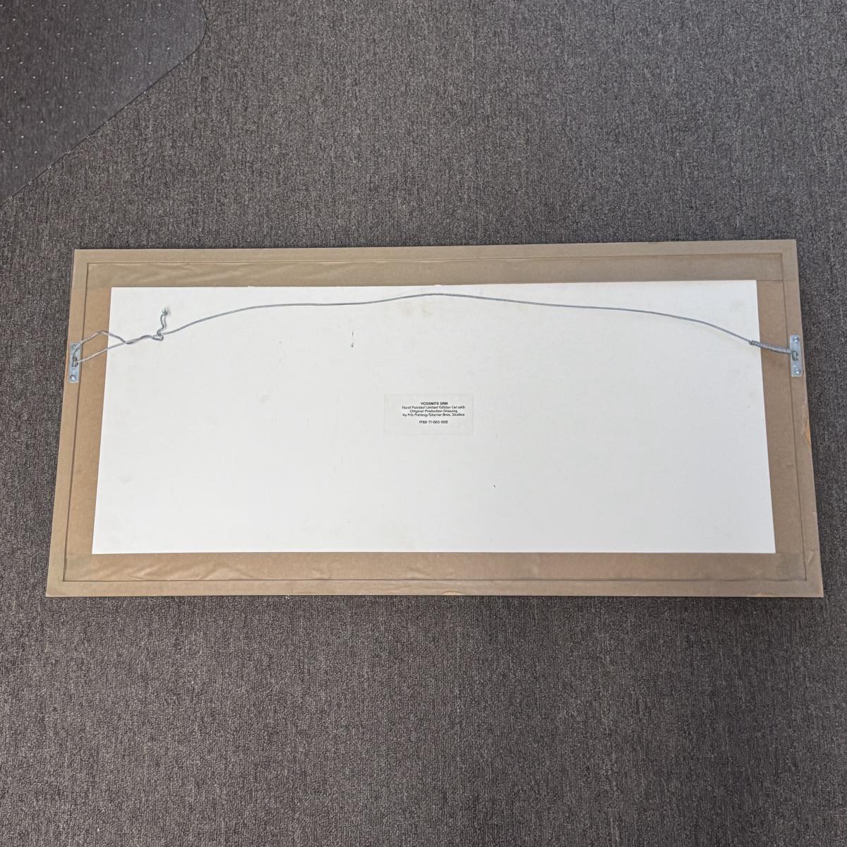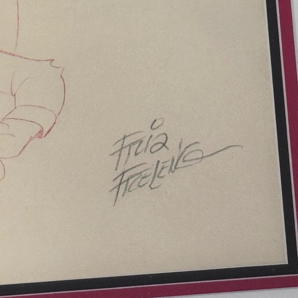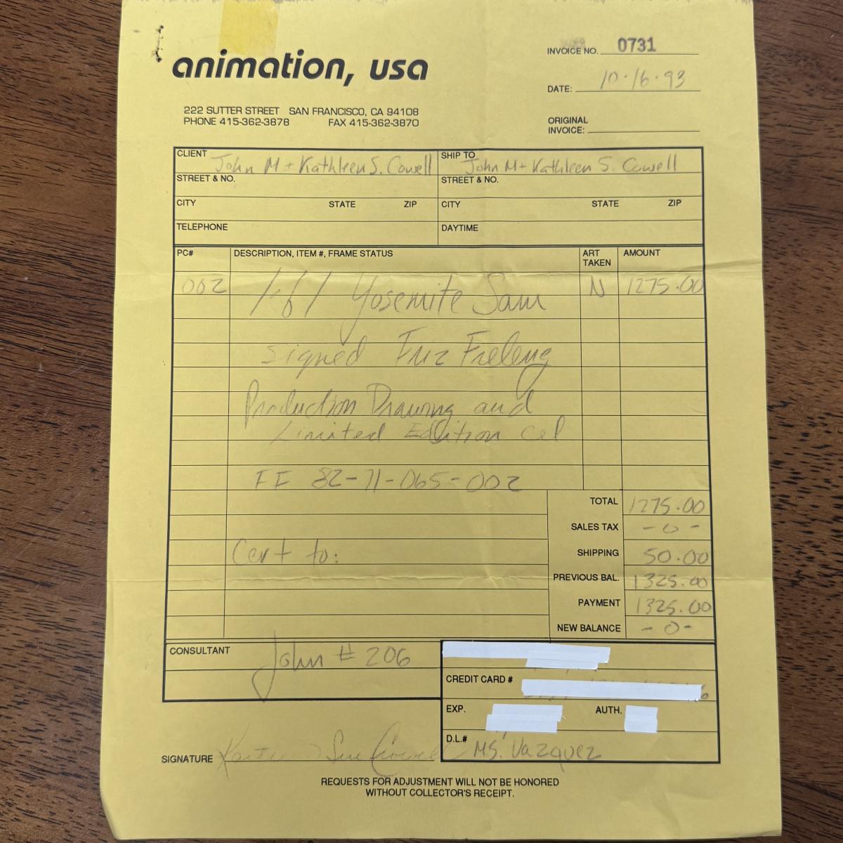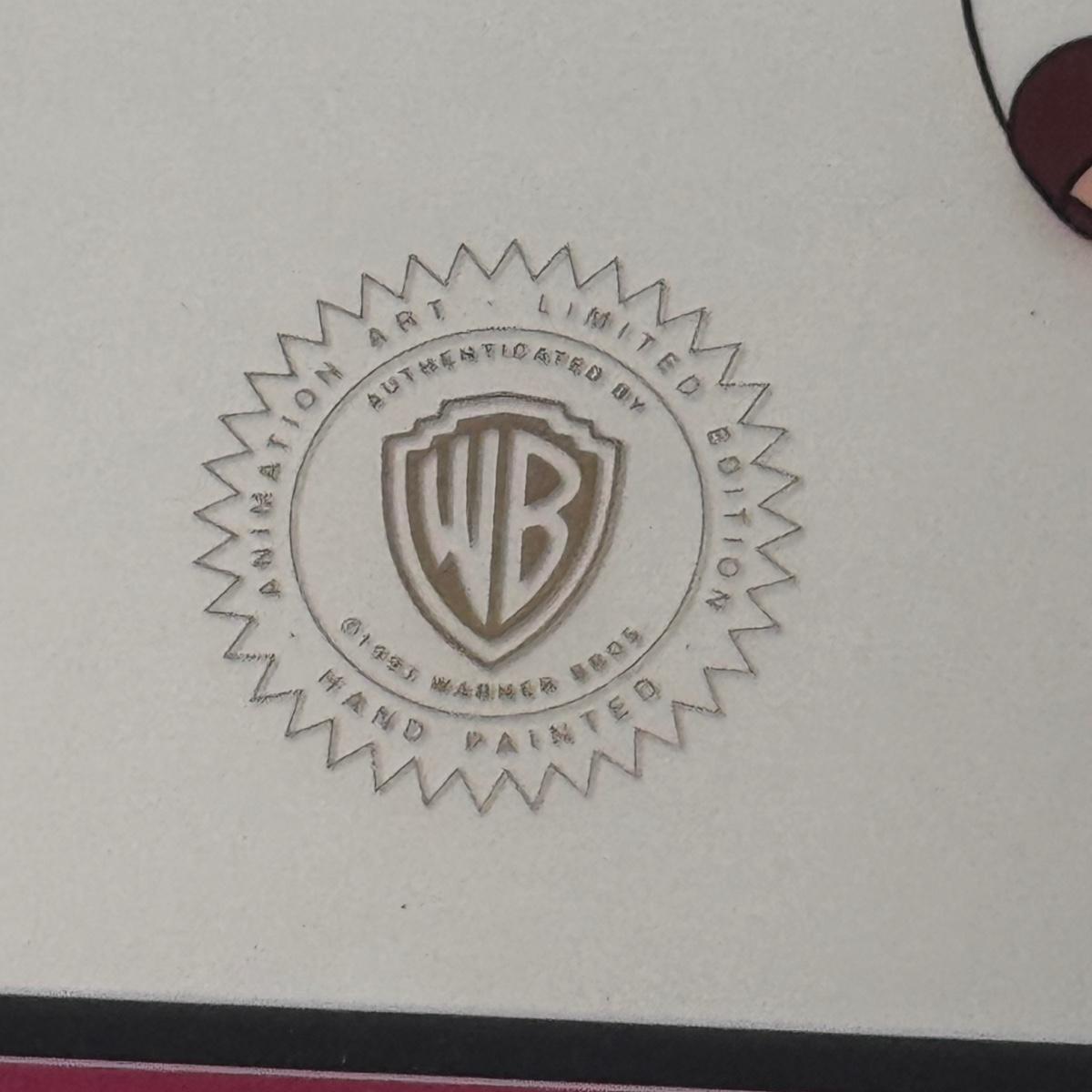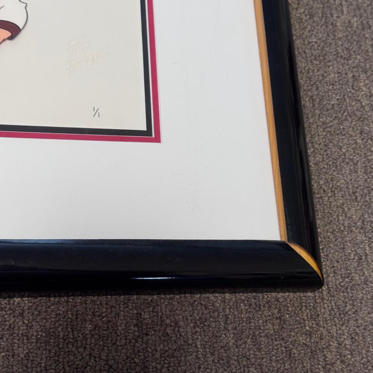 This lot includes one Warner Bro’s cel titled “Yosemite Sam.” The sketch on the left side is by Friz Freleng. On the right side, the art is numbered 1/1 and stamped with Warner Bro’s stamp. On the left, you’ll find a sketch that appears to be signed by Friz Freleng and stamped with Warner Bro’s. The art is protected with a plastic layer, three mattings, and a wooden frame. The frame has a black plastic protective layer that is removable - it appears to be falling off - see picture included. The frame measures 35” x 17”H. The original invoice is included - see last picture included.
