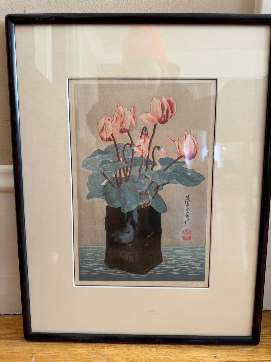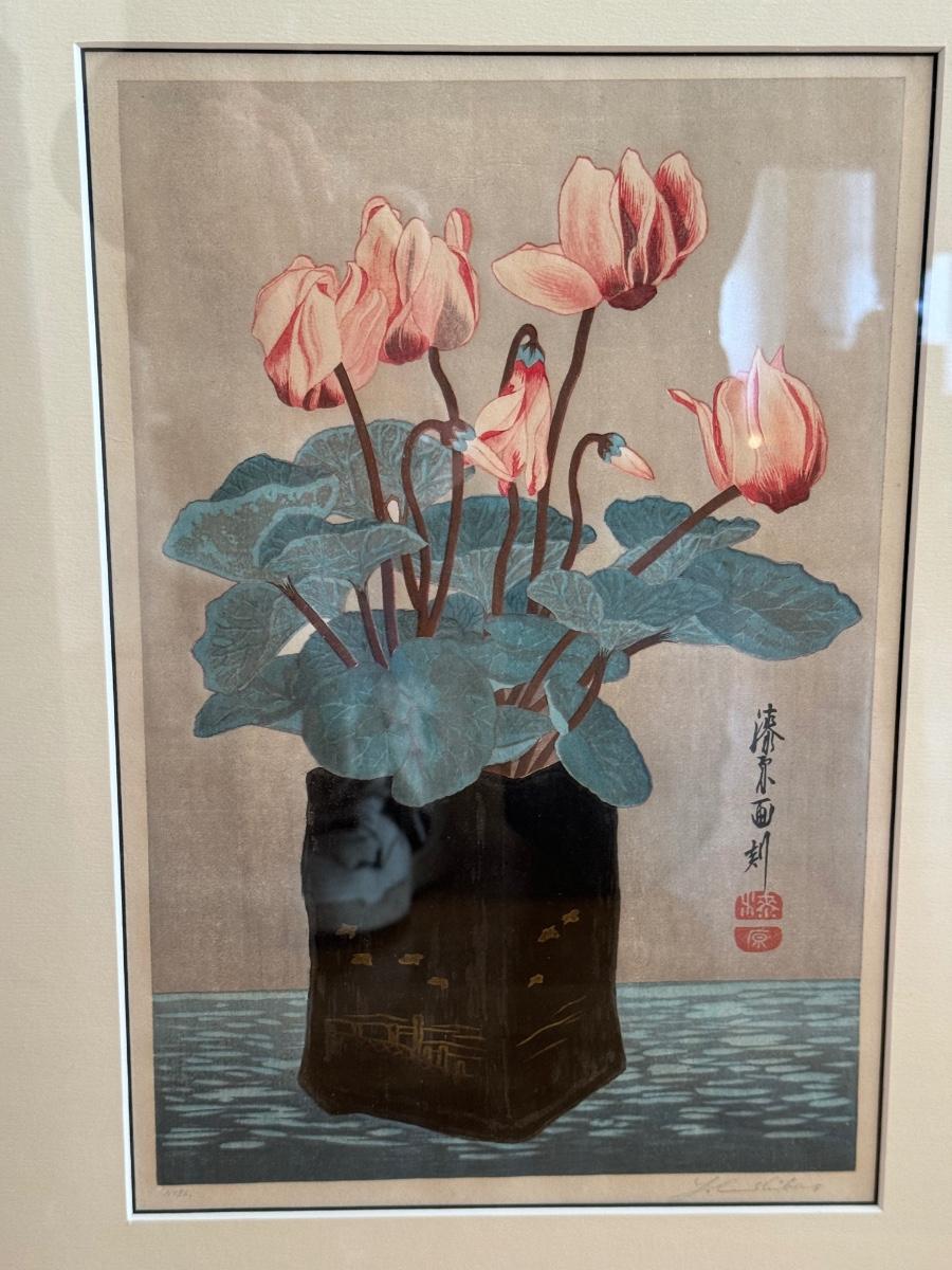 Yoshijuro Urushibara, Cyclamen, woodcut, signed, #86, 19.5” T x 15” W