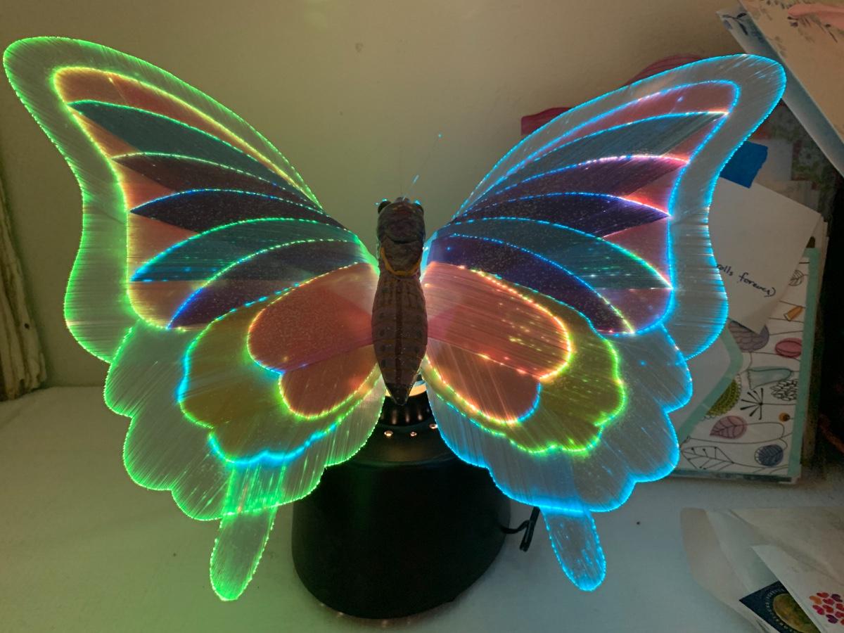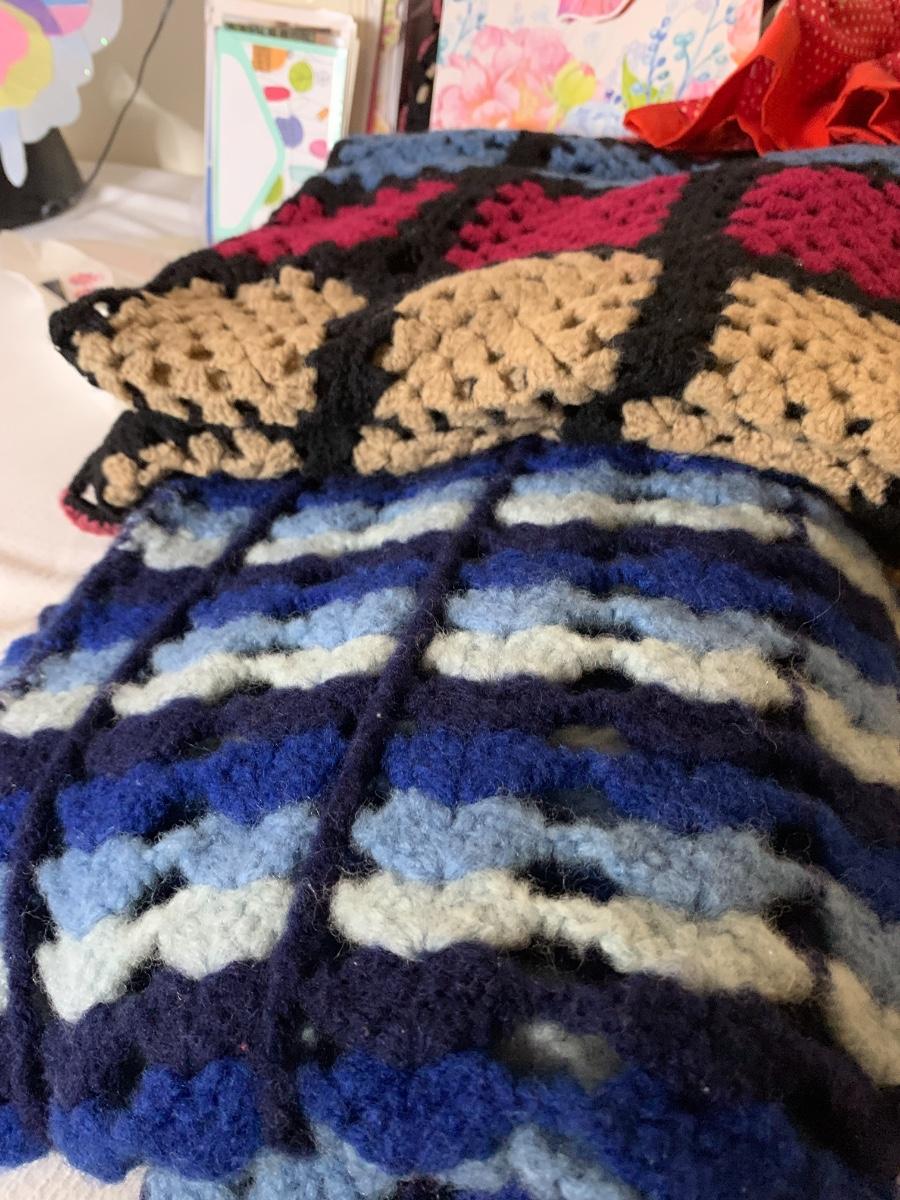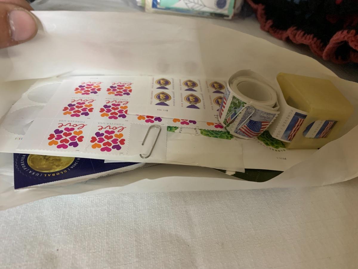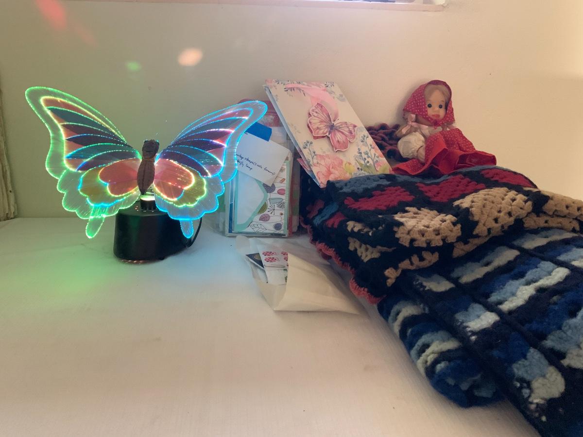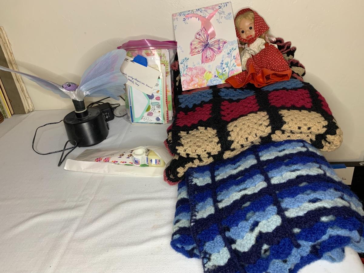 Includes 2 vintage afghans, a doll, fiber optic butterfly lamp, bag of greeting cards and envelope full of USPS Forever stamps.