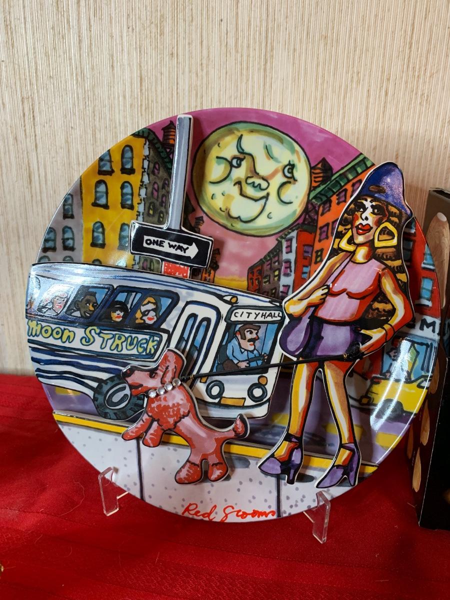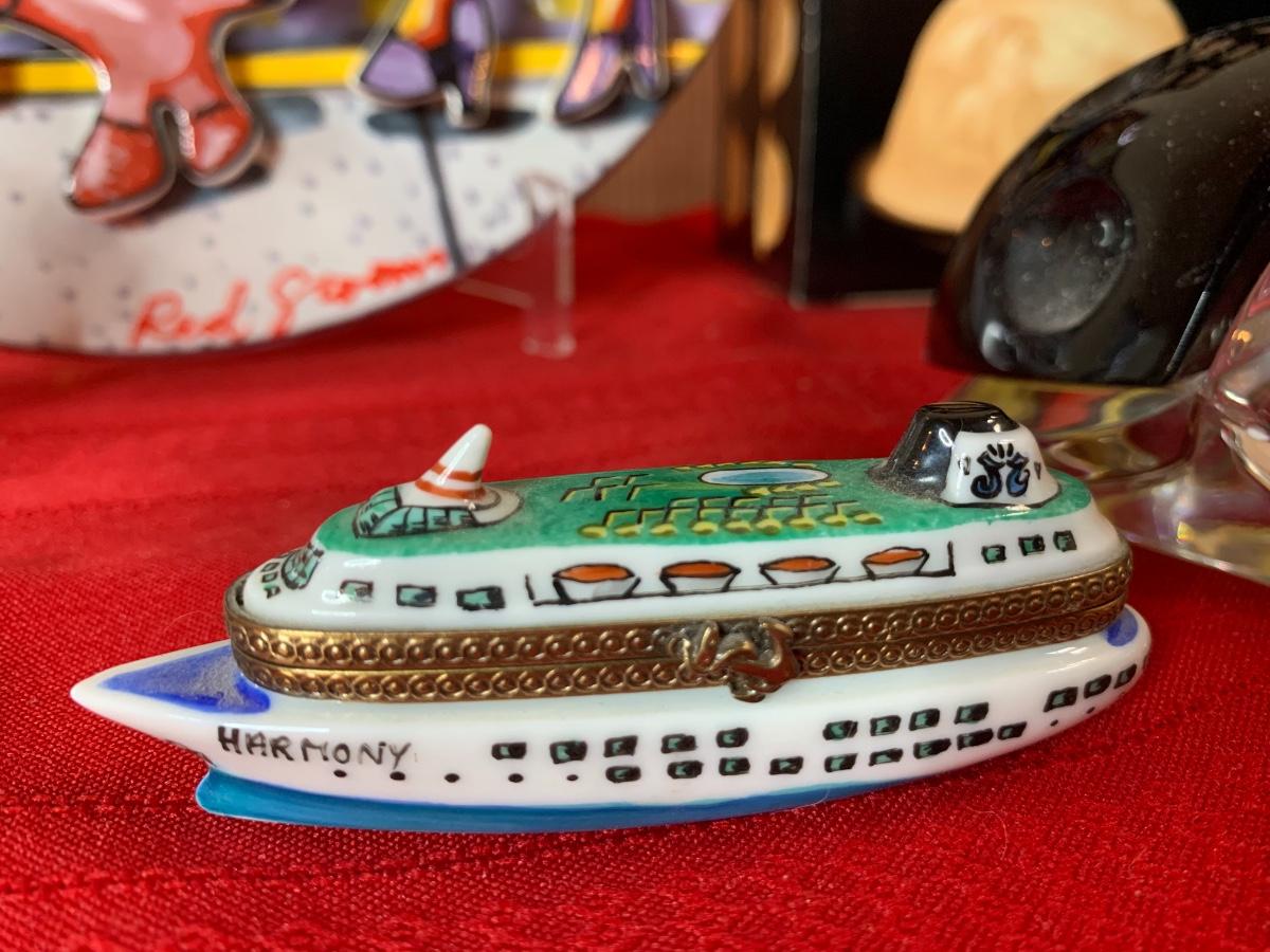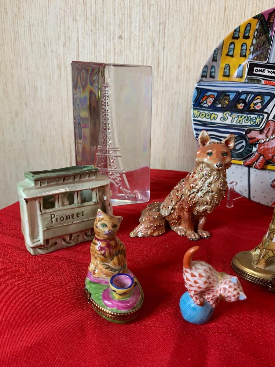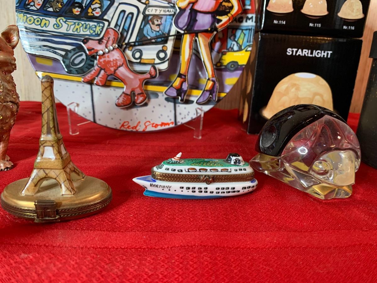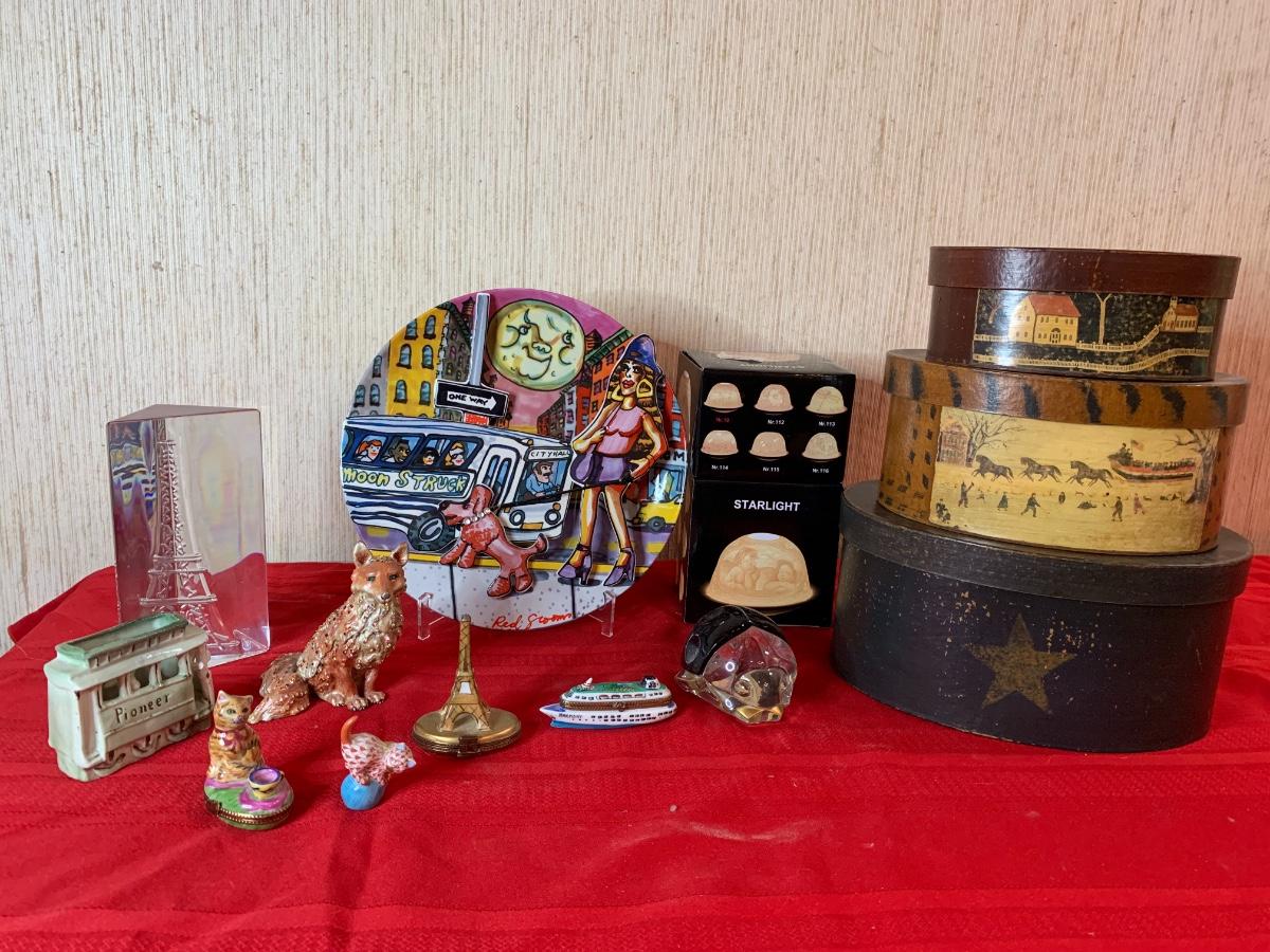Misc decor pieces including 3 old hat boxes, one Red Grooms plate, two starlights and misc miniature trinkets