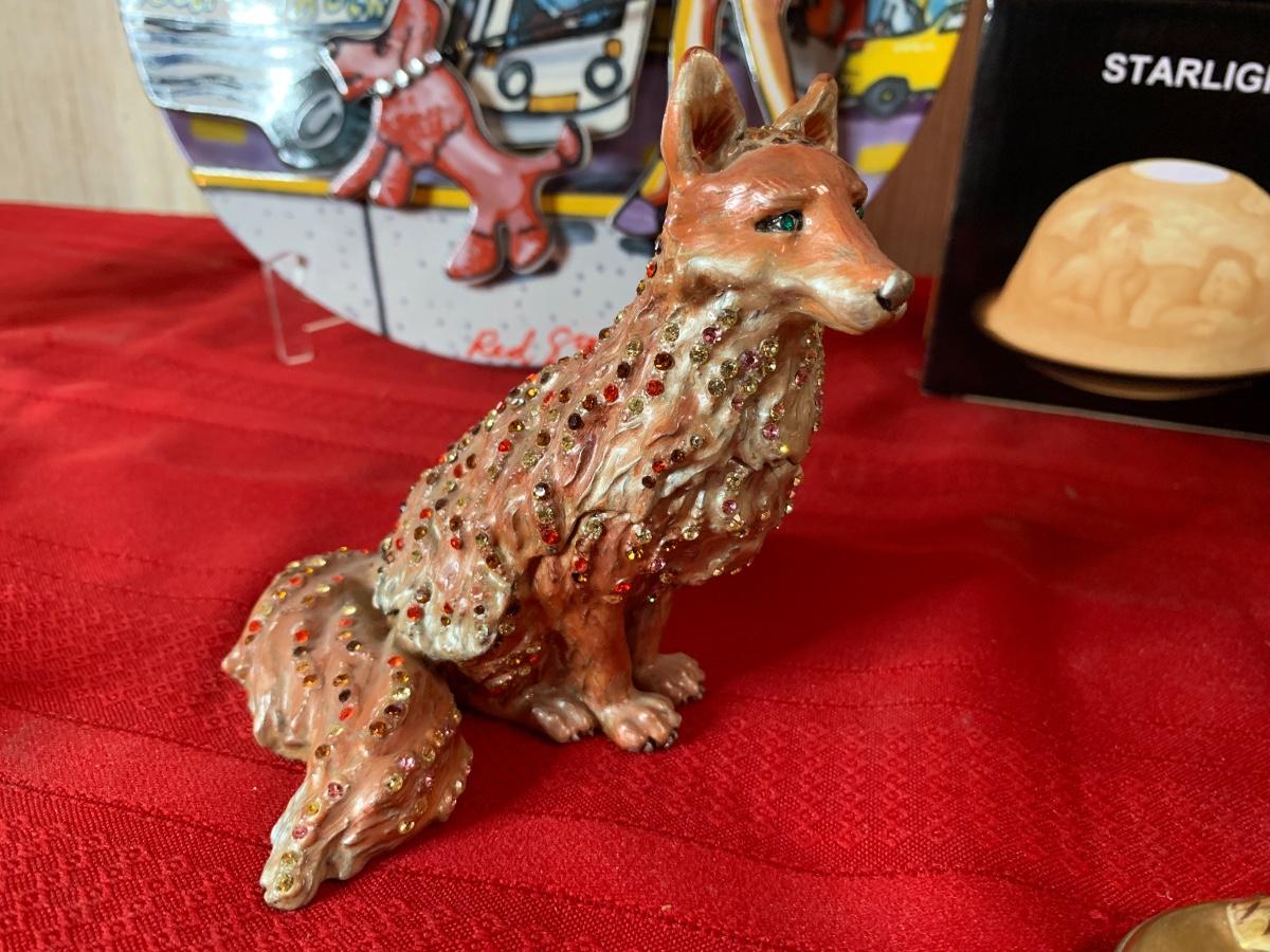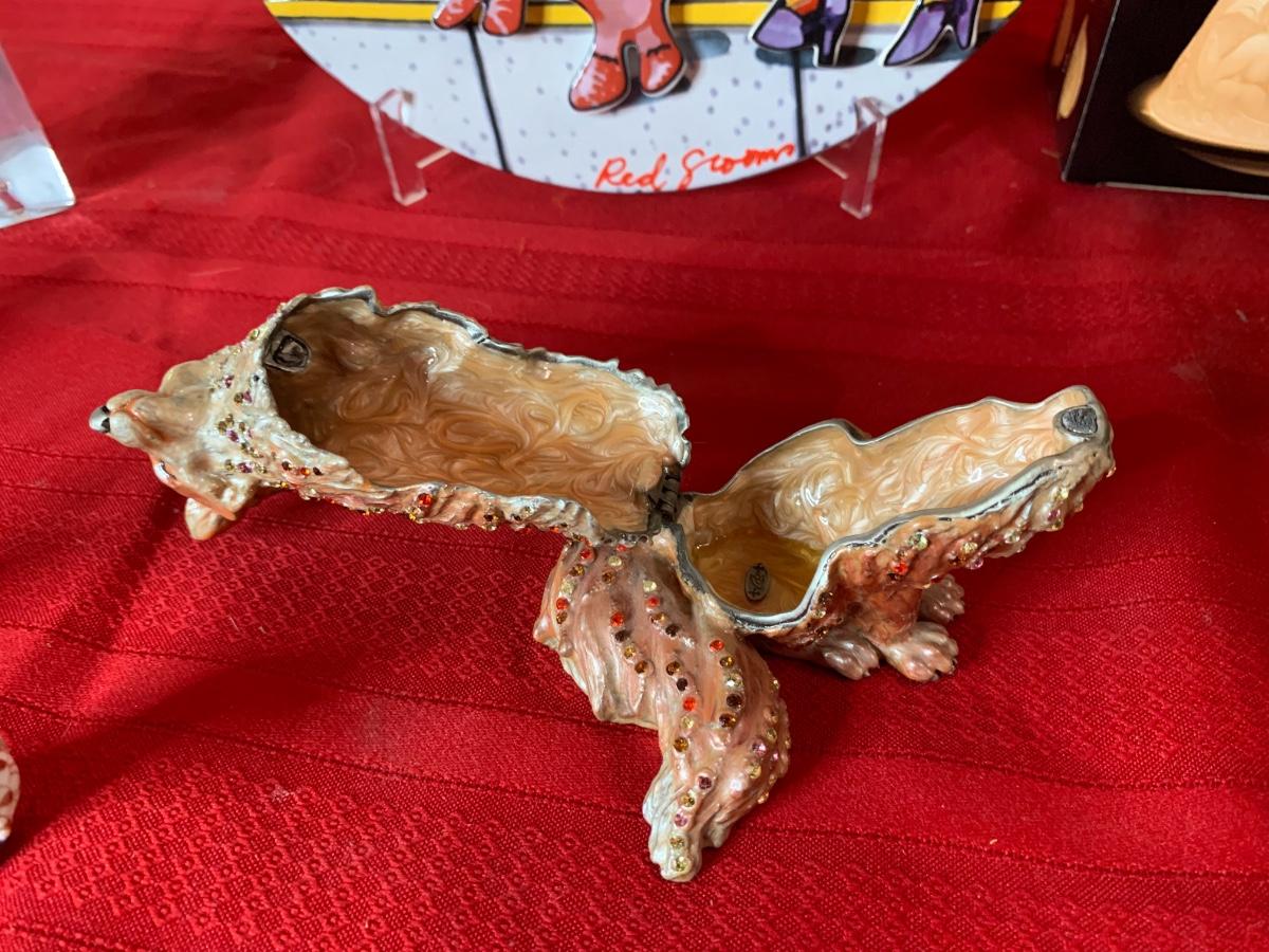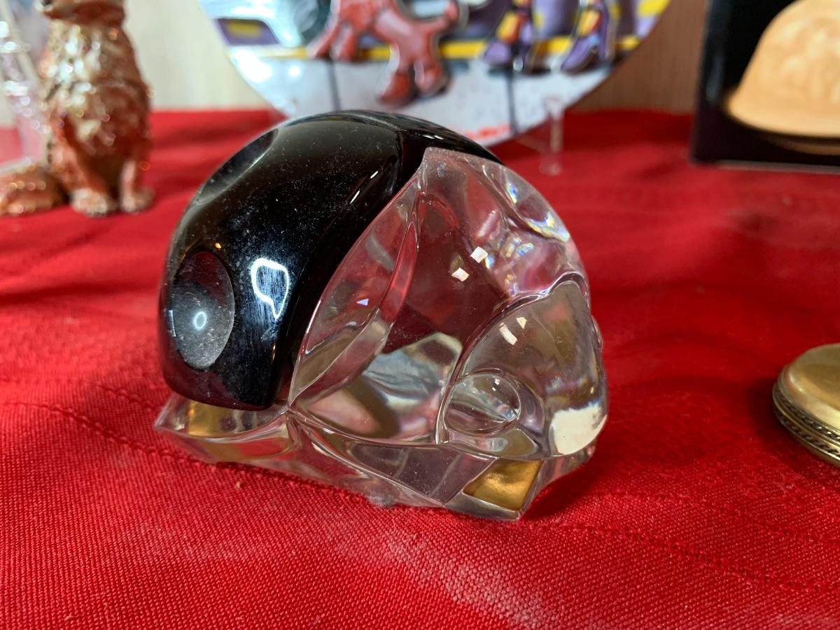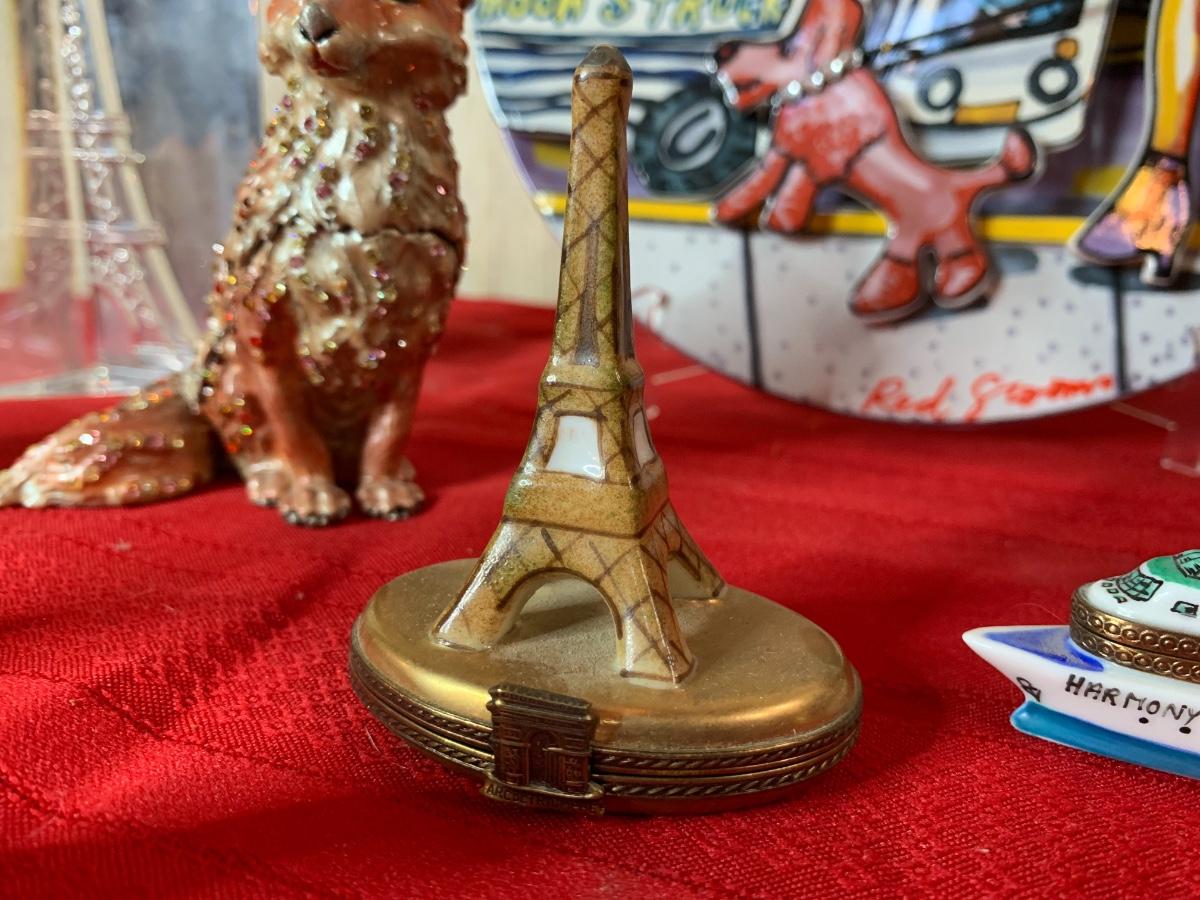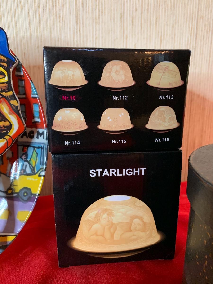 Misc decor pieces including 3 old hat boxes, one Red Grooms plate, two starlights and misc miniature trinkets