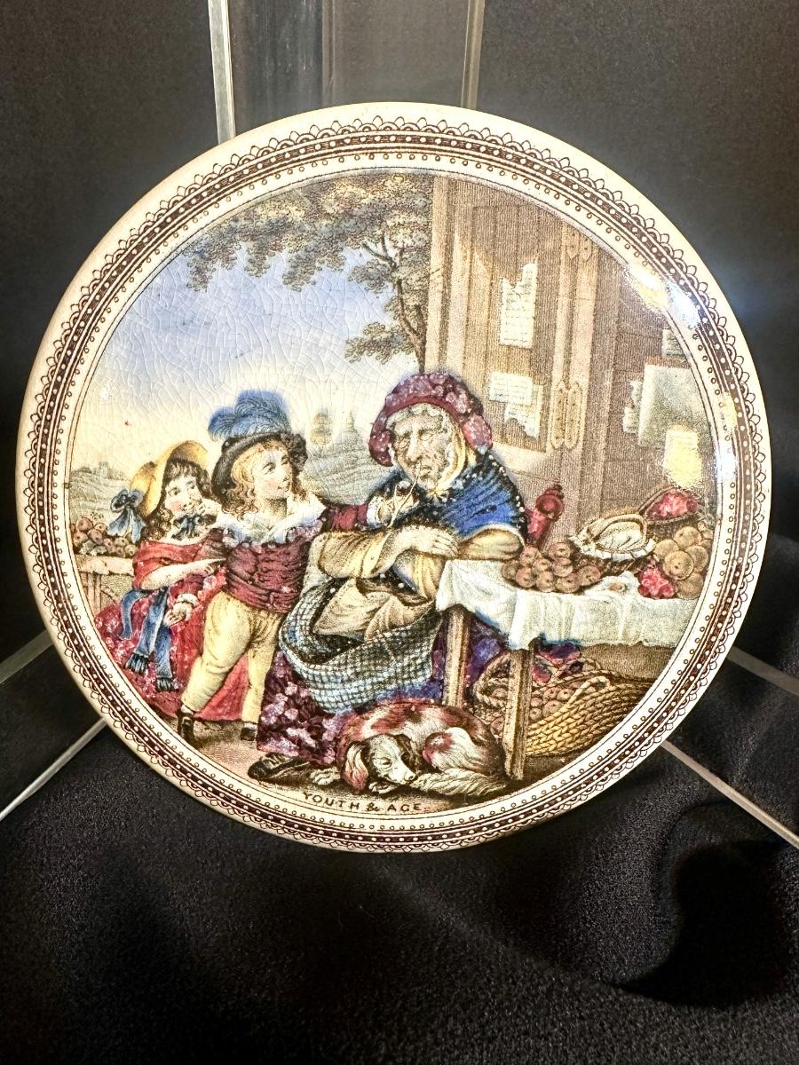 Youth and Age reproduction ceramic pot lid from the colored prints from the original plates engraved for the Jesse Austin Process from 1845-1870